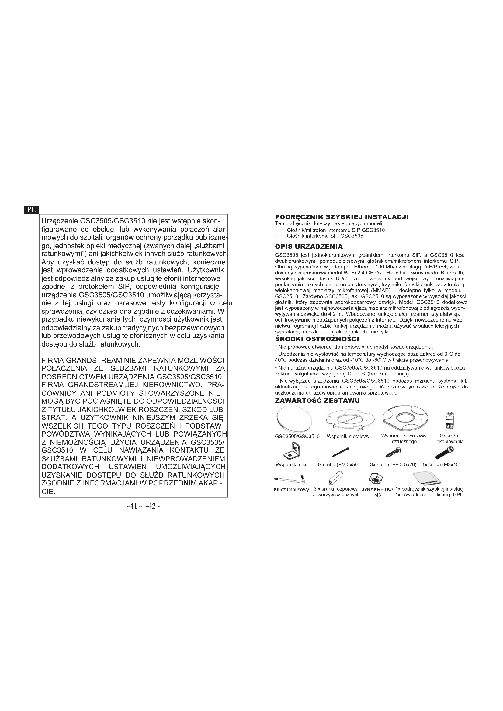 - Nie wyłączać urządzenia GSC3505/GSC3510 podczas rozruchu systemu lub aktualizacji oprogramowania sprzętowego. W przeciwnym razie może dojść do uszkodzenia obrazów oprogramowania sprzętowego. Urządzenie GSC3505/GSC3510 nie jest wstępnie skon- gurowane do obsługi lub wykonywania połączeń alar- mowych do szpitali, organów ochrony porządku publiczne- go, jednostek opieki medycznej (zwanych dalej „służbami ratunkowymi”) ani jakichkolwiek innych służb ratunkowych. Aby uzyskać dostęp do służb ratunkowych, konieczne jest wprowadzenie dodatkowych ustawień. Użytkownik jest odpowiedzialny za zakup usług telefonii internetowej zgodnej z protokołem SIP, odpowiednią kongurację urządzenia GSC3505/GSC3510 umożliwiającą korzysta- nie z tej usługi oraz okresowe testy konguracji w celu sprawdzenia, czy działa ona zgodnie z oczekiwaniami. W przypadku niewykonania tych czynności użytkownik jest odpowiedzialny za zakup tradycyjnych bezprzewodowych lub przewodowych usług telefonicznych w celu uzyskania dostępu do służb ratunkowych. FIRMA GRANDSTREAM NIE ZAPEWNIA MOŻLIWOŚCI POŁĄCZENIA ZE SŁUŻBAMI RATUNKOWYMI ZA POŚREDNICTWEM URZĄDZENIA GSC3505/GSC3510.