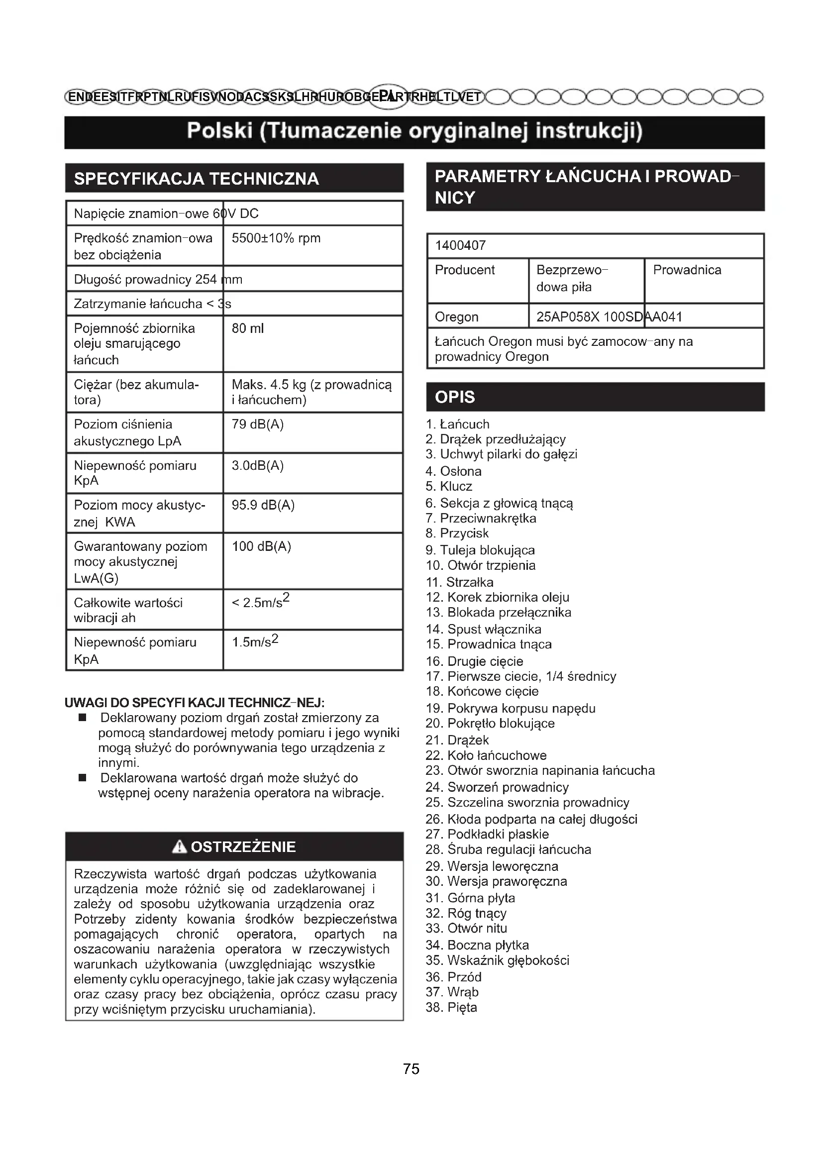 UWAGI DO SPECYFI KACJI TECHNICZ-NEJ: Deklarowany poziom drgań został zmierzony za pomocą standardowej metody pomiaru i jego wyniki mogą służyć do porównywania tego urządzenia z innymi. Deklarowana wartość drgań może służyć do wstępnej oceny narażenia operatora na wibracje. OSTRZEŻENIE Rzeczywista wartość drgań podczas użytkowania urządzenia może różnić się od zadeklarowanej i zależy od sposobu użytkowania urządzenia oraz Potrzeby zidenty kowania środków bezpieczeństwa pomagających chronić operatora, opartych na oszacowaniu narażenia operatora w rzeczywistych warunkach użytkowania (uwzględniając wszystkie elementy cyklu operacyjnego, takie jak czasy wyłączenia oraz czasy pracy bez obciążenia, oprócz czasu pracy przy wciśniętym przycisku uruchamiania).
