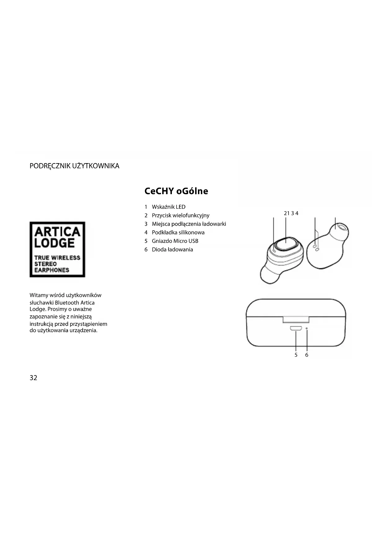 Witamy wśród użytkowników słuchawki Bluetooth Artica Lodge. Prosimy o uważne zapoznanie się z niniejszą instrukcją przed przystąpieniem do użytkowania urządzenia. CeCHY oGólne Wskaźnik LED Przycisk wielofunkcyjny Miejsca podłączenia ładowarki Podkładka silikonowa Gniazdo Micro USB Dioda ładowania