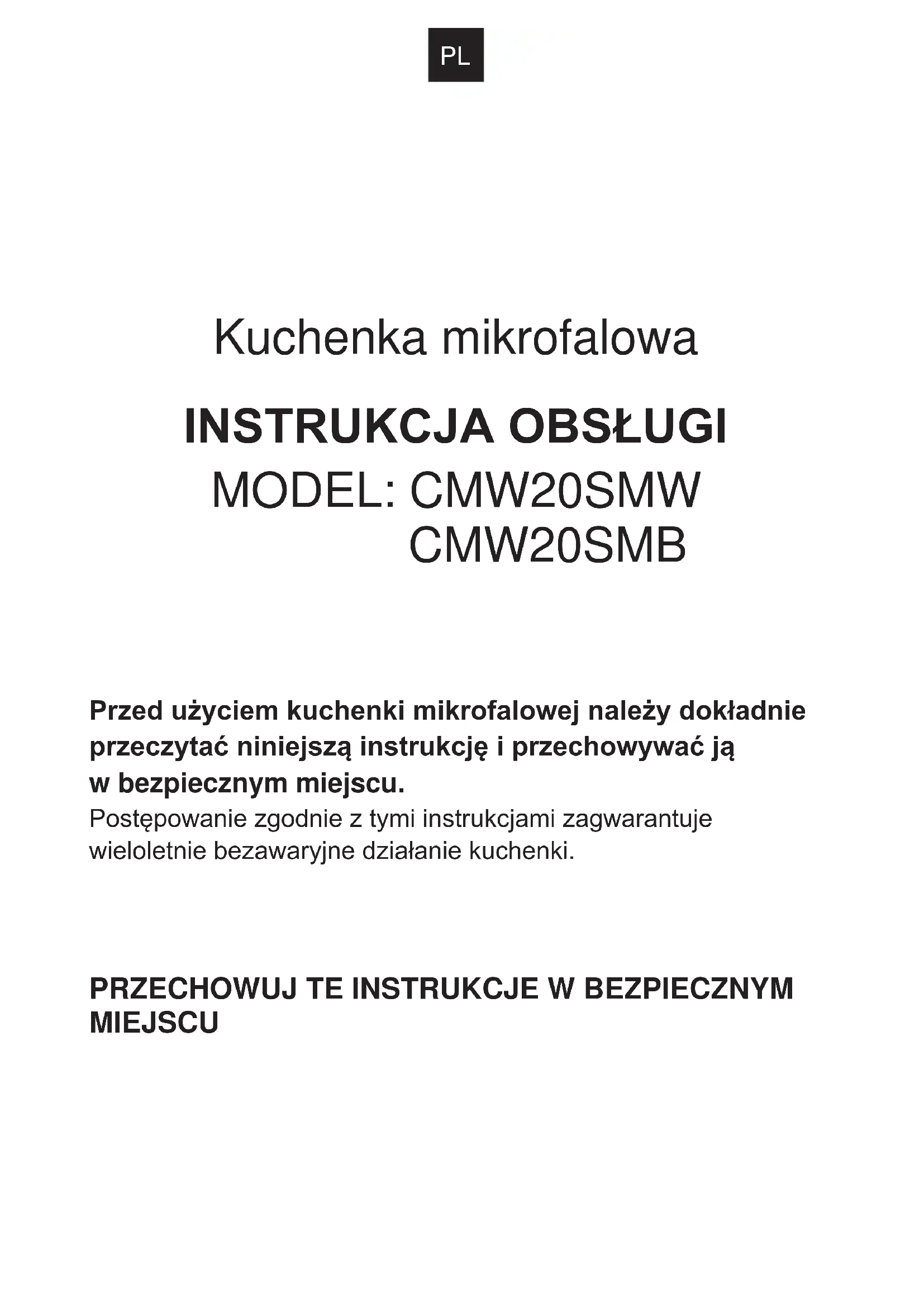 CMW20SMB Przed użyciem kuchenki mikrofalowej należy dokładnie przeczytać niniejszą instrukcję i przechowywać ją w bezpiecznym miejscu. Postępowanie zgodnie z tymi instrukcjami zagwarantuje wieloletnie bezawaryjne działanie kuchenki.