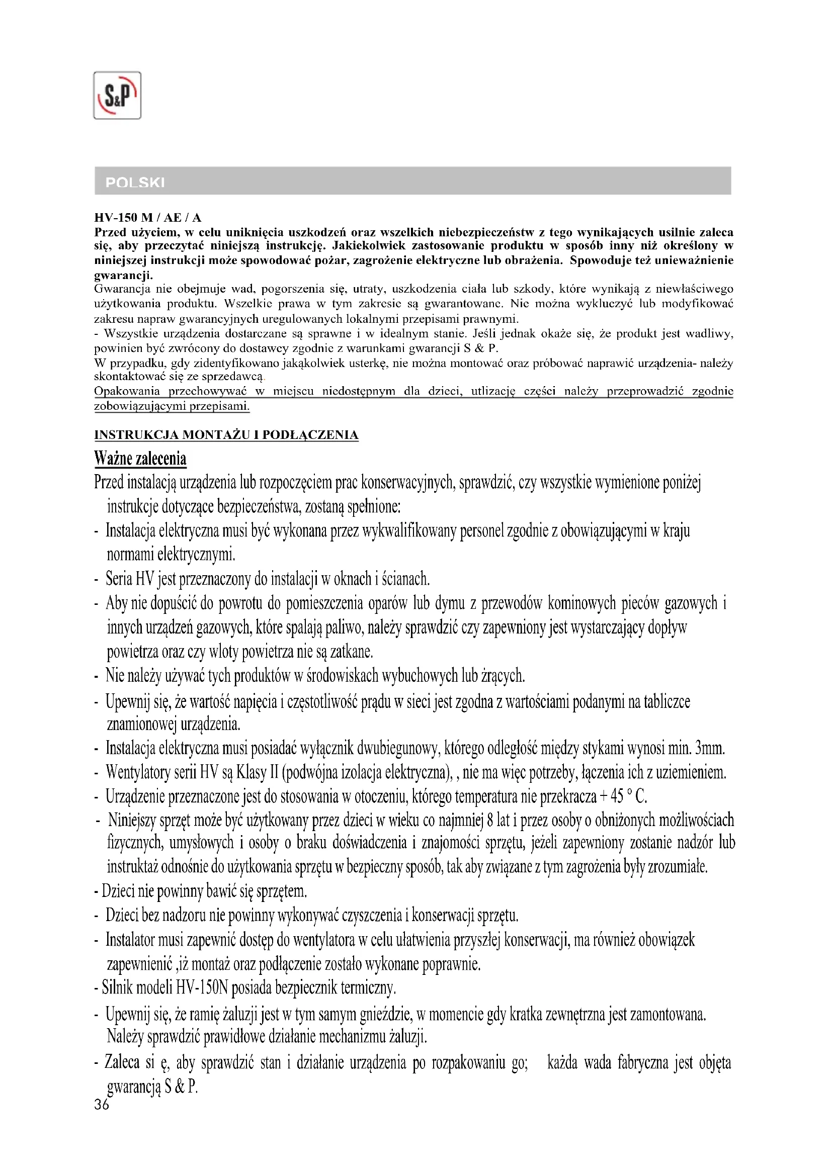 znamionowej urządzenia. - Instalacja elektryczna musi posiadać wyłącznik dwubiegunowy, którego odległość między stykami wynosi min. 3mm. - Wentylatory serii HV są Klasy II (podwójna izolacja elektryczna), , nie ma więc potrzeby, łączenia ich z uziemieniem. - Urządzenie przeznaczone jest do stosowania w otoczeniu, którego temperatura nie przekracza + 45 ° C. - /JOJFKT[ZTQS[ʒUNP˃FCZʉV˃ZULPXBOZQS[F[E[JFDJXXJFLVDPOBKNOJFKMBUJQS[F[PTPCZPPCOJ˃POZDINP˃MJXPʯDJBDI GJ[ZD[OZDI VNZTPXZDI J PTPCZ P CSBLV EPʯXJBED[FOJB J [OBKPNPʯDJ TQS[ʒUV KF˃FMJ [BQFXOJPOZ [PTUBOJF OBE[ØS MVC JOTUSVLUB˃PEOPʯOJFEPV˃ZULPXBOJBTQS[ʒUVXCF[QJFD[OZTQPTØCUBLBCZ[XJʇ[BOF[UZN[BHSP˃FOJBCZZ[SP[VNJBF - %[JFDJOJFQPXJOOZCBXJʉTJʒTQS[ʒUFN - %[JFDJCF[OBE[PSVOJFQPXJOOZXZLPOZXBʉD[ZT[D[FOJBJLPOTFSXBDKJTQS[ʒUV - Instalator musi zapewnić dostęp do wentylatora w celu ułatwienia przyszłej konserwacji, ma również obowiązek zapewnienić ,iż montaż oraz podłączenie zostało wykonane poprawnie. - Silnik modeli HV-150N posiada bezpiecznik termiczny. - Upewnij się, że ramię żaluzji jest w tym samym gnieździe, w momencie gdy kratka zewnętrzna jest zamontowana. Należy sprawdzić prawidłowe działanie mechanizmu żaluzji. - Zaleca si ę, aby sprawdzić stan i działanie urządzenia po rozpakowaniu go; każda wada fabryczna jest objęta gwarancją S & P.37 - Szyba o grubości 3 – 14mm wg Fig. 6a - Szyba o grubości 14 – 25mm wg Fig. 6b - Dokręcając śruby zwróć uwagę aby nie ścisnąć gumowch łączników między płytą i kratką zewnętrzną. Upewnij się że szyba nie ma bezpośredniego kontaktu z plastikową ramką. Fig.7.- Wykonaj odpowieni otwór w uszczelce (i), przełuż przewód elektryczny przez zaisk (j) i podłącz go do skrzynki zaciskowej (k). Fig. 8.- Zamontuj obudowę wewnętrzną (a) zakładając prostokątne otwory (1) w górnej częći obudowy (a) na zaczepy (m) w płycie (f) tak aby przyciski (c) znalazły się w prawidłowej pozycji. Fig. 9.- Dokręć wkręt mocujący (b). Montaż w ścianie (grubość ściany od 25 - 300mm) ( Upewnij się, czy gwintowane dławniki wraz z wydłużonym prętem mocującym (h) są dostarczone w zestawie) - Wytnij w ścianie otwór o wymiarach zaznaczonych na figure B. Zaleca się, aby były one wykonane przynajmniej 1,5m nad podłogą. - Zmierz grubość ściany i przygotuj gwitnowane pręty (n) o 5mm krótsze niż grubość ściany. - Użyj przyrządu do zaznaczenia na ścianie pozycji otworów w płycie głównej (f) wentylatora, wywierć w ścianie otwory i włóż w nie wkładki. - Wentylator HV należy rozkręcić zgodnie z poniższą instrukcją : Fig.10.- Odkręć wkręt (b) mocujący wewnętrzną obudowę (a). Fig.11.- Zdejmij obudowę wewnętrzną (a) naciskając przysicki (c). Fig.12.- Odkręć trzy śruby (d) mocujące kratkę zewnętrzną (e) i zdejmij ją z płyty głównej (f) wentylatora. - Zamontuj HV na ścianie, jak wskazano poniżej: Fig.13.- Odwróć kratkę zewnętrzną w twoim kierunku i przekręć gumki montażowe (g) na śrubach (h) w kierunku środkowej części żaluzji. Fig.14.- Zamocuj pręty gwintowane (n) do śrub (h) w kratce zewnętrznej (e) używając załączonych nakrętek (p) i załóż na pręty gumki montażowe (g). Fig.15.- Włóż od zewnątrz kratkę (e) w otwór w ścianie. Od wewnątrz, Przesuń gumki montażowe (g) tak aby przylegały do ściany i przekręć je tak aby zablokowały kratkę (e) w prawidłowej pozycji. Fig.16.- Zamocuj płytę główną wentylatora ( f) na prętach gwintowanych (n) wystających z kratki zewnętrznej (e) i wkręć śruby (d) w zależności od długości prętów wystających z płyty. Fig.17.- Zamocuj płytę główną wentylatora (f) do ściany i dokręć śruby(d). Fig.18.- W zależności od miejsca w którym zostaną doprowadzone przewody elektryczne zrób otwór w uszczelce (i) w obudowie wewnętrznej (a) lub w uszczelce (p) umieszczonej w płycie (f), przeprowadź przewód elektryczny pprzez zacisk (j) i podłącz do skrzynki zaciskowej (k). Fig.19.- Zamontuj obudowę wewnętrzną (a) zakładając prostokątne otwory (1) w górnej częći obudowy (a) na zaczepy (m) w pł ycie (f) tak aby przyciski (c) znalazły się w prawidłowej pozycji. Fig.20.- Dokręć wkręt mocujący (b). Podłączenie elektryczne - Przed przystąpieniem do podłączania elektrycznego, upewnij się że wentylator odłączony jest od zasilania. Upewnij się również, czy wirnik obraca się swobodnie oraz czy nie ma żadnych przeszkód na wlocie lub wylocie wentylatora. - Sprawdź czy wartości napięcia i częstotliwości sieci zasilającej są identyczne jak odpowiednie wartości podane na tabliczce znamionowej. - Podłączenie elektryczne modelu HV-150 M : zgodnie ze schematem figure C. Montaż na szklanych oknach (grubość szyby od 325 mm) - Można zidentyfikować wszystkie elementy urządzenia na rysunku A, a na na rysunku B, także środki niezbędne do jego prawidłowej instalacji - Wytnij dziurę o wymairach zaznaczonych figure B. Zaleca się, aby były one wykonane przynajmniej 1,5m nad podłogą. - Wentylator HV należy rozkręcić zgodnie z poniższą instrukcją : Fig.1.- Odkręć wkręt (b) mocujący wewnętrzną obudowę (a). Fig.2.- Zdejmij obudowę wewnętrzną (a) naciskając przysicki (c). Fig.3.- Odkręć trzy śruby (d) mocujące kratkę zewnętrzną (e) i zdejmij ją z płyty głównej (f) wentylatora. - Zamontuj HV na szybie, jak wskazano poniżej: Fig.4- Odwróc kratkę zewnętrzną w twoim kierunku i przekręć gumki montażowe (g) na śrubach (h) w kierunku środkowej części żaluzji. Fig.5.- Włóż od zewnątrz kratkę (e) w otwór w szybie. Przesuń od od wewnątrz gumki montażowe (g) tak aby zablokowały kratkę (e) w prawidłowej pozycji w ścianie. Fig.6- Zamocuj płytę główną wentylatora (f) na śrubach (h) wystających z kratki zewnętrznej (e) i dokręć śruby (d) w zależności od grubości szyby :38 x Model HV-150 AE 2 tryby pracy Tryb 1