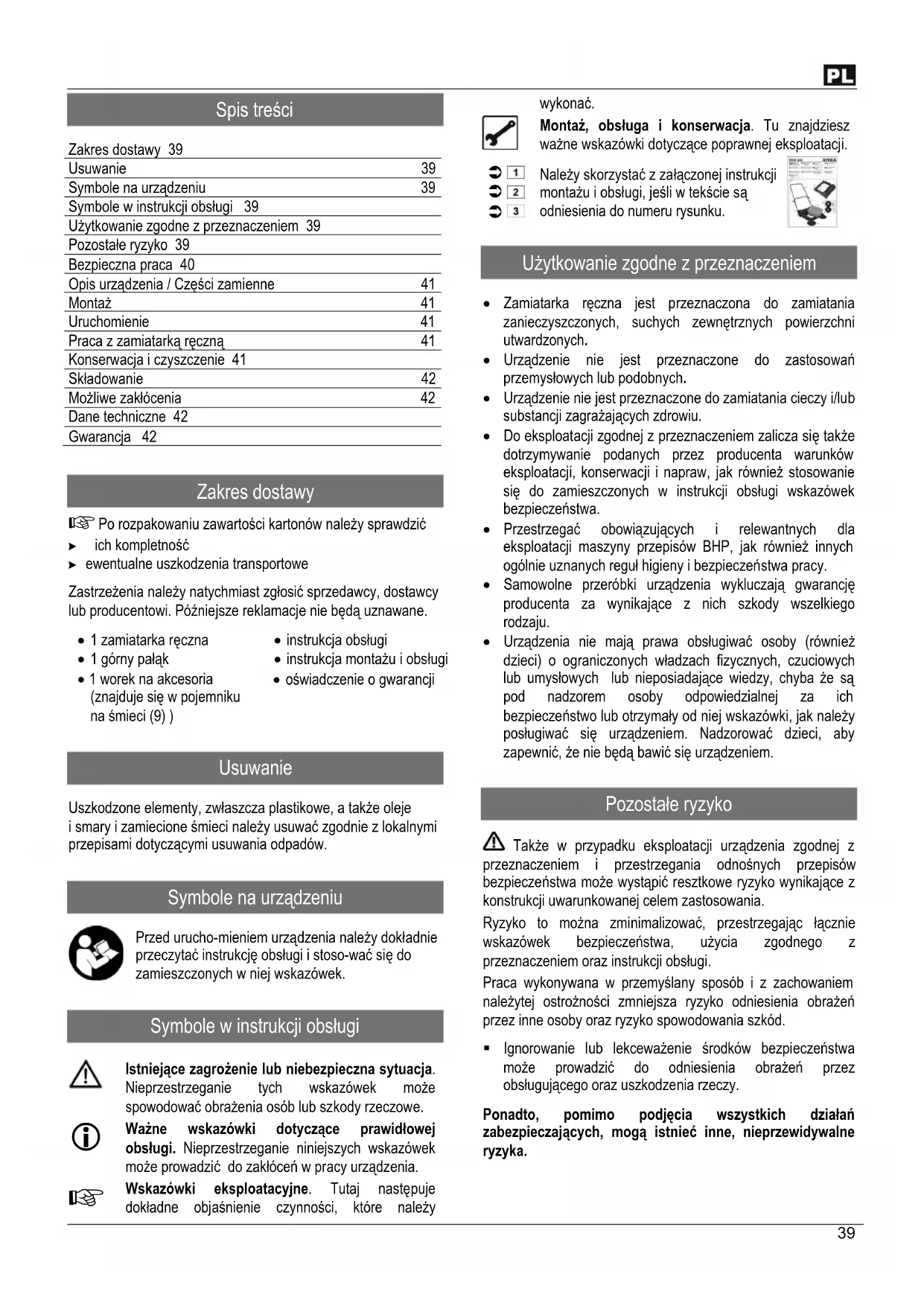 Garantie Houdt u alstublieft rekening met de ingesloten garantieverklaring.39 Spis treści Zakres dostawy 39 Usuwanie 39 Symbole na urządzeniu 39 Symbole w instrukcji obsługi 39 Użytkowanie zgodne z przeznaczeniem 39 Pozostałe ryzyko 39 Bezpieczna praca 40 Opis urządzenia / Części zamienne 41 Montaż 41 Uruchomienie 41 Praca z zamiatarką ręczną 41 Konserwacja i czyszczenie 41 Składowanie 42 Możliwe zakłócenia 42 Dane techniczne 42 Gwarancja 42