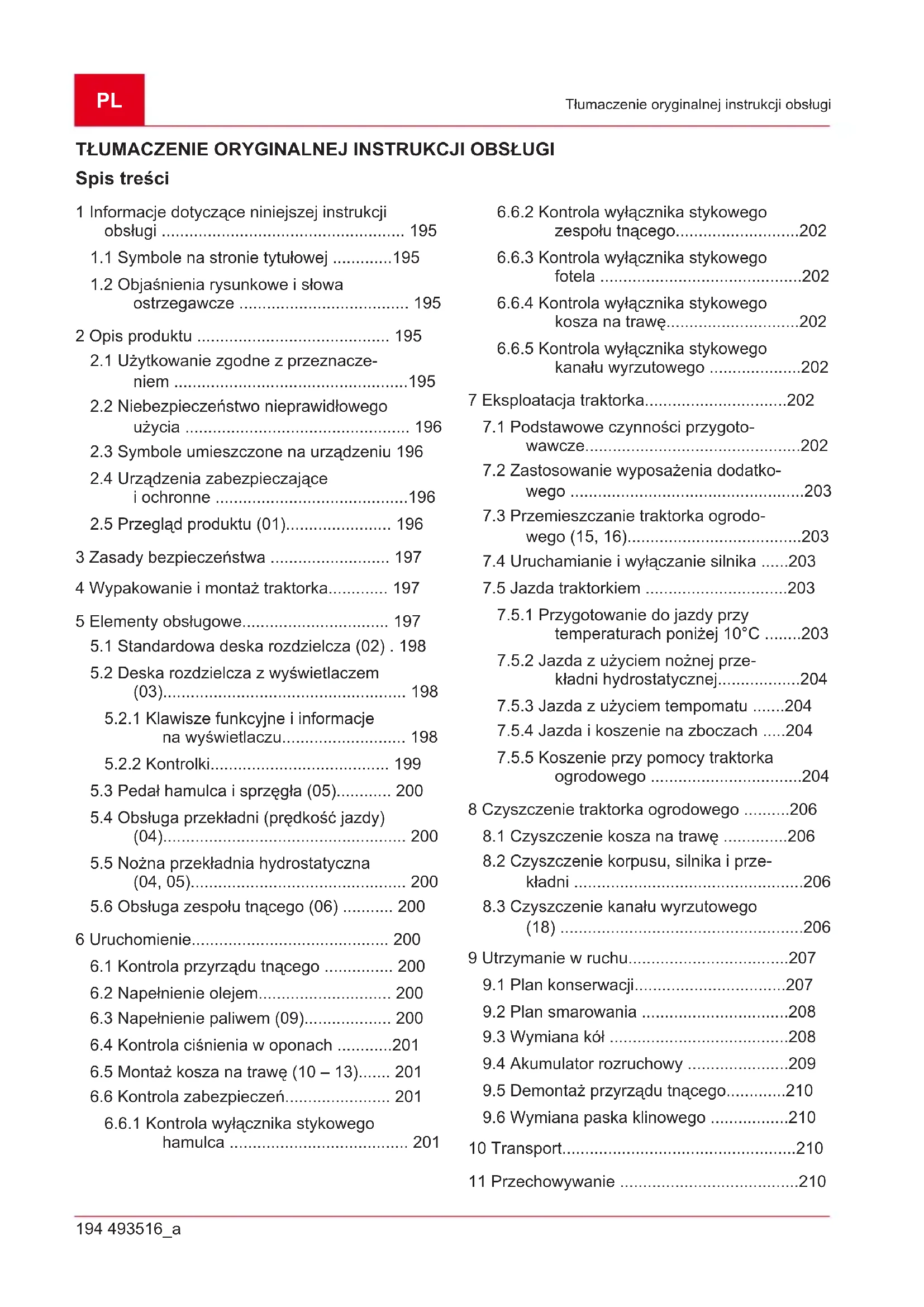 10 Transport...................................................210 11 Przechowywanie .......................................210493516_a 195 Informacje dotyczące niniejszej instrukcji obsługi 12 Pomoc wprzypadku usterek.................... 210