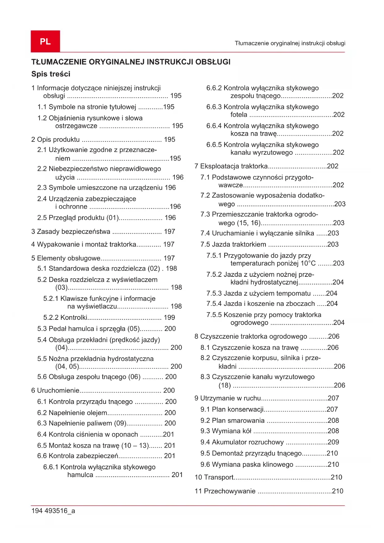 10 Transport...................................................210 11 Przechowywanie .......................................210493516_a 195 Informacje dotyczące niniejszej instrukcji obsługi 12 Pomoc wprzypadku usterek.................... 210