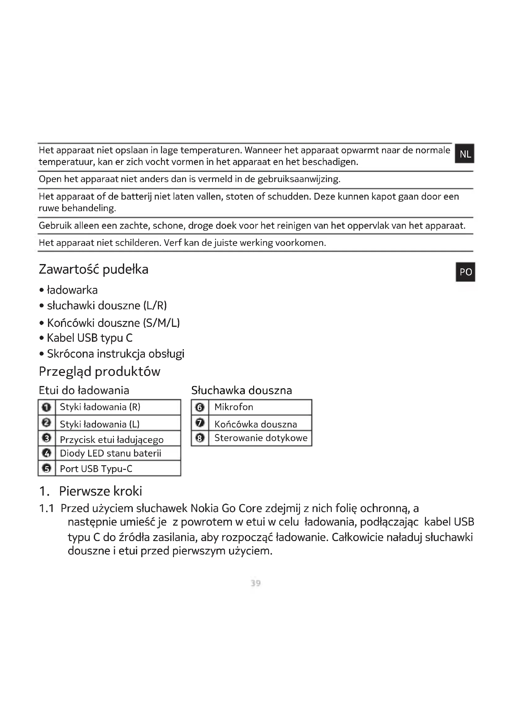 зніміть захисну плівку з навушників та помістіть навушники назад в зарядний чохол, потім підключіть кабель для зарядки з роз'ємом USB Type-C до джерела електроживлення для початку зарядки, повністю зарядіть навушники та зарядний чохол перед першим використанням. Chroń słuch Aby zapobiec uszkodzeniu słuchu, nie należy słuchać dźwięku o dużym natężeniu przez długi czas. Słuch Ostrzeżenie: podczas korzystania z zestawu słuchawkowego zdolność usłyszenia dźwięków dobiegających z otoczenia może być ograniczona. Nie używać zestawu słuchawkowego, jeżeli może to negatywnie wpływać na bezpieczeństwo użytkownika. Małe dzieci Urządzenie i akcesoria nie są zabawkami. Mogą zawierać małe elementy. Przechowywać w miejscu niedostępnym dla małych dzieci. Dbaj o urządzenie Zachować ostrożność podczas użytkowania urządzenia. Poniższe sugestie pomogą zachować sprawność urządzenia. Urządzenie musi być suche. Opady atmosferyczne, wilgoć i różne rodzaje płynów i wilgoci mogą zawierać minerały powodujące korozję obwodów elektrycznych. Nie używać, ani nie przechowywać urządzenia w miejscach zapylonych lub brudnych. Nie przechowywać urządzenia w wysokiej temperaturze. Wysoka temperatura może uszkodzić urządzenie lub baterię. Nie przechowywać urządzenia w niskiej temperaturze. Ogrzanie urządzenia do zwykłej temperatury może spowodować pojawienie się wilgoci wewnątrz urządzenia, co może być źródłem uszkodzeń. Nie otwierać urządzenia w sposób inny niż wskazany w instrukcji obsługi. Nie rzucać, nie uderzać ani nie potrząsać urządzeniem ani baterią. Brak ostrożności może doprowadzić do awarii urządzenia. Do czyszczenia powierzchni urządzenia używać wyłącznie miękkiej, czystej, suchej szmatki. Nie malować urządzenia. Farba może uniemożliwiać prawidłowe działanie.