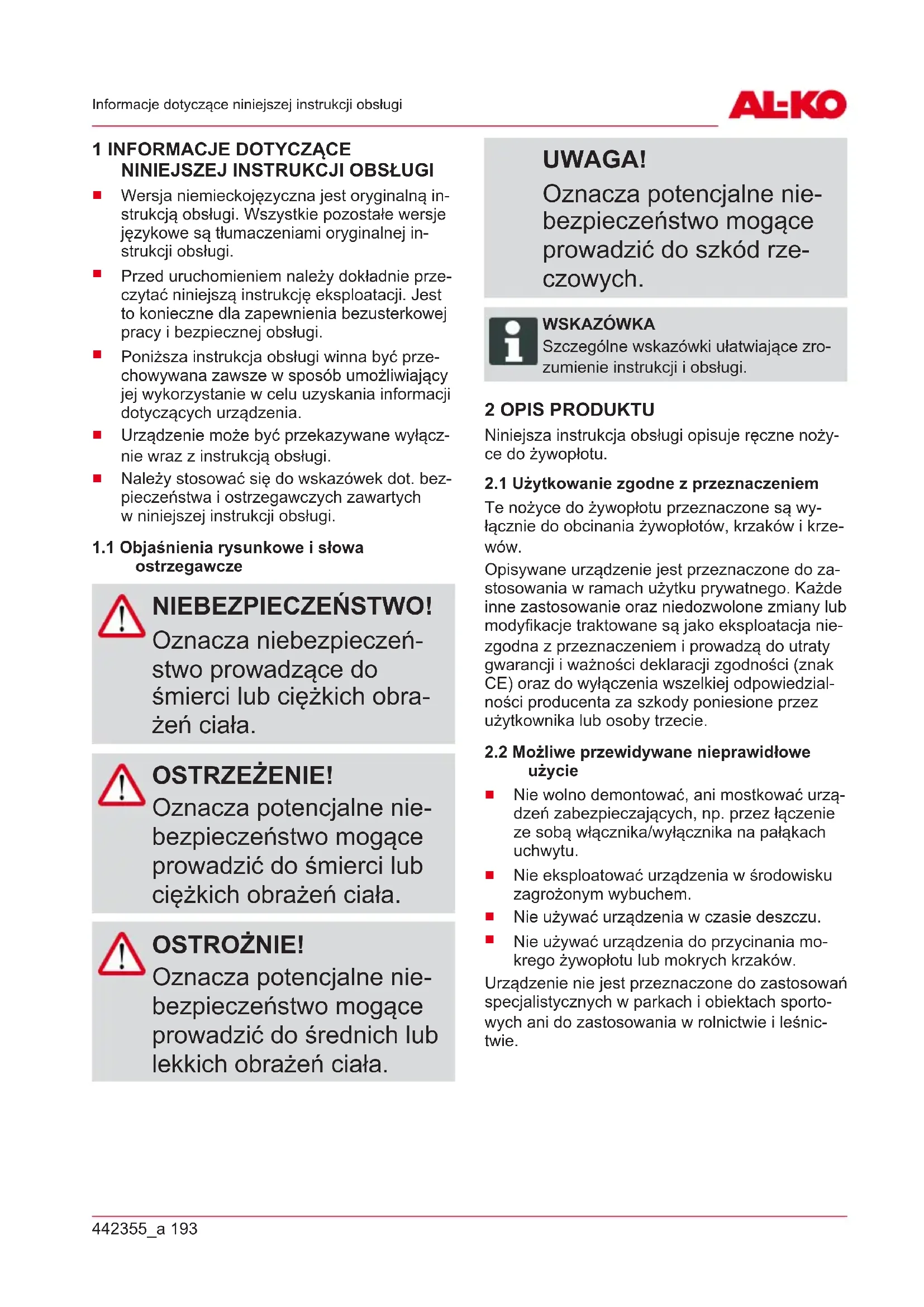 ostrzegawcze NIEBEZPIECZEŃSTWO! Oznacza niebezpieczeń- stwo prowadzące do śmierci lub ciężkich obra- żeń ciała. OSTRZEŻENIE! Oznacza potencjalne nie- bezpieczeństwo mogące prowadzić do śmierci lub ciężkich obrażeń ciała. OSTROŻNIE! Oznacza potencjalne nie- bezpieczeństwo mogące prowadzić do średnich lub lekkich obrażeń ciała. UWAGA! Oznacza potencjalne nie- bezpieczeństwo mogące prowadzić do szkód rze- czowych. WSKAZÓWKA Szczególne wskazówki ułatwiające zro- zumienie instrukcji iobsługi. 2 OPIS PRODUKTU Niniejsza instrukcja obsługi opisuje ręczne noży- ce do żywopłotu.