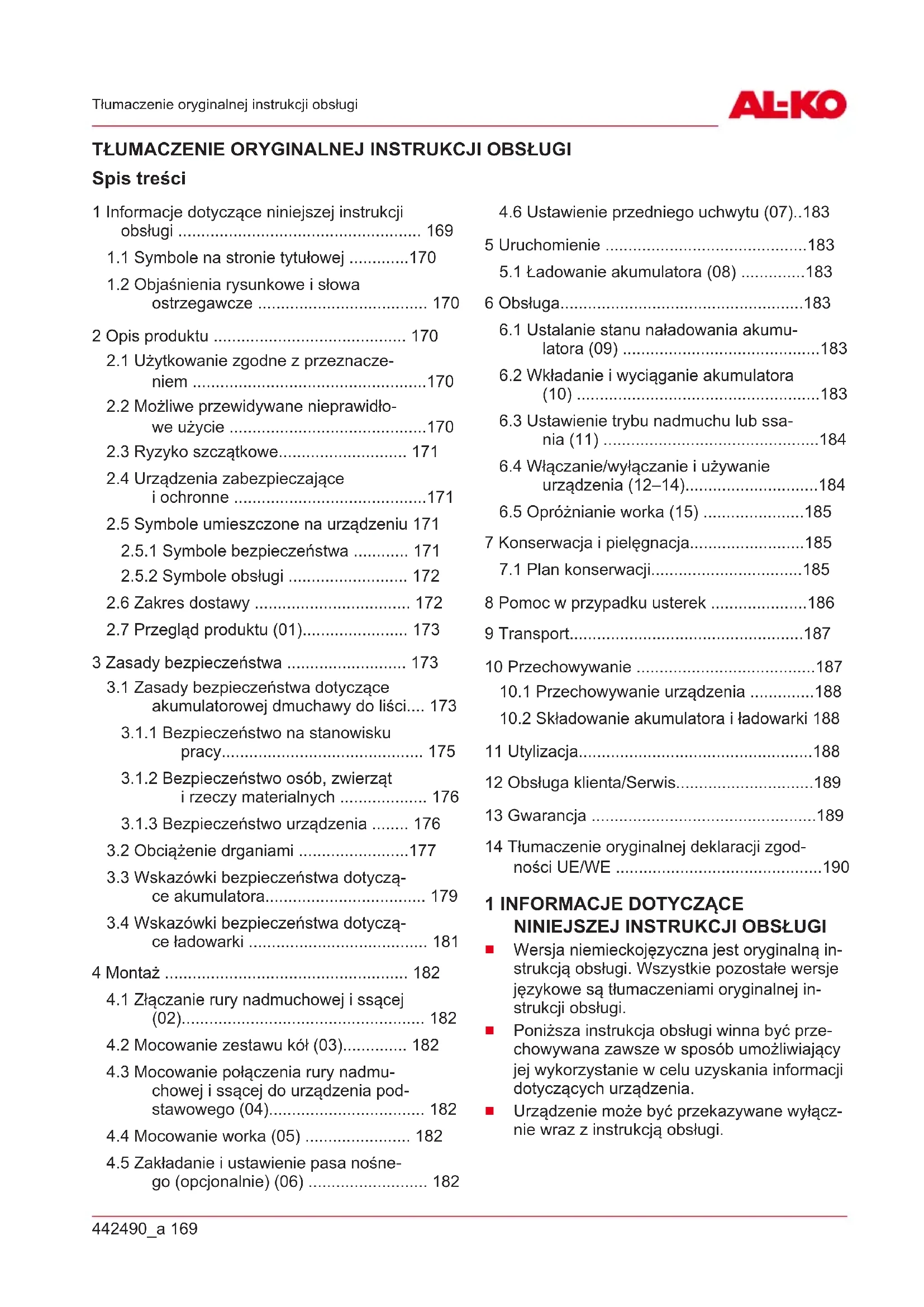 Tłumaczenie oryginalnej deklaracji zgodności UE/WE 14 TŁUMACZENIE ORYGINALNEJ DEKLARACJI ZGODNOŚCI UE/WE Niniejszym oświadczamy na własną odpowiedzialność, że produkt we wprowadzonej przez nas na ry- nek wersji spełnia wymagania zharmonizowanych dyrektyw UE, standardów bezpieczeństwa UE oraz standardów obowiązujących dla danego produktu. Produkt Akumulatorowa dmuchawa/ odkurzacz do liści Numer seryjny G2043012 Producent AL-KO Geräte GmbH Ichenhauser Str. 14 D-89359 Kötz Osoba sporządzająca dokumentację Andreas Hedrich Ichenhauser Str. 14 D-89359 Kötz Typ LBV4090 Poziom mocy akustycznej EN ISO 3744 zmierzony / gwarantowany 99,5dB(A) / 102dB(A) Dyrektywy UE 2006/42/WE 2014/30/UE 2000/14/WE 2011/65/UE Ocena zgodności 2000/14/WE Załącznik V Normy zharmonizowane EN 60335-1:2012 EN 50636-2-100:2014 EN 62233:2008 EN ISO 12100:2010 EN 55014-1:2006+A1:2009+A2:2011 EN 55014-2:2015 EN61000-3-2:2014 EN61000-3-3:2013 Kötz, 20.03.2018r. Dr. Wolfgang Hergeth Managing Director442490_a 191 Překlad originálního návodu kpoužití PŘEKLAD ORIGINÁLNÍHO NÁVODU KPOUŽITÍ Obsah 1 K tomuto návodu k použití ....................... 191