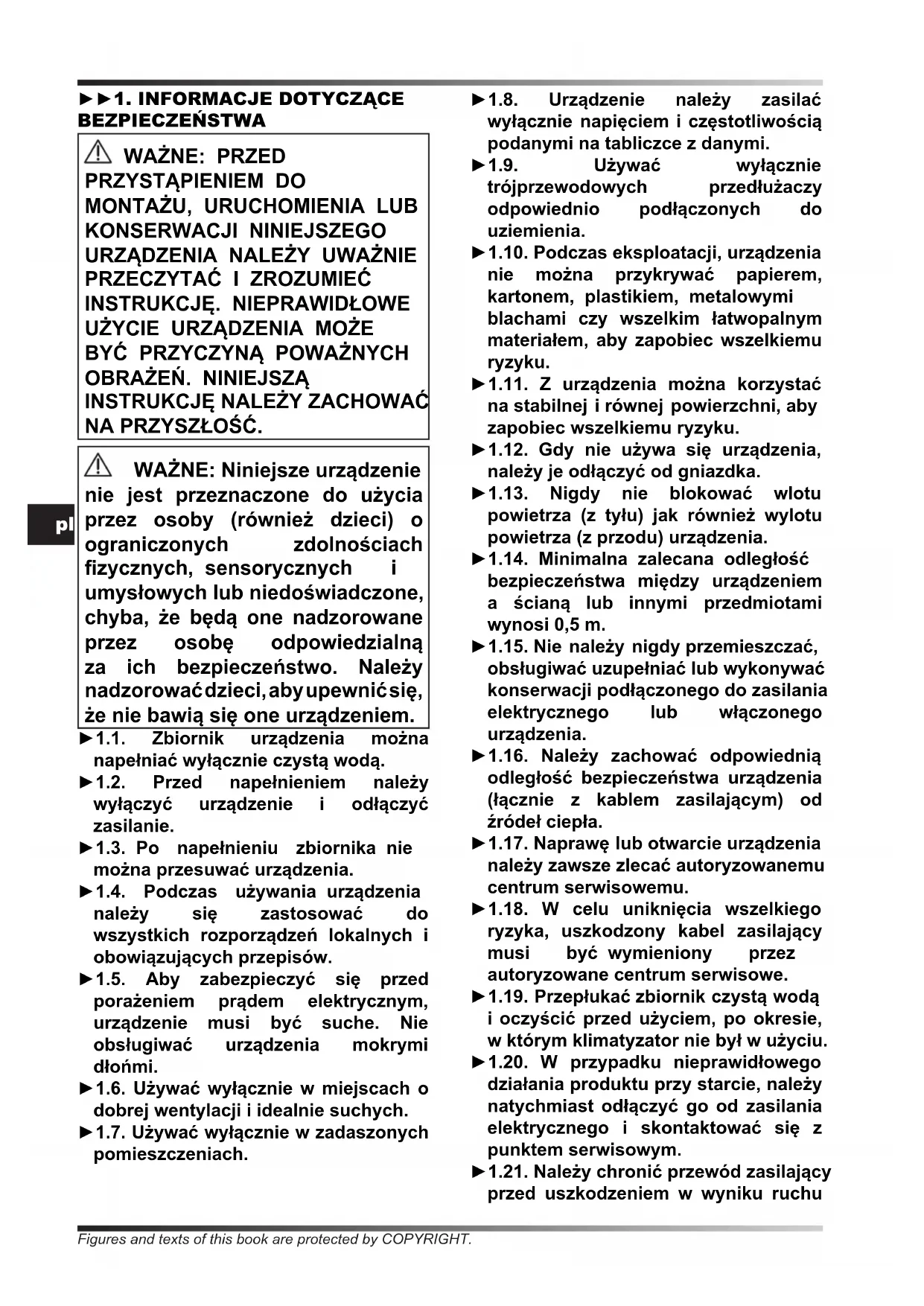 NA PRZYSZŁOŚĆ. WAŻNE: Niniejsze urządzenie nie jest przeznaczone do użycia przez osoby (również dzieci) o ograniczonych zdolnościach zycznych, sensorycznych i umysłowych lub niedoświadczone, chyba, że będą one nadzorowane przez osobę odpowiedzialną za ich bezpieczeństwo. Należy nadzorować dzieci, aby upewnić się, że nie bawią się one urządzeniem. ►1.1. Zbiornik urządzenia można napełniać wyłącznie czystą wodą. ►1.2. Przed napełnieniem należy wyłączyć urządzenie i odłączyć zasilanie. ►1.3. Po napełnieniu zbiornika nie można przesuwać urządzenia. ►1.4. Podczas używania urządzenia należy się zastosować do wszystkich rozporządzeń lokalnych i obowiązujących przepisów. ►1.5. Aby zabezpieczyć się przed porażeniem prądem elektrycznym, urządzenie musi być suche. Nie obsługiwać urządzenia mokrymi dłońmi. ►1.6. Używać wyłącznie w miejscach o dobrej wentylacji i idealnie suchych. ►1.7. Używać wyłącznie w zadaszonych pomieszczeniach. ►1.8. Urządzenie należy zasilać wyłącznie napięciem i częstotliwością podanymi na tabliczce z danymi. ►1.9. Używać wyłącznie trójprzewodowych przedłużaczy odpowiednio podłączonych do uziemienia. ►1.10. Podczas eksploatacji, urządzenia nie można przykrywać papierem, kartonem, plastikiem, metalowymi blachami czy wszelkim łatwopalnym materiałem, aby zapobiec wszelkiemu ryzyku. ►1.11. Z urządzenia można korzystać na stabilnej i równej powierzchni, aby zapobiec wszelkiemu ryzyku. ►1.12. Gdy nie używa się urządzenia, należy je odłączyć od gniazdka. ►1.13. Nigdy nie blokować wlotu powietrza (z tyłu) jak również wylotu powietrza (z przodu) urządzenia. ►1.14. Minimalna zalecana odległość bezpieczeństwa między urządzeniem a ścianą lub innymi przedmiotami wynosi 0,5 m. ►1.15. Nie należy nigdy przemieszczać, obsługiwać uzupełniać lub wykonywać konserwacji podłączonego do zasilania elektrycznego lub włączonego urządzenia. ►1.16. Należy zachować odpowiednią odległość bezpieczeństwa urządzenia (łącznie z kablem zasilającym) od źródeł ciepła. ►1.17. Naprawę lub otwarcie urządzenia należy zawsze zlecać autoryzowanemu centrum serwisowemu. ►1.18. W celu uniknięcia wszelkiego ryzyka, uszkodzony kabel zasilający musi być wymieniony przez autoryzowane centrum serwisowe. ►1.19. Przepłukać zbiornik czystą wodą i oczyścić przed użyciem, po okresie, w którym klimatyzator nie był w użyciu. ►1.20. W przypadku nieprawidłowego działania produktu przy starcie, należy natychmiast odłączyć go od zasilania elektrycznego i skontaktować się z punktem serwisowym. ►1.21. Należy chronić przewód zasilający przed uszkodzeniem w wyniku ruchu Figures and texts of this book are protected by COPYRIGHT.pl pojazdów lub pieszych. Podłączenie do niewłaściwego napięcia elektrycznego lub nieprawidłowej instalacji, będzie powodować niebezpieczeństwo porażenia prądem. ►1.22. Warunki użytkowania: A) Temperatura powietrza: 18°C do 45°C; Temperatura wody: <45°C. B) Dopływ powietrza musi być wolny od kurzu, zanieczyszczeń lub powinno być zastosowane dodatkowe oczyszczanie. ►1.23. Woda używana do napełniania zbiornika klimatyzatora powinna po- chodzić z wodociągu. Jeśli pobieranie wody z wodociągu nie jest możliwe, wprowadzoną wodę należy poddać od- każaniu, zgodnie z europejską dyrekty- wą 98/83/WE. -Zaleca się stosowanie wody o twardo- ści mniejszej niż 15°f. -Zbiornik klimatyzatora należy okreso- wo opróżniać i odkażać, zależnie od użycia. -Powierzchnie wkładek należy okreso- wo sprawdzać i odkażać, zależnie od użycia. -Do odkażania należy stosować pro- dukty biobójcze zgodne z rozporządze- niem europejskim nr 582/2012. ►►2. ODPAKOWANIE ►2.1. Usunąć wszystkie materiały opakowania użyte do wysyłki urządzenia i zlikwidować je zgodnie z obowiązującymi przepisami. ►2.2. Wyjąć wszystkie elementy z opakowania. ►2.3. Sprawdzić ewentualne uszkodzenia powstałe na skutek transportowania. Jeżeli urządzenie jest uszkodzone, należy natychmiast poinformować sprzedawcę, u którego zostało ono kupione. ►►3. MONTAŻ Urządzenie wyposażono w kółka, aby ułatwić przemieszczanie. Zależnie od modelu, kółka mogą już być zainstalowane lub są do zainstalowania. Komponenty ze śrubami i nakrętkami niezbędne do montażu, znajdują się w opakowaniu (Rys. 1). ►►4. FUNKCJONOWANIE OSTRZEŻENIE: Przed włączeniem urządzenia należy dokładnie przeczytać ”INFORMACJE DOTYCZĄCE BEZPIECZEŃSTWA”. OSTRZEŻENIE: Aby uniknąć uszkodzenia lub innych nieprawidłowości należy używać wyłącznie czystej wody. OSTRZEŻENIE: Należy sprawdzić prawidłowe uziemienie Waszej instalacji elektrycznej. Podłączenie do sieci elektrycznej musi być zgodne z obowiązującymi przepisami krajowymi. Urządzenie należy zasilać wyłącznie napięciem i częstotliwością podanymi na tabliczce z danymi. UWAGA: Niniejsze modele można podłączyć do sieci wody, podłączając rurę do złączki (Rys. 10). ►►4.1. WŁĄCZENIE: ►4.1.1. Należy otworzyć drzwiczki zbiornika (Rys. 2). ►4.1.2. Napełnić zbiornik (Rys. 3), poziom wody musi mieścić między MIN i MAX skali na ściance urządzenia (Rys. 4), aby zapobiec ryzyku. ►4.1.3. Należy zamknąć drzwiczki zbiornika (Rys. 5). ►4.1.4. Podłączyć wtyczkę zasilania do sieci elektrycznej (Rys. 6). UWAGA: Po podłączeniu wtyczki zasilania do sieci elektrycznej na wyświetlaczu pojawi się przybliżona wartość temperatury pokojowej. ►4.1.5. Wcisnąć przycisk ON/OFF, aby włączyć urządzenie (Rys. 9). ►►4.2. PANEL STEROWANIA, UŻYTKOWANIE I FUNKCJE (Rys. 7-8): ►ON/OFF: Umożliwia włączenie lub wyłączenie urządzenia. ►SPEED: Umożliwia zwiększenie lub zmniejszenie prędkości wentylacji Figures and texts of this book are protected by COPYRIGHT.Figures and texts