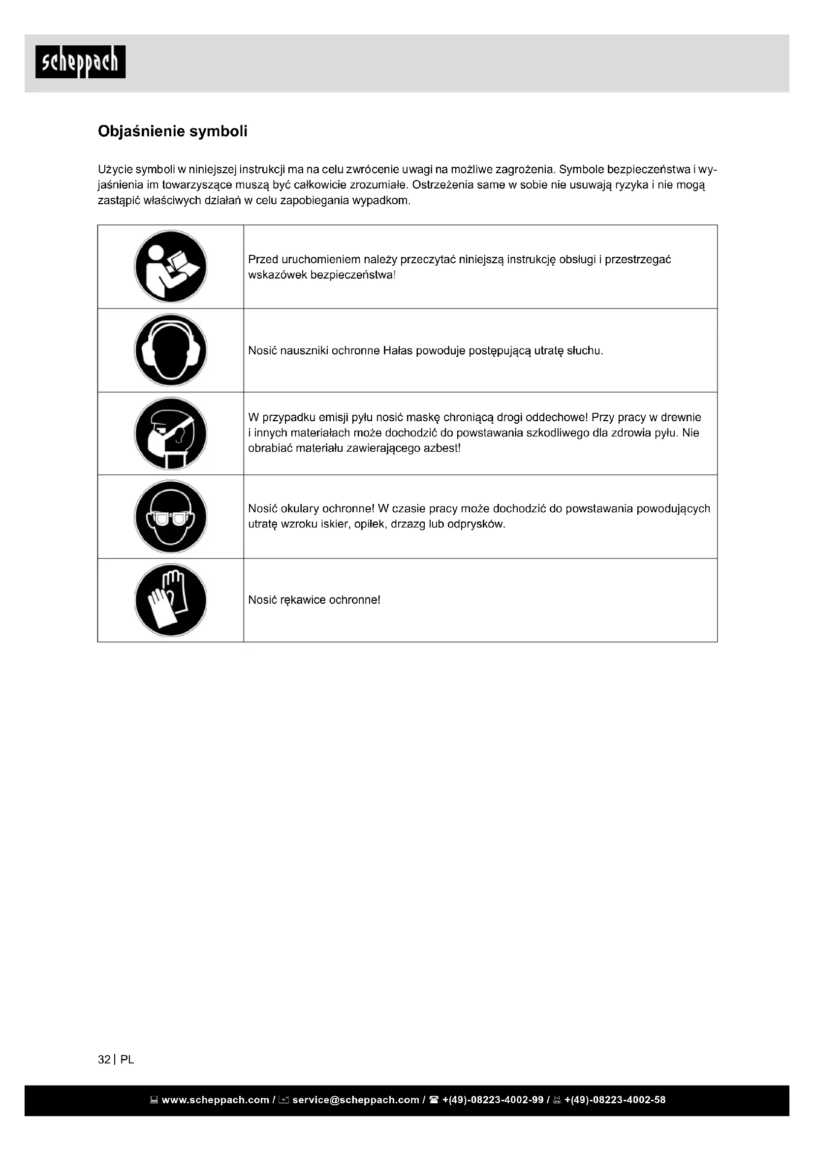 Objaśnienie symboli Użycie symboli w niniejszej instrukcji ma na celu zwrócenie uwagi na możliwe zagrożenia. Symbole bezpieczeństwa i wy- jaśnienia im towarzyszące muszą być całkowicie zrozumiałe. Ostrzeżenia same w sobie nie usuwają ryzyka i nie mogą zastąpić właściwych działań w celu zapobiegania wypadkom. Przed uruchomieniem należy przeczytać niniejszą instrukcję obsługi i przestrzegać wskazówek bezpieczeństwa! Nosić nauszniki ochronne Hałas powoduje postępującą utratę słuchu. W przypadku emisji pyłu nosić maskę chroniącą drogi oddechowe! Przy pracy w drewnie i innych materiałach może dochodzić do powstawania szkodliwego dla zdrowia pyłu. Nie obrabiać materiału zawierającego azbest! Nosić okulary ochronne! W czasie pracy może dochodzić do powstawania powodujących utratę wzroku iskier, opiłek, drzazg lub odprysków. Nosić rękawice ochronne! www.scheppach.com / service@scheppach.com / +(49)-08223-4002-99 / +(49)-08223-4002-58