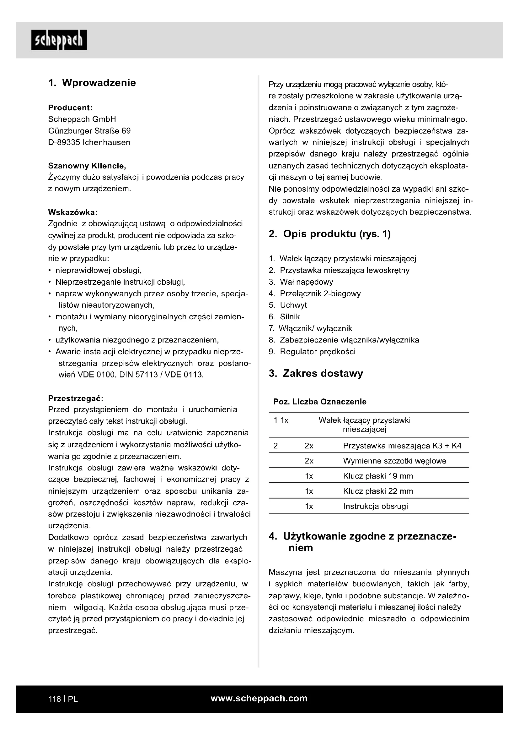 Producent: Scheppach GmbH Günzburger Straße 69 D-89335 Ichenhausen Szanowny Kliencie, Życzymy dużo satysfakcji i powodzenia podczas pracy z nowym urządzeniem. Wskazówka: Zgodnie z obowiązującą ustawą o odpowiedzialności cywilnej za produkt, producent nie odpowiada za szko- dy powstałe przy tym urządzeniu lub przez to urządze- nie w przypadku: