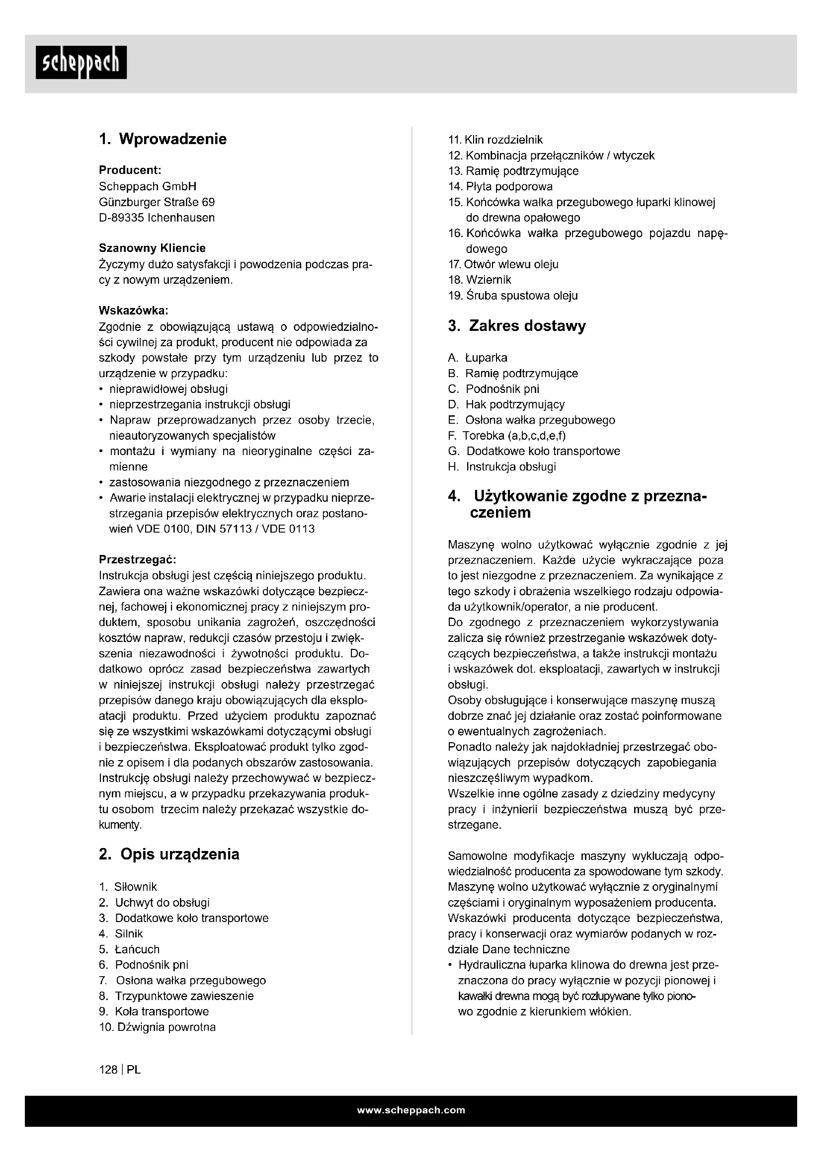 Producent: Scheppach GmbH Günzburger Straße 69 D-89335 Ichenhausen Szanowny Kliencie Życzymy dużo satysfakcji i powodzenia podczas pra- cy z nowym urządzeniem. Wskazówka: Zgodnie z obowiązującą ustawą o odpowiedzialno- ści cywilnej za produkt, producent nie odpowiada za szkody powstałe przy tym urządzeniu lub przez to urządzenie w przypadku: