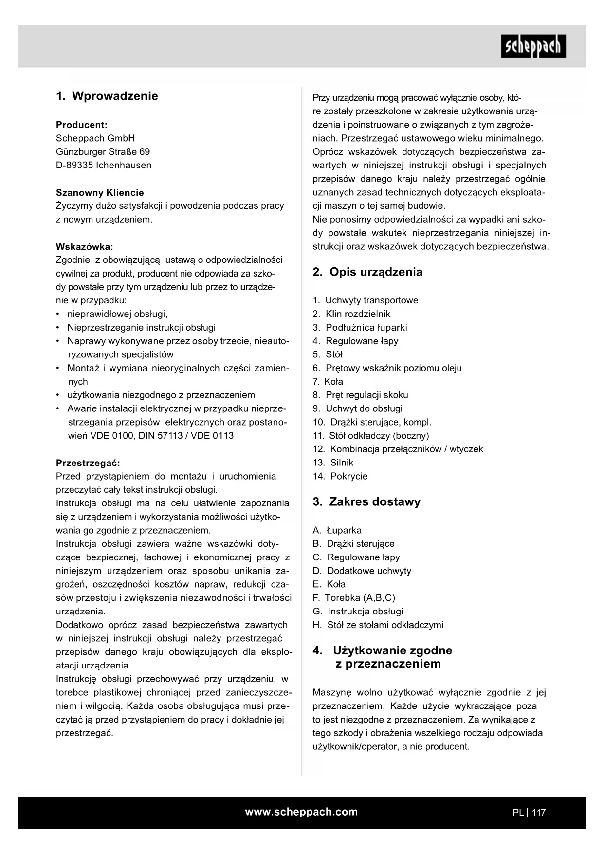 Producent: Scheppach GmbH Günzburger Straße 69 D-89335 Ichenhausen Szanowny Kliencie Życzymy dużo satysfakcji i powodzenia podczas pracy z nowym urządzeniem. Wskazówka: Zgodnie z obowiązującą ustawą o odpowiedzialności cywilnej za produkt, producent nie odpowiada za szko- dy powstałe przy tym urządzeniu lub przez to urządze- nie w przypadku: