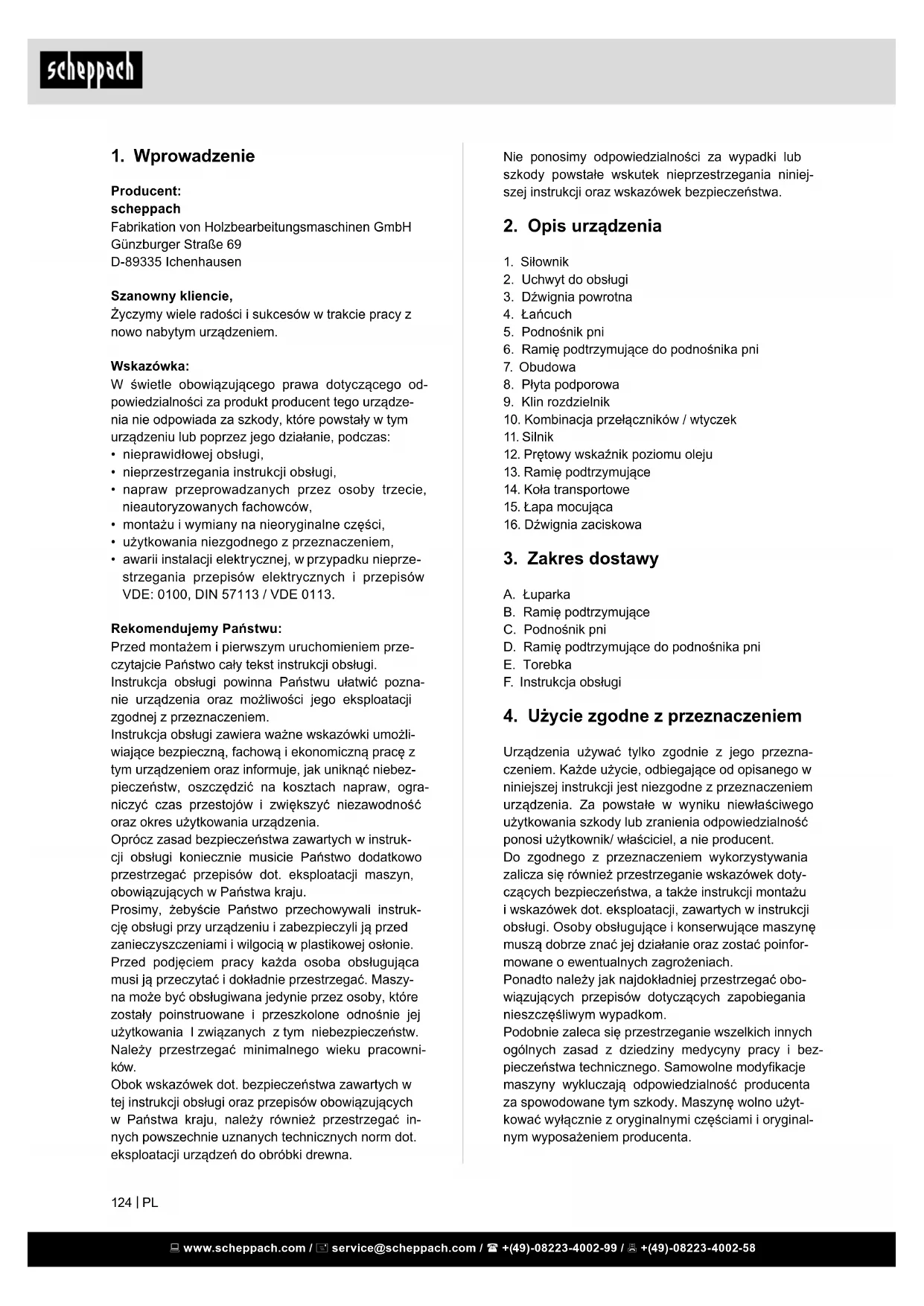 - awarii instalacji elektrycznej, w przypadku nieprze- strzegania przepisów elektrycznych i przepisów VDE: 0100, DIN 57113 / VDE 0113. Rekomendujemy Państwu: Przed montażem i pierwszym uruchomieniem prze- czytajcie Państwo cały tekst instrukcji obsługi. Instrukcja obsługi powinna Państwu ułatwić pozna- nie urządzenia oraz możliwości jego eksploatacji zgodnej z przeznaczeniem. Instrukcja obsługi zawiera ważne wskazówki umożli- wiające bezpieczną, fachową i ekonomiczną pracę z tym urządzeniem oraz informuje, jak uniknąć niebez- pieczeństw, oszczędzić na kosztach napraw, ogra- niczyć czas przestojów i zwiększyć niezawodność oraz okres użytkowania urządzenia. Oprócz zasad bezpieczeństwa zawartych w instruk- cji obsługi koniecznie musicie Państwo dodatkowo przestrzegać przepisów dot. eksploatacji maszyn, obowiązujących w Państwa kraju. Prosimy, żebyście Państwo przechowywali instruk- cję obsługi przy urządzeniu i zabezpieczyli ją przed zanieczyszczeniami i wilgocią w plastikowej osłonie. Przed podjęciem pracy każda osoba obsługująca musi ją przeczytać i dokładnie przestrzegać. Maszy- na może być obsługiwana jedynie przez osoby, które zostały poinstruowane i przeszkolone odnośnie jej użytkowania I związanych z tym niebezpieczeństw. Należy przestrzegać minimalnego wieku pracowni- ków. Obok wskazówek dot. bezpieczeństwa zawartych w tej instrukcji obsługi oraz przepisów obowiązujących w Państwa kraju, należy również przestrzegać in- nych powszechnie uznanych technicznych norm dot. eksploatacji urządzeń do obróbki drewna. www.scheppach.com / service@scheppach.com / +(49)-08223-4002-99 / +(49)-08223-4002-58