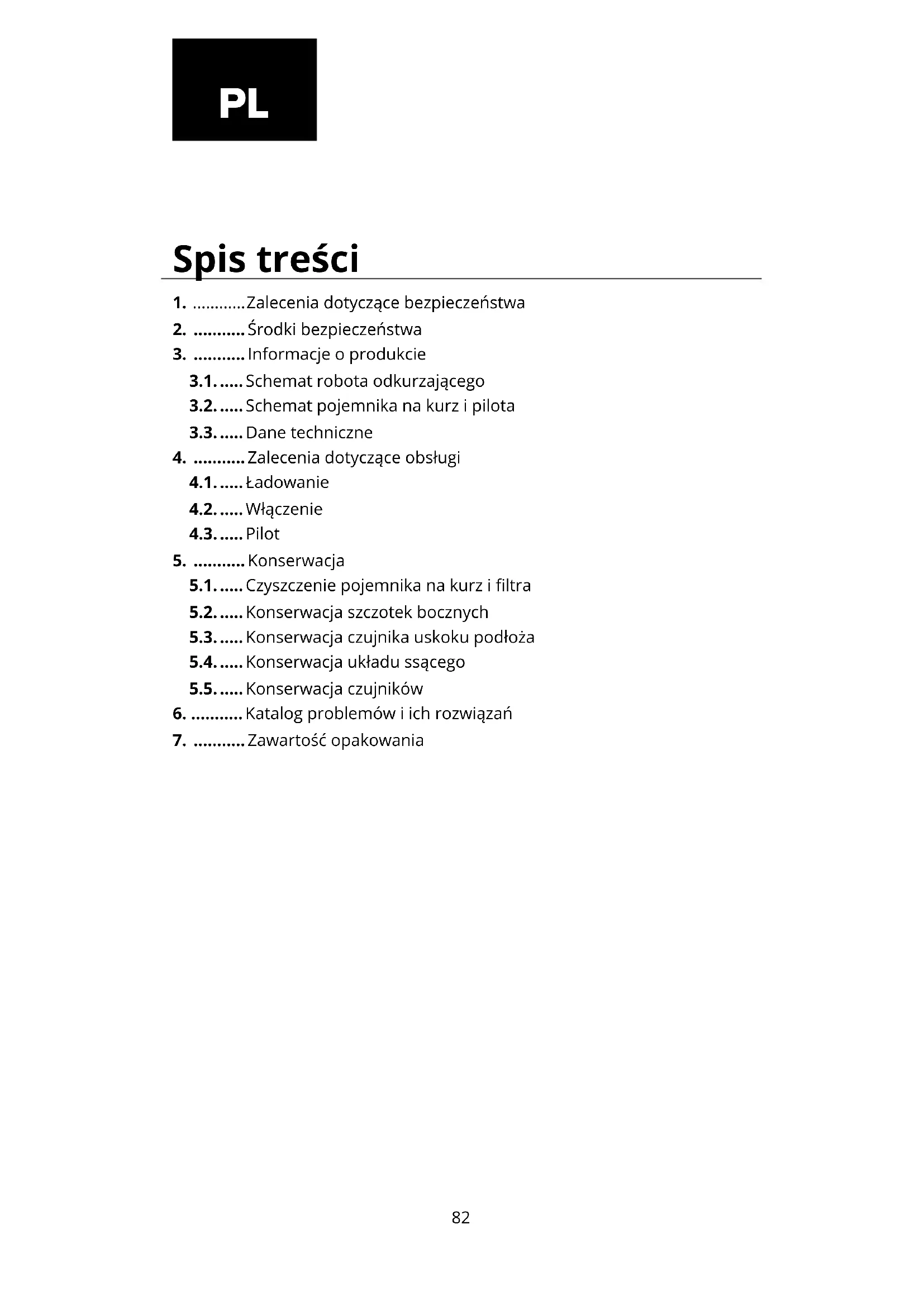5.1. ..... Czyszczenie pojemnika na kurz i ltra 5.2. ..... Konserwacja szczotek bocznych 5.3. ..... Konserwacja czujnika uskoku podłoża 5.4. ..... Konserwacja układu ssącego 5.5. ..... Konserwacja czujników