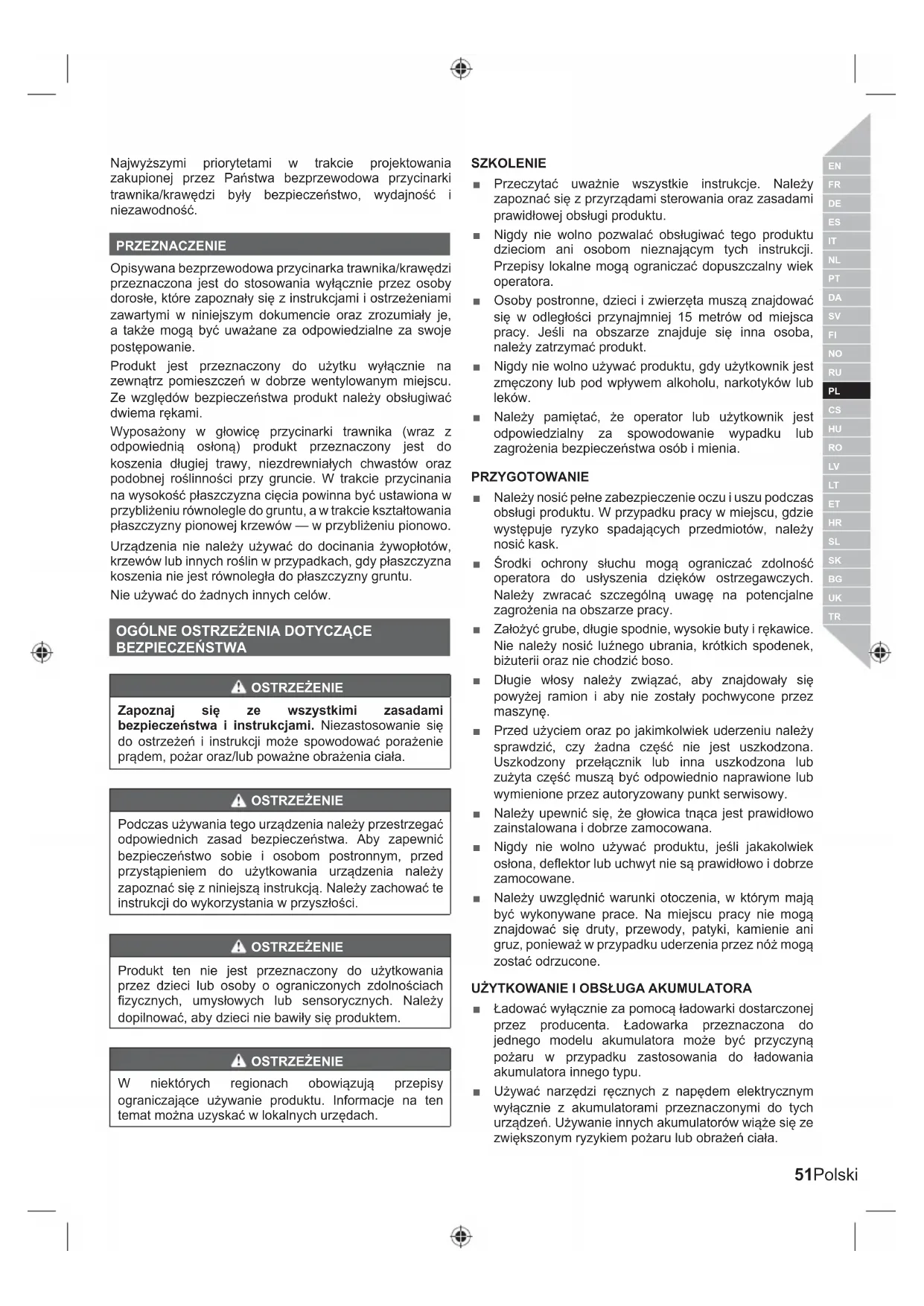 BEZPIECZEŃSTWA OSTRZEŻENIE Zapoznaj się ze wszystkimi zasadami bezpieczeństwa i instrukcjami. Niezastosowanie się do ostrzeżeń i instrukcji może spowodować porażenie prądem, pożar oraz/lub poważne obrażenia ciała. OSTRZEŻENIE Podczas używania tego urządzenia należy przestrzegać odpowiednich zasad bezpieczeństwa. Aby zapewnić bezpieczeństwo sobie i osobom postronnym, przed przystąpieniem do użytkowania urządzenia należy zapoznać się z niniejszą instrukcją. Należy zachować te instrukcji do wykorzystania w przyszłości. OSTRZEŻENIE Produkt ten nie jest przeznaczony do użytkowania przez dzieci lub osoby o ograniczonych zdolnościach fizycznych, umysłowych lub sensorycznych. Należy dopilnować, aby dzieci nie bawiły się produktem. OSTRZEŻENIE W niektórych regionach obowiązują przepisy ograniczające używanie produktu. Informacje na ten temat można uzyskać w lokalnych urzędach. SZKOLENIE ■ Przeczytać uważnie wszystkie instrukcje. Należy zapoznać się z przyrządami sterowania oraz zasadami prawidłowej obsługi produktu. ■ Nigdy nie wolno pozwalać obsługiwać tego produktu dzieciom ani osobom nieznającym tych instrukcji. Przepisy lokalne mogą ograniczać dopuszczalny wiek operatora. ■ Osoby postronne, dzieci i zwierzęta muszą znajdować się w odległości przynajmniej 15 metrów od miejsca pracy. Jeśli na obszarze znajduje się inna osoba, należy zatrzymać produkt. ■ Nigdy nie wolno używać produktu, gdy użytkownik jest zmęczony lub pod wpływem alkoholu, narkotyków lub leków. ■ Należy pamiętać, że operator lub użytkownik jest odpowiedzialny za spowodowanie wypadku lub zagrożenia bezpieczeństwa osób i mienia. PRZYGOT OWANIE ■ Należy nosić pełne zabezpieczenie oczu i uszu podczas obsługi produktu. W przypadku pracy w miejscu, gdzie występuje ryzyko spadających przedmiotów, należy nosić kask. ■ Środki ochrony słuchu mogą ograniczać zdolność operatora do usłyszenia dzięków ostrzegawczych. Należy zwracać szczególną uwagę na potencjalne zagrożenia na obszarze pracy. ■ Założyć grube, długie spodnie, wysokie buty i rękawice. Nie należy nosić luźnego ubrania, krótkich spodenek, biżuterii oraz nie chodzić boso. ■ Długie włosy należy związać, aby znajdowały się powyżej ramion i aby nie zostały pochwycone przez maszynę. ■ Przed użyciem oraz po jakimkolwiek uderzeniu należy sprawdzić, czy żadna część nie jest uszkodzona. Uszkodzony przełącznik lub inna uszkodzona lub zużyta część muszą być odpowiednio naprawione lub wymienione przez autoryzowany punkt serwisowy. ■ Należy upewnić się, że głowica tnąca jest prawidłowo zainstalowana i dobrze zamocowana. ■ Nigdy nie wolno używać produktu, jeśli jakakolwiek osłona, deflektor lub uchwyt nie są prawidłowo i dobrze zamocowane. ■ Należy uwzględnić warunki otoczenia, w którym mają być wykonywane prace. Na miejscu pracy nie mogą znajdować się druty, przewody, patyki, kamienie ani gruz, ponieważ w przypadku uderzenia przez nóż mogą zostać odrzucone. UŻYTKOW