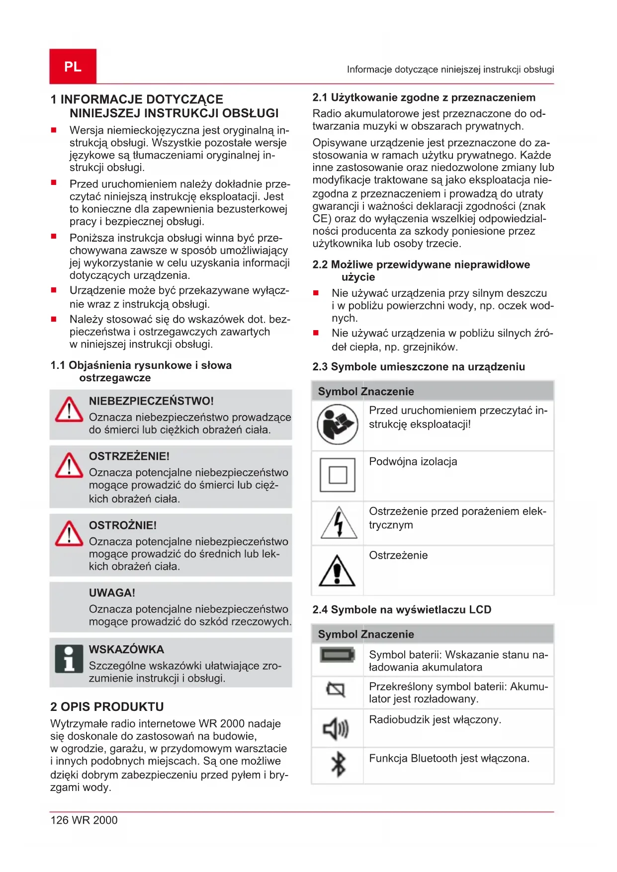 ostrzegawcze NIEBEZPIECZEŃSTWO! Oznacza niebezpieczeństwo prowadzące do śmierci lub ciężkich obrażeń ciała. OSTRZEŻENIE! Oznacza potencjalne niebezpieczeństwo mogące prowadzić do śmierci lub cięż- kich obrażeń ciała. OSTROŻNIE! Oznacza potencjalne niebezpieczeństwo mogące prowadzić do średnich lub lek- kich obrażeń ciała. UWAGA! Oznacza potencjalne niebezpieczeństwo mogące prowadzić do szkód rzeczowych. WSKAZÓWKA Szczególne wskazówki ułatwiające zro- zumienie instrukcji iobsługi. 2 OPIS PRODUKTU Wytrzymałe radio internetowe WR2000 nadaje się doskonale do zastosowań na budowie, wogrodzie, garażu, wprzydomowym warsztacie iinnych podobnych miejscach. Są one możliwe dzięki dobrym zabezpieczeniu przed pyłem ibry- zgami wody.