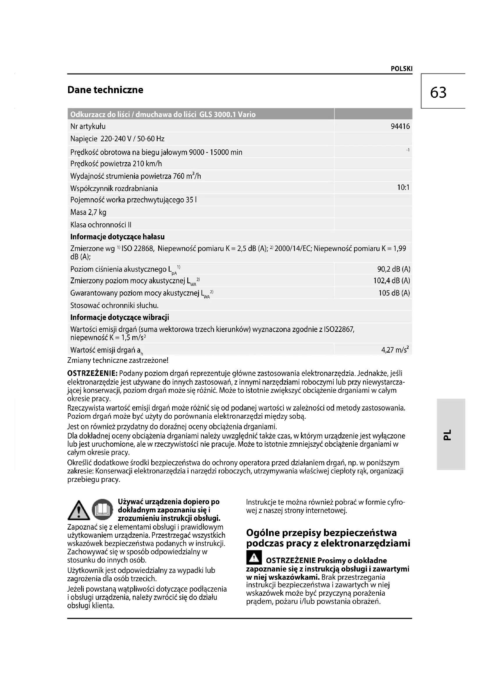 GLS 3000.1 Vario - Dmuchawa Güde - Bezpłatna instrukcja obsługi