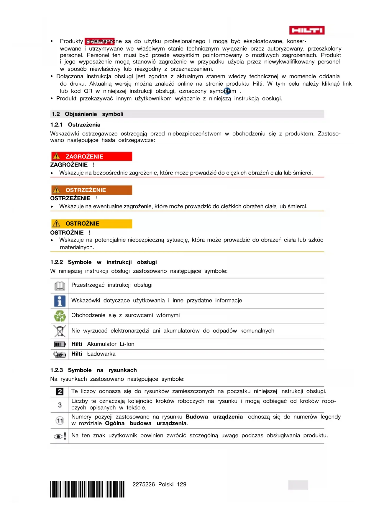 W niniejszej instrukcji obsługi zastosowano następujące symbole: Przestrzegać instrukcji obsługi Wskazówki dotyczące użytkowania i inne przydatne informacje Obchodzenie się z surowcami wtórnymi Nie wyrzucać elektronarzędzi ani akumulatorów do odpadów komunalnych Hilti Akumulator LiIon Hilti Ładowarka
