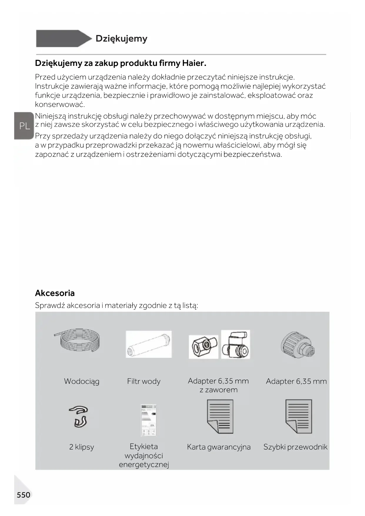 Dziękujemy za zakup produktu firmy Haier. Przed użyciem urządzenia należy dokładnie przeczytać niniejsze instrukcje. Instrukcje zawierają ważne informacje, które pomogą możliwie najlepiej wykorzystać funkcje urządzenia, bezpiecznie i prawidłowo je zainstalować, eksploatować oraz konserwować. Niniejszą instrukcję obsługi należy przechowywać w dostępnym miejscu, aby móc z niej zawsze skorzystać w celu bezpiecznego i właściwego użytkowania urządzenia. Przy sprzedaży urządzenia należy do niego dołączyć niniejszą instrukcję obsługi, a w przypadku przeprowadzki przekazać ją nowemu właścicielowi, aby mógł się zapoznać z urządzeniem i ostrzeżeniami dotyczącymi bezpieczeństwa. Akcesoria Sprawdź akcesoria i materiały zgodnie z tą listą: