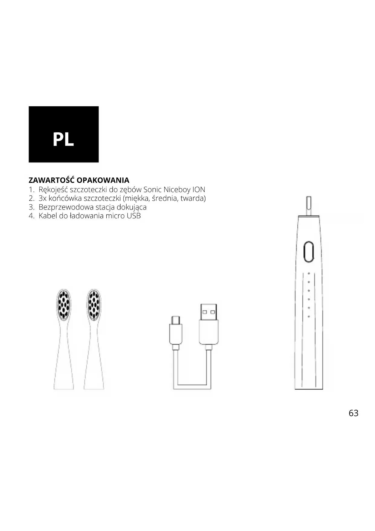 - W razie problemów zdrowotnych przed użyciem urządzenia Niceboy ION Sonic należy skonsultować się z lekarzem. – Szczoteczka do zębów Niceboy ION Sonic jest urządzeniem do pielęgnacji osobistej. Nie jest przeznaczona do stosowania u wielu pacjentów w gabine- cie lub placówce stomatologicznej.
