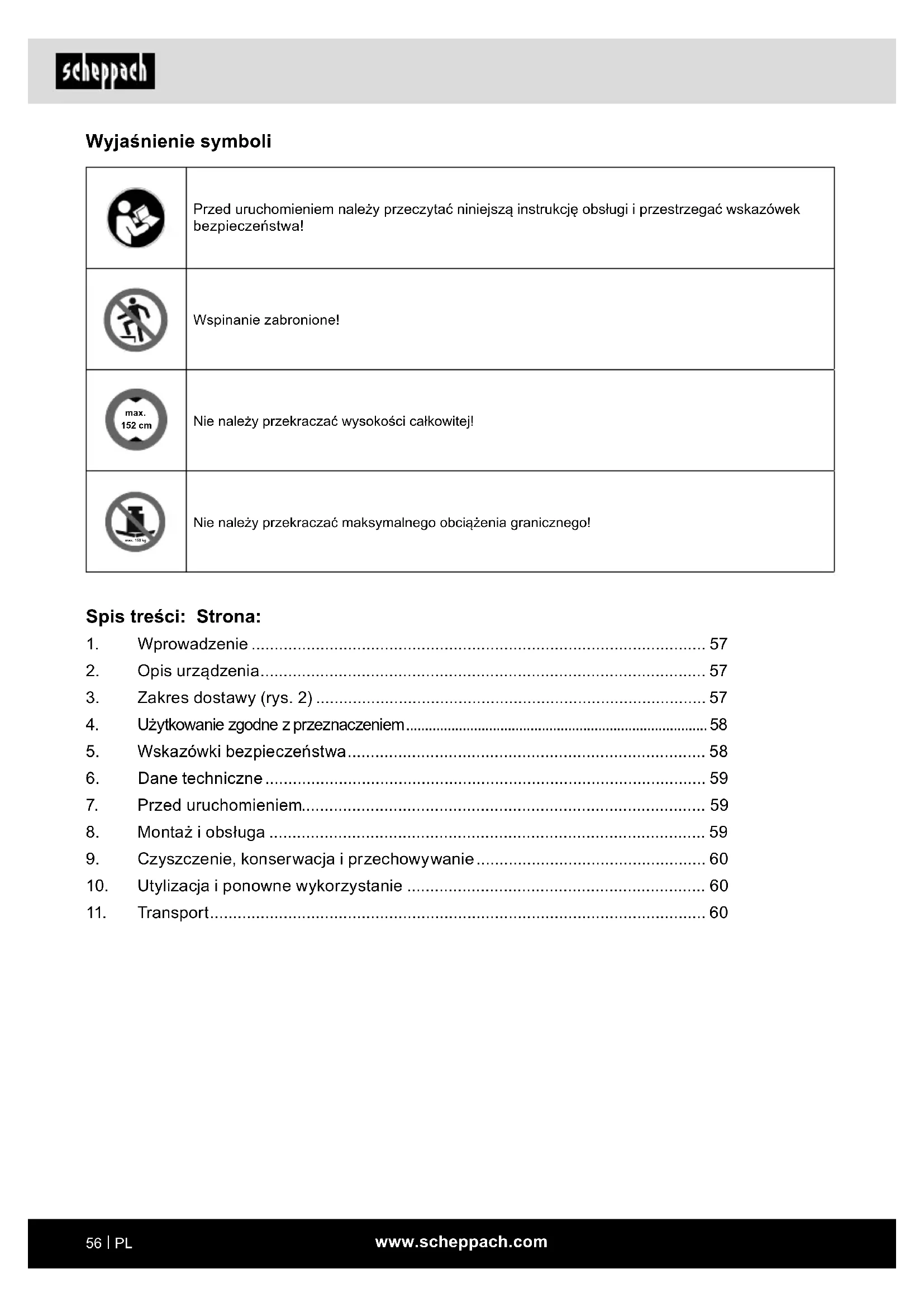 Wyjaśnienie symboli Przed uruchomieniem należy przeczytać niniejszą instrukcję obsługi i przestrzegać wskazówek bezpieczeństwa! Wspinanie zabronione! max. 152 cm Nie należy przekraczać wysokości całkowitej! Nie należy przekraczać maksymalnego obciążenia granicznego! Spis treści: Strona: