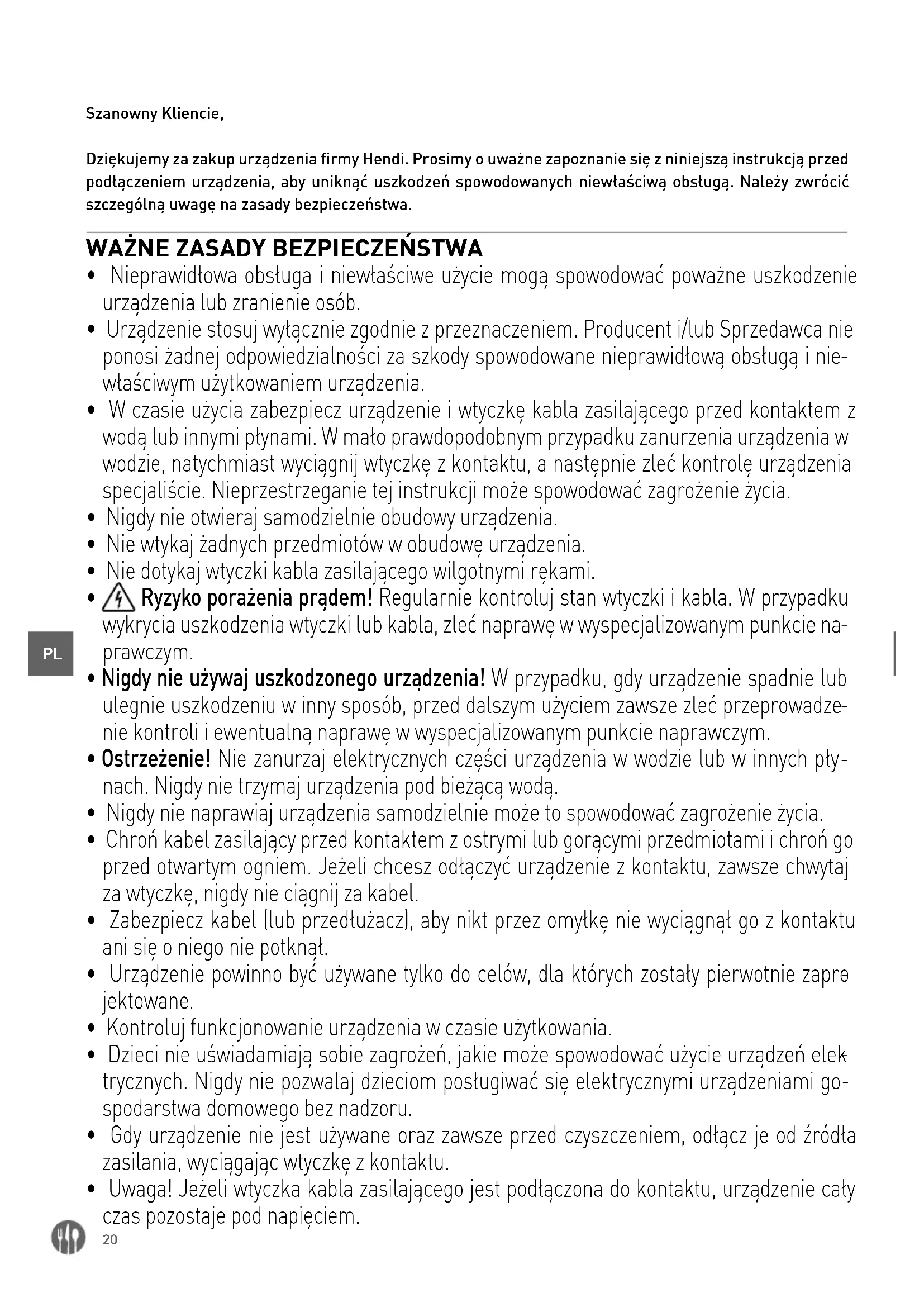 Szanowny Kliencie, Dziękujemy za zakup urządzenia firmy Hendi. Prosimy o uważne zapoznanie się z niniejszą instrukcją przed podłączeniem urządzenia, aby uniknąć uszkodzeń spowodowanych niewłaściwą obsługą. Należy zwrócić szczególną uwagę na zasady bezpieczeństwa.