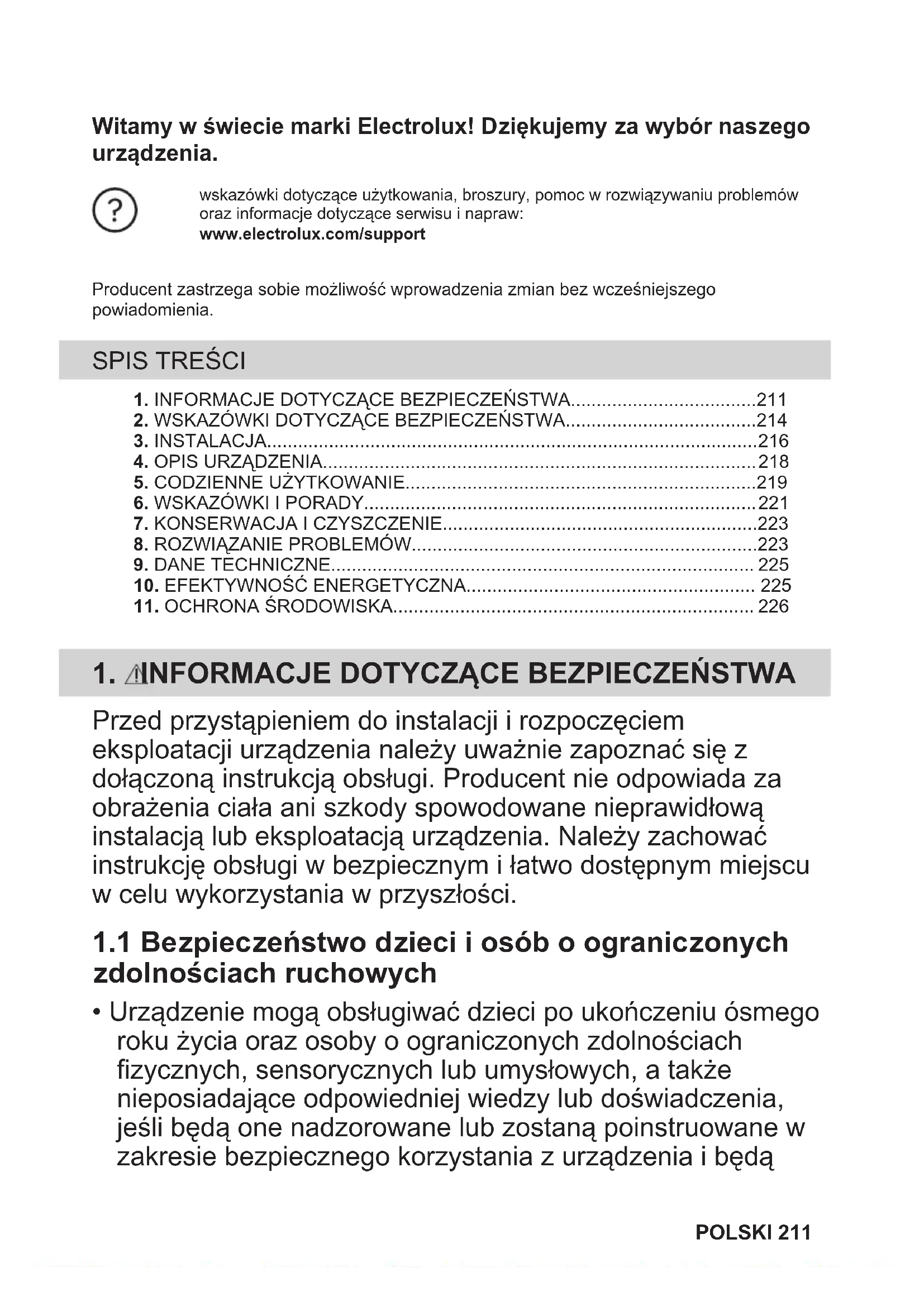 Materiały oznaczone symbolem należy poddać utylizacji. Opakowanie urządzenia włożyć do odpowiedniego pojemnika w celu przeprowadzenia recyklingu. Należy zadbać o ponowne przetwarzanie odpadów urządzeń elektrycznych i elektronicznych, aby chronić środowisko naturalne oraz ludzkie zdrowie. Nie wolno wyrzucać urządzeń oznaczonych symbolem razem z odpadami domowymi. Należy zwrócić produkt do miejscowego punktu ponownego przetwarzania lub skontaktować się z odpowiednimi władzami miejskimi. 226 POLSKIBem-vindo(a) à Electrolux. Obrigado por escolher o nosso aparelho. Obter conselhos de utilização, folhetos, resolução de problemas e informações sobreassistência e reparações:www.electrolux.com/supportSujeito a alterações sem aviso prévio. ÍNDICE 1. INFORMAÇÕES DE SEGURANÇA............................................................2272. INSTRUÇÕES DE SEGURANÇA............................................................... 230