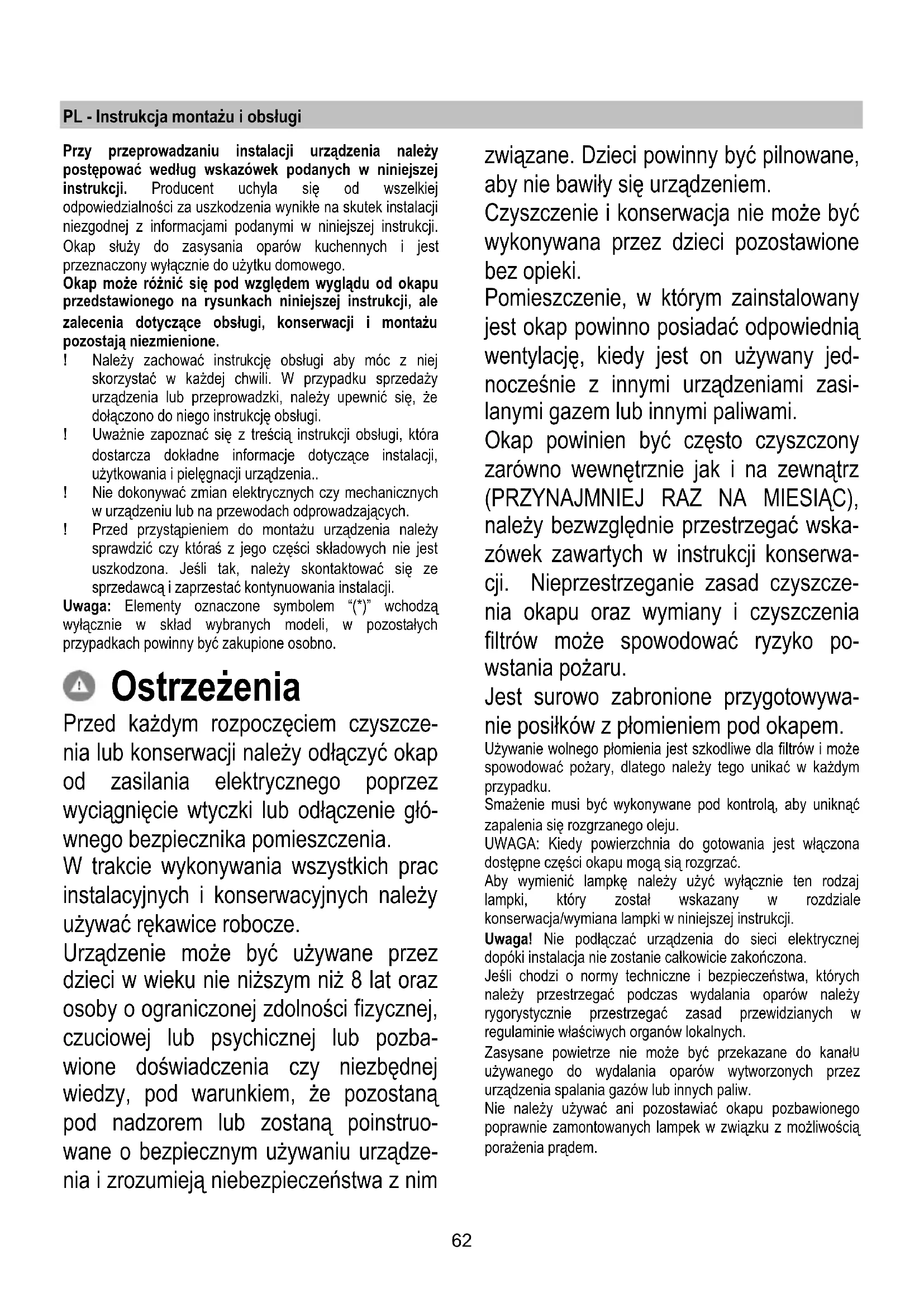 Hvis belysningen ikke fungerer, skal man kontrollere, at lampen er korrekt indsat i fatningen, før der rettes henvendelse til et servicecenter.62 PL - Instrukcja montażu i obsługi Przy przeprowadzaniu instalacji urządzenia należy postępować według wskazówek podanych w niniejszej instrukcji. Producent uchyla się od wszelkiej odpowiedzialności za uszkodzenia wynikłe na skutek instalacji niezgodnej z informacjami podanymi w niniejszej instrukcji. Okap służy do zasysania oparów kuchennych i jest przeznaczony wyłącznie do użytku domowego. Okap może różnić się pod względem wyglądu od okapu przedstawionego na rysunkach niniejszej instrukcji, ale zalecenia dotyczące obsługi, konserwacji i montażu pozostają niezmienione. ! Należy zachować instrukcję obsługi aby móc z niej skorzystać w każdej chwili. W przypadku sprzedaży urządzenia lub przeprowadzki, należy upewnić się, że dołączono do niego instrukcję obsługi. ! Uważnie zapoznać się z treścią instrukcji obsługi, która dostarcza dokładne informacje dotyczące instalacji, użytkowania i pielęgnacji urządzenia.. ! Nie dokonywać zmian elektrycznych czy mechanicznych w urządzeniu lub na przewodach odprowadzających. ! Przed przystąpieniem do montażu urządzenia należy sprawdzić czy któraś z jego części składowych nie jest uszkodzona. Jeśli tak, należy skontaktować się ze sprzedawcą i zaprzestać kontynuowania instalacji. Uwaga: Elementy oznaczone symbolem “(*)” wchodzą wyłącznie w skład wybranych modeli, w pozostałych przypadkach powinny być zakupione osobno. Ostrzeżenia Przed każdym rozpoczęciem czyszcze- nia lub konserwacji należy odłączyć okap od zasilania elektrycznego poprzez wyciągnięcie wtyczki lub odłączenie głó- wnego bezpiecznika pomieszczenia. W trakcie wykonywania wszystkich prac instalacyjnych i konserwacyjnych należy używać rękawice robocze. Urządzenie może być używane przez dzieci w wieku nie niższym niż 8 lat oraz osoby o ograniczonej zdolności fizycznej, czuciowej lub psychicznej lub pozba- wione doświadczenia czy niezbędnej wiedzy, pod warunkiem, że pozostaną pod nadzorem lub zostaną poinstruo- wane o bezpiecznym używaniu urządze- nia i zrozumieją niebezpieczeństwa z nim związane. Dzieci powinny być pilnowane, aby nie bawiły się urządzeniem. Czyszczenie i konserwacja nie może być wykonywana przez dzieci pozostawione bez opieki. Pomieszczenie, w którym zainstalowany jest okap powinno posiadać odpowiednią wentylację, kiedy jest on używany jed- nocześnie z innymi urządzeniami zasi- lanymi gazem lub innymi paliwami. Okap powinien być często czyszczony zarówno wewnętrznie jak i na zewnątrz (PRZYNAJMNIEJ RAZ NA MIESIĄC), należy bezwzględnie przestrzegać wska- zówek zawartych w instrukcji konserwa- cji. Nieprzestrzeganie zasad czyszcze- nia okapu oraz wymiany i czyszczenia filtrów może spowodować ryzyko po- wstania pożaru. Jest surowo zabronione przygotowywa- nie posiłków z płomieniem pod okapem. Używanie wolnego płomienia jest szkodliwe dla filtrów i może spowodować pożary, dlatego należy tego unikać w każdym przypadku. Smażenie musi być wykonywane pod kontrolą, aby uniknąć zapalenia się rozgrzanego oleju. UWAGA: Kiedy powierzchnia do gotowania jest włączona dostępne części okapu mogą sią rozgrzać. Aby wymienić lampkę należy użyć wyłącznie ten rodzaj lampki, który został wskazany w rozdziale konserwacja/wymiana lampki w niniejszej instrukcji. Uwaga! Nie podłączać urządzenia do sieci elektrycznej dopóki instalacja nie zostanie całkowicie zakończona. Jeśli chodzi o normy techniczne i bezpieczeństwa, których należy przestrzegać podczas wydalania oparów należy rygorystycznie przestrzegać zasad przewidzianych w regulaminie właściwych organów lokalnych. Zasysane powietrze nie może być przekazane do kanał