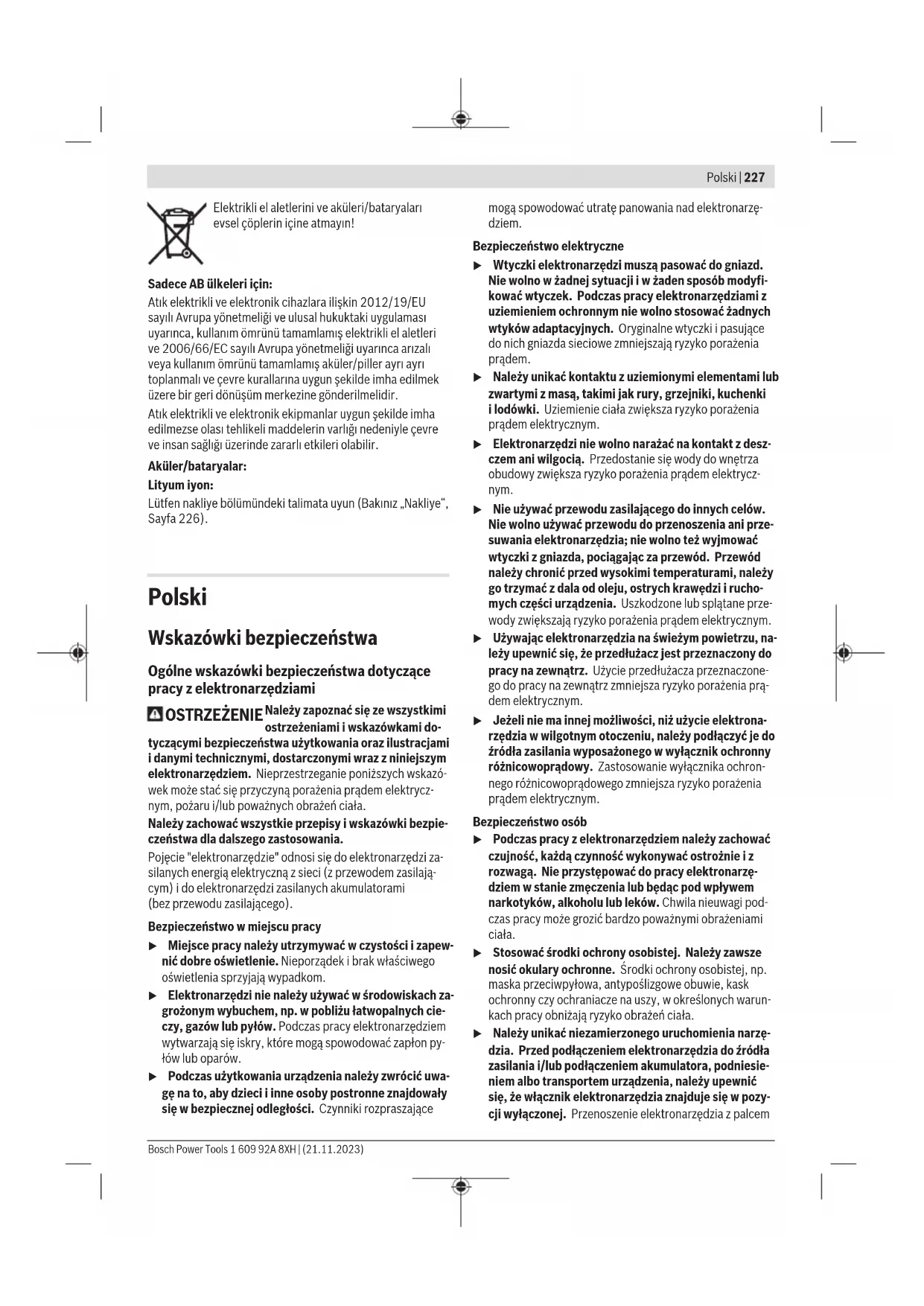 Karasoku Mahallesi 28028. Sokak No:20/A Merkez / ADANA Tel.: +903223599710 -3521379 Fax: +903223591323 E-mail: isiklar@isiklarelektrik.com Diğer servis adreslerini şurada bulabilirsiniz: www.bosch-pt.com/serviceaddresses Nakliye Önerilen Lityum İyon aküler tehlikeli madde taşıma yönetmeliği hükümlerine tabidir. Aküler başka bir yükümlülük olmaksızın kullanıcı tarafından caddeler üzerinde taşınabilir. Üçüncü kişiler eliyle yollanma durumunda (örneğin hava yolu ile veya nakliye şirketleri ile) paketleme ve etiketlemeye ilişkin özel hükümlere uyulmalıdır. Gönderi paketlenirken bir tehlikeli madde uzmanından yardım alınmalıdır. Aküleri sadece ve ancak gövdelerinde hasar yoksa gönderin. Açık kontakları kapatın ve aküyü ambalaj içinde hareket etmeyecek biçimde paketleyin. Lütfen olası ek ulusal yönetmelik hükümlerine de uyun. Tasfiye Elektrikli el aletleri, aküler, aksesuar ve ambalaj malzemesi çevre dostu tasfiye amacıyla bir geri dönüşüm merkezine yollanmalıdır. 1 609 92A 8XH | (21.11.2023) Bosch Power ToolsPolski | 227 Elektrikli el aletlerini ve aküleri/bataryaları evsel çöplerin içine atmayın! Sadece AB ülkeleri için: Atık elektrikli ve elektronik cihazlara ilişkin 2012/19/EU sayılı Avrupa yönetmeliği ve ulusal hukuktaki uygulaması uyarınca, kullanım ömrünü tamamlamış elektrikli el aletleri ve 2006/66/EC sayılı Avrupa yönetmeliği uyarınca arızalı veya kullanım ömrünü tamamlamış aküler/piller ayrı ayrı toplanmalı ve çevre kurallarına uygun şekilde imha edilmek üzere bir geri dönüşüm merkezine gönderilmelidir. Atık elektrikli ve elektronik ekipmanlar uygun şekilde imha edilmezse olası tehlikeli maddelerin varlığı nedeniyle çevre ve insan sağlığı üzerinde zararlı etkileri olabilir. Aküler/bataryalar: Lityum iyon: Lütfen nakliye bölümündeki talimata uyun (Bakınız „Nakliye“, Sayfa226). Polski Wskazówki bezpieczeństwa Ogólne wskazówki bezpieczeństwa dotyczące pracy z elektronarzędziami OSTRZEŻENIE Należy zapoznać się ze wszystkimi ostrzeżeniami i wskazówkami do- tyczącymi bezpieczeństwa użytkowania oraz ilustracjami i danymi technicznymi, dostarczonymi wraz z niniejszym elektronarzędziem. Nieprzestrzeganie poniższych wskazó- wek może stać się przyczyną porażenia prądem elektrycz- nym, pożaru i/lub poważnych obrażeń ciała. Należy zachować wszystkie przepisy i wskazówki bezpie- czeństwa dla dalszego zastosowania. Pojęcie "elektronarzędzie" odnosi się do elektronarzędzi za- silanych energią elektryczną z sieci (z przewodem zasilają- cym) i do elektronarzędzi zasilanych akumulatorami (bezprzewodu zasilającego). Bezpieczeństwo w miejscu pracy u Miejsce pracy należy utrzymywać w czystości i zapew- nić dobre oświetlenie. Nieporządek i brak właściwego oświetlenia sprzyjają wypadkom. u Elektronarzędzi nie należy używać w środowiskach za- grożonym wybuchem, np. w pobliżu łatwopalnych cie- czy, gazów lub pyłów. Podczas pracy elektronarzędziem wytwarzają się iskry, które mogą spowodować zapłon py- łów lub oparów. u Podczas użytkowania urządzenia należy zwrócić uwa- gę na to, aby dzieci i inne osoby postronne znajdowały się w bezpiecznej odległości. Czynniki rozpraszające mogą spowodować utratę panowania nad elektronarzę- dziem. Bezpieczeństwo elektryczne u Wtyczki elektronarzędzi muszą pasować do gniazd. Nie wolno w żadnej sytuacji i w żaden sposób modyfi- kować wtyczek. Podczas pracy elektronarzędziami z uziemieniem ochronnym nie wolno stosować żadnych wtyków adaptacyjnych. Oryginalne wtyczki i pasujące do nich gniazda sieciowe zmniejszają ryzyko porażenia prądem. u Należy unikać kontaktu z uziemionymi elementami lub zwartymi z masą, takimi jak rury, grzejniki, kuchenki ilodówki. Uziemienie ciała zwiększa ryzyko porażenia prądem elektrycznym. u Elektronarzędzi nie wolno narażać na kontakt z desz- czem ani wilgocią. Przedostanie się wody do wnętrza obudowy zwiększa ryzyko porażenia prądem elektrycz- nym. u Nie używać przewodu zasilającego do innych celów. Nie wolno używać przewodu do przenoszenia ani prze- suwania elektronarzędzia; nie wolno też wyjmować wtyczki z gniazda, pociągając za przewód. Przewód należy chronić przed wysokimi temperaturami, należy go trzymać zdala od oleju, ostrych krawędzi i rucho- mych części urządzenia. Uszkodzone lub splątane prze- wody zwiększają ryzyko porażenia prądem elektrycznym. u Używając elektronarzędzia na świeżym powietrzu, na- leży upewnić się, że przedłużacz jest przeznaczony do pracy na zewnątrz. Użycie przedłużacza przeznaczone- go do pracy na zewnątrz zmniejsza ryzyko porażenia prą- dem elektrycznym. u Jeżeli nie ma innej możliwości, niż użycie elektrona- rzędzia w wilgotnym otoczeniu, należy podłączyć je do źródła zasilania wyposażonego w wyłącznik ochronny różnicowoprądowy. Zastosowanie wyłącznika ochron- nego różnicowoprądowego zmniejsza ryzyko porażenia prądem elektrycznym. Bezpieczeństwo osób u Podczas pracy z elektronarzędziem należy zachować czujność, każdą czynność wykonywać ostrożnie i z rozwagą. Nie przystępować do pracy elektronarzę- dziem w stanie zmęczenia lub będąc pod wpływem narkotyków, alkoholu lub leków. Chwila nieuwagi pod- czas pracy może grozić bardzo poważnymi obrażeniami ciała. u Stosować środki ochrony osobistej. Należy zawsze nosić okulary ochronne. Środki ochrony osobistej, np. maska przeciwpyłowa, antypoślizgowe obuwie, kask ochronny czy ochraniacze na uszy, w określonych warun- kach pracy obniżają ryzyko obrażeń ciała. u Należy unikać niezamierzonego uruchomienia narzę- dzia. Przed podłączeniem elektronarzędzia do źródła zasilania i/lub podłączeniem akumulatora, podniesie- niem albo transportem urządzenia, należy upewnić się, że włącznik elektronarz