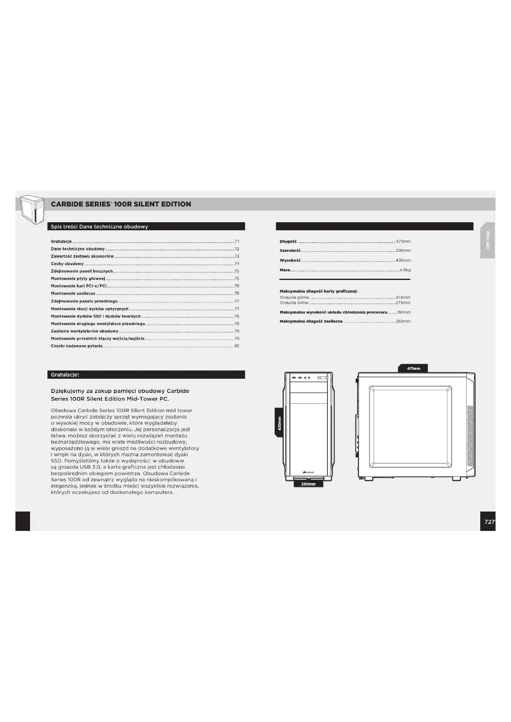 POLSKI Spis treści Dane techniczne obudowy Gratulacje! Gratulacje .....................................................................................................................................................................1 Dane techniczne obudowy .................................................................................................................................... Zawartość zestawu akcesoriów .......................................................................................................................... Cechy obudowy ......................................................................................................................................................... Zdejmowanie paneli bocznych ............................................................................................................................ Montowanie płyty głównej ................................................................................................................................... Montowanie kart PCI-e/PCI .................................................................................................................................. Montowanie zasilacza ............................................................................................................................................. Zdejmowanie panelu przedniego....................................................................................................................... Montowanie stacji dysków optycznych ........................................................................................................... Montowanie dysków SSD i dysków twardych ............................................................................................... Montowanie drugiego wentylatora przedniego........................................................................................... Zasilanie wentylatorów obudowy ...................................................................................................................... Montowanie przednich złączy wejścia/wyjścia ........................................................................................... Często zadawane pytania ...................................................................................................................................... Dziękujemy za zakup pamięci obudowy Carbide Series 100R Silent Edition Mid-Tower PC. Obudowa Carbide Series 100R Silent Edition mid tower pozwala ukryć zabójczy sprzęt wymagający zasilania o wysokiej mocy w obudowie, która wyglądałaby doskonale w każdym otoczeniu. Jej personalizacja jest łatwa: możesz skorzystać z wielu rozwiązań montażu beznarzędziowego, ma wiele możliwości rozbudowy, wyposażono ją w wiele gniazd na dodatkowe wentylatory i wnęki na dyski, w których można zamontować dyski SSD. Pomyśleliśmy także o wydajności: w obudowie są gniazda USB 3.0, a karta graficzna jest chłodzona bezpośrednim obiegiem powietrza. Obudowa Carbide Series 100R od zewnątrz wygląda na nieskomplikowaną i elegancką, jednak w środku mieści wszystkie rozwiązania, których oczekujesz od doskonałego komputera. Długość .................................................................................................... 1mm Szerokość ................................................................................................mm Wysokość ................................................................................................mm Masa ............................................................................................................... kg Maksymalnadługośćkartygraficznej Gniazdagórne ........................................................................................ 1mm Gniazdadolne.........................................................................................mm Maksymalnawysokośćukładuchłodzeniaprocesora ..........1mm Maksymalnadługośćzasilacza ...................................................... mm 430mm 200mm 471mm7473 CARBIDE SERIES