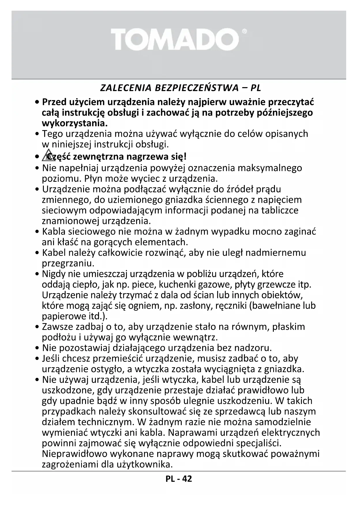 PL-42Urządzenia nie można w żadnym wypadku używać, jeśli składa się ono z części, które nie są zalecane lub dostarczone przez producenta.