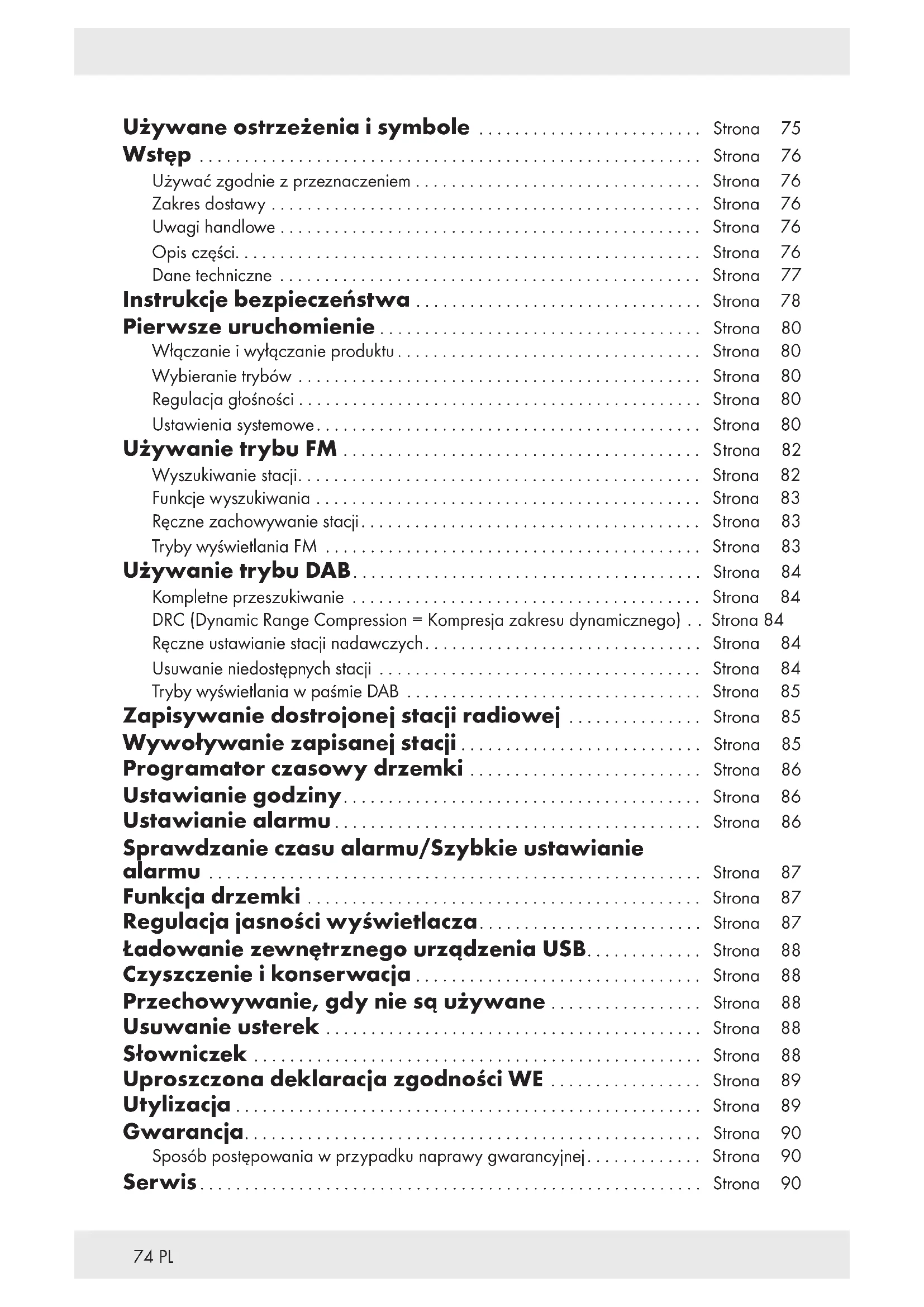 OSTRZEŻENIE! Nie zanurzać produktu ani wtykowego zasilacza sieciowego w wodzie lub innych cieczach w celu wyczyszczenia. Nigdy nie trzymać żadnych elementów produktu pod bieżącą wodą. Czyścić produkt lekko zwilżoną ściereczką. Nie wolno dopuścić, aby woda lub inne płyny dostały się do wnętrza produktu. Do czyszczenia nie należy używać środków czyszczących na bazie rozpuszczalników, materiałów ściernych, agresywnych roztworów czyszczących ani twardych szczotek. Po wyczyszczeniu pozostawić wszystkie części do wyschnięcia. Przechowywanie, gdy nie są używane Produkt należy przechowywać w oryginalnym opakowaniu. Produkt należy przechowywać w suchym, bezpiecznym miejscu, niedostępnym dla dzieci. Usuwanie usterek Przyczyna Rozwiązanie Nie można włączyć produktu Sprawdzić, czy wtykowy zasilacz sieciowy jest prawidłowo podłączony do produkt i do gniazdka sieciowego. Brak dźwięku Wyregulować głośność. Zniekształcony odbiór radiowy Odbierany sygnał jest zbyt słaby. Zmienić położenie anteny lub przenieść produkt w miejsce o silniejszym sygnale. Nie znaleziono stacji FM Słaby sygnał. Wyszukać ręcznie. Nie znaleziono stacji DAB Brak zasięgu sieci DAB w okolicy lub słaby odbiór. Dostosować położenie anteny. Słowniczek Multipleks: W systemie DAB i DAB+ na każdej częstotliwości można nadawać kilka programów radiowych. Te programy radiowe są łączone w tak zwany multipleks. W ramach multipleksu można również wysyłać dodatkowe usługi, takie jak obrazy i informacje tekstowe.89 PL Błędny sygnał: Im większa liczba błędnych sygnałów, tym bardziej zakłócony jest sygnał audio docierający do produktu. Wbudowane zabezpieczenie przed błędami może to zrekompensować do pewnego stopnia bez pogorszenia sygnału audio. Wyświetlanie liczby błędnych sygnałów może być pomocne w określeniu dobrego miejsca dla produktu. Uproszczona deklaracja zgodności WE Firma OWIM GmbH & Co. KG, Stiftsbergstraße 1, 74167 Neckarsulm, NIEMCY niniejszym oświadcza, że produkt (RADIO DAB+ HG09235) jest zgodny z dyrektywami 2014/53/EU, 2011/65/EU i 2009/125/WE. Pełny tekst deklaracji zgodności WE można znaleźć pod następującym adresem internetowym: www.owim.com Utylizacja Opakowanie: Opakowanie wykonane jest z materiałów przyjaznych dla środowiska, które można przekazać do utylizacji w lokalnym punkcie przetwarzania surowców wtórnych. Przy segregowaniu odpadów prosimy zwrócić uwagę na oznakowanie materiałów opakowaniowych, oznaczone są one skrótami (a) i numerami (b) o następującym znaczeniu: 1–7: Tworzywa sztuczne/20– 22: Papier i tektura/80–98: Materiały kompozytowe. Produkt: Produkt, materiały opakowaniowe, nadają się do recyklingu i podlegają rozszerzonej odpowiedzialności producenta. Wyrzuć je osobno, zgodnie z ilustracją przedstawiającą informacje o sortowaniu, aby zapewnić lepszą utylizację odpadów. Logo Triman jest ważne tylko dla Francji. Informacji na temat możliwości utylizacji wyeksploatowanego produktu udziela urząd gminy lub miasta. Znajdujący się obok symbol przekreślonego pojemnika na śmieci na kołach pokazuje, że produkt podlega dyrektywie 2012/19/UE. Dyrektywa ta mówi, że produkt na koniec swojego czasu użytkowania nie może być usuwany ze zwykłymi odpadami domowymi, lecz musi zostać oddany do specjalnie utworzonych skupów, punktów zbiorczych lub zakładów utylizacji. Ta utylizacja jest bezpłatna. Należy chronić środowisko i usuwać odpady w odpowiedni sposób.90 PL Gwarancja Produkt wyprodukowano według wysokich standardów jakości i poddano skrupulatnej kontroli przed wysyłką. W przypadku wad produktu nabywcy przysługują ustawowe prawa. Gwarancja nie ogranicza ustawowych praw nabywcy produktu. Produkt objęte jest 3 gwarancją, licząc od daty zakupu. Gwarancja wygasa w razie zawinionego przez użytkownika uszkodzenia produktu, niewłaściwego użycia lub konserwacji. W przypadku wystąpienia w ciągu 3 lat od daty zakupu wad materiałowych lub fabrycznych, dokonujemy – według własnej oceny – bezpłatnej naprawy lub wymiany produktu. Świadczenie gwarancyjne obejmuje wady materiałowe i fabryczne. Gwarancja nie obejmuje części produktu ulegających normalnemu zużyciu, uznawanych za części zużywalne (np. baterie) oraz uszkodzeń części łamliwych, np. przełączników, akumulatorów lub wykonanych ze szkła. Zgodnie z Kodeksem Cywilnym art. 581 §1 wraz z wymianą urządzenia lub ważnej części czas gwarancji rozpoczyna się na nowo. Sposób postępowania w przypadku naprawy gwarancyjnej Aby zapewnić szybkie rozpatrzenie Państwa wniosku, prosimy stosować się do następujących wskazówek: Przed skontaktowaniem się z działem serwisowym należy przygotować paragon i numer artykułu (IAN 392260_2201) jako dowód zakupu. Numery artykułów można znaleźć na tabliczce znamionowe, na grawerunku, na stronie tytułowej jego instrukcji (na dole po lewej stronie) lub jako naklejkę na stronie odwrotnej lub spodniej. W razie wystąpienia błędów w działaniu lub innych wad, należy skontaktować się najpierw z wymienionym poniżej działem serwisowym telefonicznie lub pocztą elektroniczną. Produkt uznany za uszkodzony można następnie z dołączeniem dowodu zakupu (paragonu) i podaniem, na czym polega wada i kiedy wystąpiła, przesłać bezpłatnie na podany Państwu adres serwisu. Serwis Serwis Polska Tel.: 008004911946 E-Mail: owim@lidl.pl91CZ Použitá výstražná upozornění a symboly ........... . . . Strana 92 Úvod....................................................... . . . Strana 93 Použití v souladu s určením .................................... . . . Strana 93 Rozsah dodávky............................................. . . . Strana 93 Pokyny k ochranným značkám.................................. . . . Strana 93 Popis dílů .................................................. . . . Strana 93 Tech