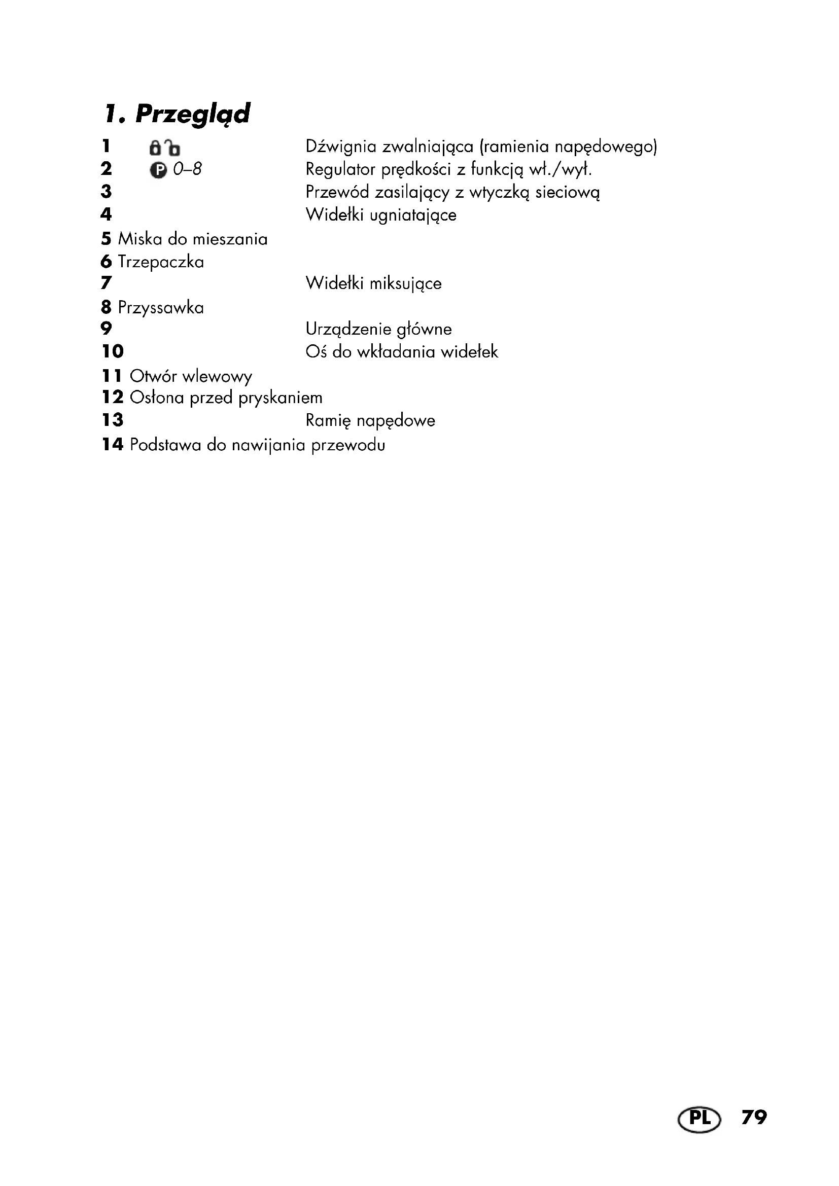 1 Dźwignia zwalniająca (ramienia napędowego) 2 0–8 Regulator prędkości z funkcją wł./wył. 3 Przewód zasilający z wtyczką sieciową 4 Widełki ugniatające 5 Miska do mieszania 6 Trzepaczka 7 Widełki miksujące 8 Przyssawka 9 Urządzenie główne 10 Oś do wkładania widełek 11 Otwór wlewowy 12 Osłona przed pryskaniem 13 Ramię napędowe 14 Podstawa do nawijania przewodu