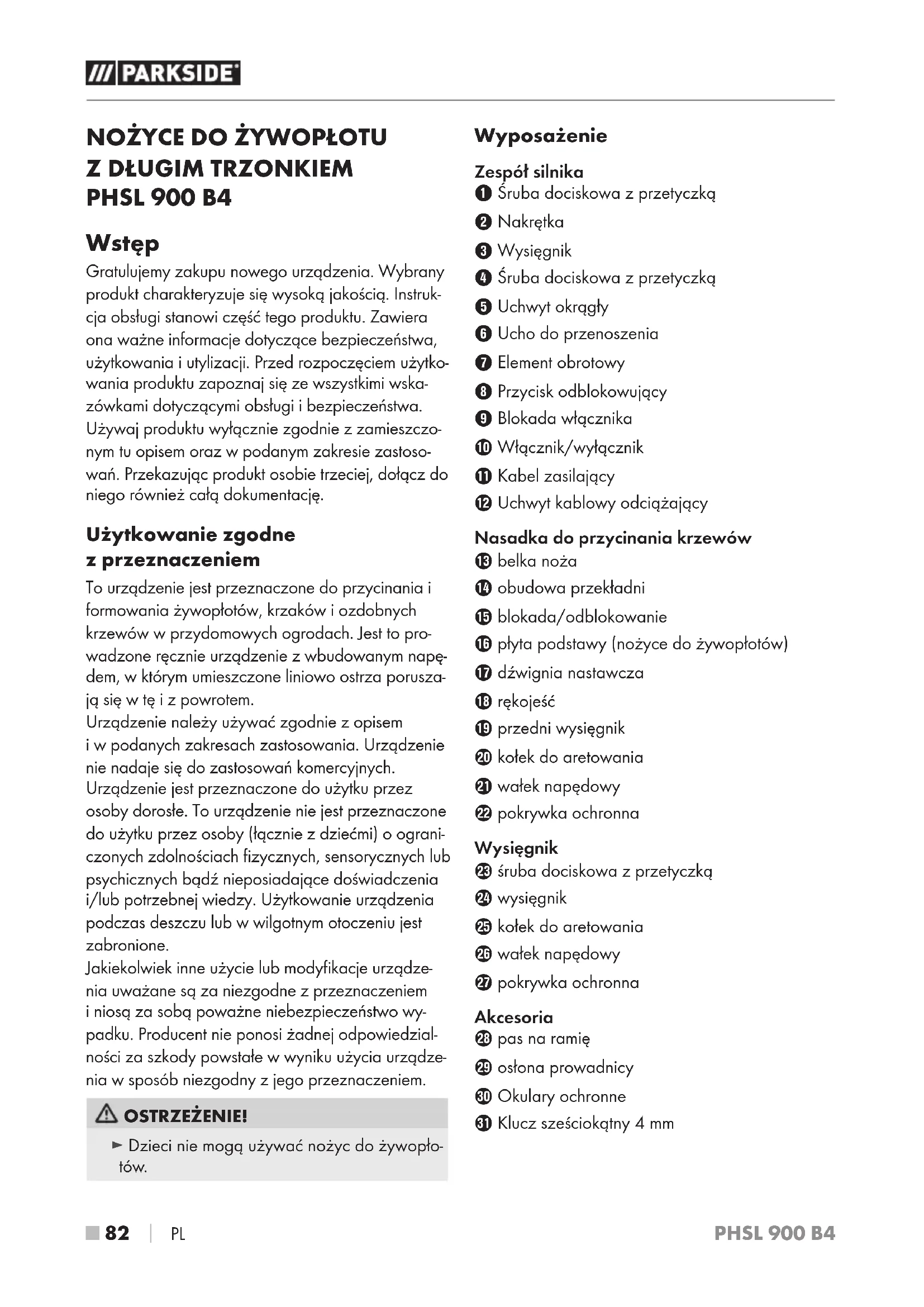 PHSL 900 B4 Wstęp Gratulujemy zakupu nowego urządzenia. Wybrany produkt charakteryzuje się wysoką jakością. Instruk- cja obsługi stanowi część tego produktu. Zawiera ona ważne informacje dotyczące bezpieczeństwa, użytkowania iutylizacji. Przed rozpoczęciem użytko- wania produktu zapoznaj się ze wszystkimi wska- zówkami dotyczącymi obsługi ibezpieczeństwa. Używaj produktu wyłącznie zgodnie zzamieszczo- nym tu opisem oraz wpodanym zakresie zastoso- wań. Przekazując produkt osobie trzeciej, dołącz do niego również całą dokumentację. Użytkowanie zgodne z przeznaczeniem To urządzenie jest przeznaczone do przycinania i formowania żywopłotów, krzaków i ozdobnych krzewów w przydomowych ogrodach. Jest to pro- wadzone ręcznie urządzenie z wbudowanym napę- dem, w którym umieszczone liniowo ostrza porusza- ją się w tę i z powrotem. Urządzenie należy używać zgodnie zopisem iwpodanych zakresach zastosowania. Urządzenie nie nadaje się do zastosowań komercyjnych. Urządzenie jest przeznaczone do użytku przez osoby dorosłe. To urządzenie nie jest przeznaczone do użytku przez osoby (łącznie z dziećmi) o ograni- czonych zdolnościach fizycznych, sensorycznych lub psychicznych bądź nieposiadające doświadczenia i/lub potrzebnej wiedzy. Użytkowanie urządzenia podczas deszczu lub w wilgotnym otoczeniu jest zabronione. Jakiekolwiek inne użycie lub modyfikacje urządze- nia uważane są za niezgodne zprzeznaczeniem iniosą za sobą poważne niebezpieczeństwo wy- padku. Producent nie ponosi żadnej odpowiedzial- ności za szkody powstałe w wyniku użycia urządze- nia w sposób niezgodny z jego przeznaczeniem. OSTRZEŻENIE! ► Dzieci nie mogą używać nożyc do żywopło- tów. Wyposażenie Zespół silnika 1 Śruba dociskowa z przetyczką 2 Nakrętka 3 Wysięgnik 4 Śruba dociskowa z przetyczką 5 Uchwyt okrągły 6 Ucho do przenoszenia 7 Element obrotowy 8 Przycisk odblokowujący 9 Blokada włącznika 0 Włącznik/wyłącznik q Kabel zasilający w Uchwyt kablowy odciążający Nasadka do przycinania krzewów e belka noża r obudowa przekładni t blokada/odblokowanie z płyta podstawy (nożyce do żywopłotów) u dźwignia nastawcza i rękojeść o przedni wysięgnik p kołek do aretowania a wałek napędowy s pokrywka ochronna Wysięgnik d śruba dociskowa z przetyczką f wysięgnik g kołek do aretowania h wałek napędowy j pokrywka ochronna Akcesoria k pas na ramię l osłona prowadnicy y Okulary ochronne x Klucz sześciokątny 4 mmPL