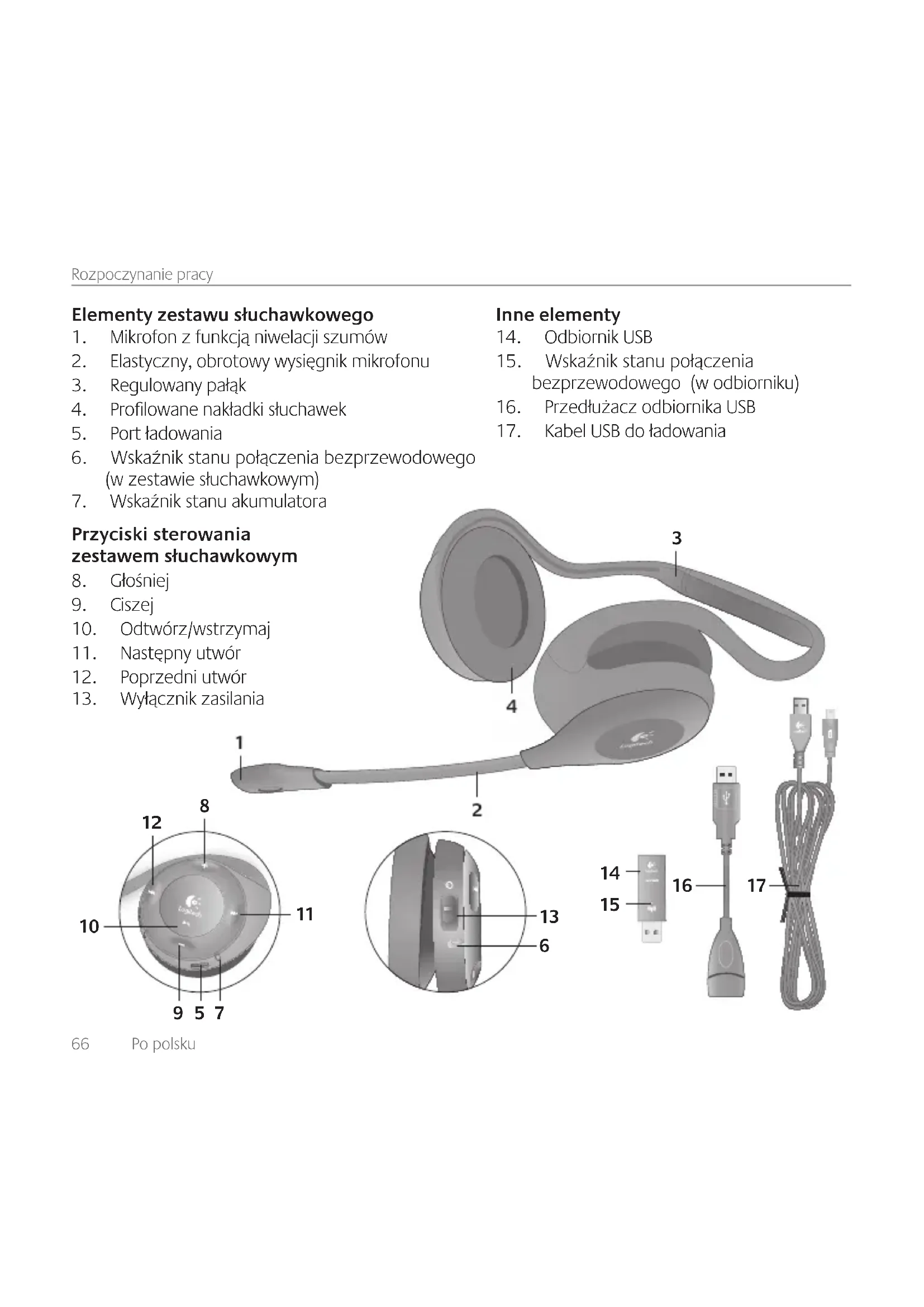 Elementyzestawusłuchawkowego 1. Mikrofon z funkcją niwelacji szumów 2. Elastyczny, obrotowy wysięgnik mikrofonu 3. Regulowany pałąk 4. Prolowane nakładki słuchawek 5. Port ładowania 6. Wskaźnik stanu połączenia bezprzewodowego (w zestawie słuchawkowym) 7. Wskaźnik stanu akumulatora Przyciskisterowania zestawemsłuchawkowym 8. Głośniej 9. Ciszej 10. Odtwórz/wstrzymaj 11. Następny utwór 12. Poprzedni utwór 13. Wyłącznik zasilania Inneelementy 14. Odbiornik USB 15. Wskaźnik stanu połączenia bezprzewodowego (w odbiorniku) 16. Przedłużacz odbiornika USB 17. Kabel USB do ładowaniaPo polsku 67 Logitech