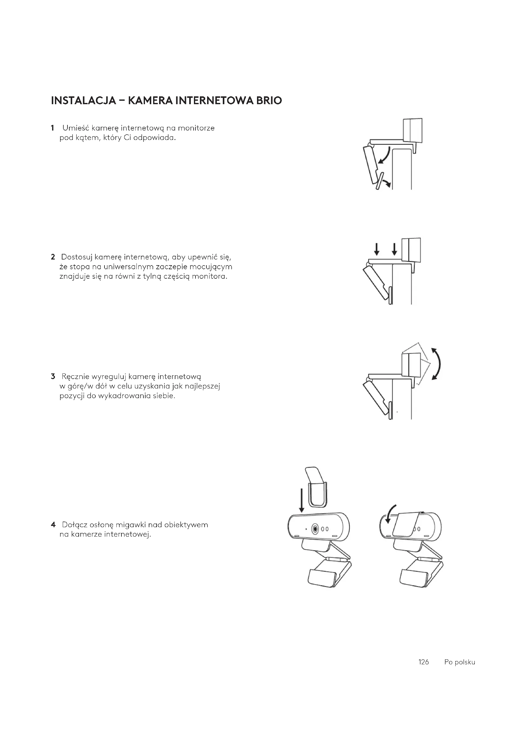 125 Po polskuINSTALACJA – KAMERA INTERNETOWA BRIO 1 Umieść kamerę internetową na monitorze podkątem, który Ci odpowiada. 2 Dostosuj kamerę internetową, aby upewnić się, że stopa na uniwersalnym zaczepie mocującym znajduje się na równi z tylną częścią monitora. 3 Ręcznie wyreguluj kamerę internetową wgórę/wdół w celu uzyskania jak najlepszej pozycji do wykadrowania siebie. 4 Dołącz osłonę migawki nad obiektywem nakamerze internetowej. 126Po polskuINSTALACJA – ZESTAW DO PORZĄDKOWANIA KABLA USB-C 1 Wyczyść powierzchnię. Zerwij taśmę. 2 Dociśnij pętelkę do stołu przez kilka sekund. 127Po polskuINSTALACJA – OPCJE UCHWYTU DO MONTAŻU Opcja 1 Zamontuj Logi Dock do stołu zapomocą 2 dołączonych śrub. Opcja 2 Zamontuj Logi Dock do stołu zapomocą taśmy VHB, przyklejając ją do spodu uchwytu. Opcja 3 Zabezpiecz Logi Dock do stołu zapomocą blokady Kensington.* *Blokada nie jest dołączona dozestawu 128Po polskuINSTALACJA – ZARZĄDZANIE OKABLOWANIEM 1 Usuń zacisk za pomocą dołączonego kluczaimbusowego. Następnie podnieś górne iśrodkowe gniazdo. 2 Zainstaluj wszystkie kable w górnym lub dolnym gnieździe, w zależności odrozmieszczenia złączy. 3 Ponownie przymocuj zacisk. Dokręć śruby, aby zabezpieczyć kable. 129Po polskuWERSJA UC 1× 1×2 s 2 s