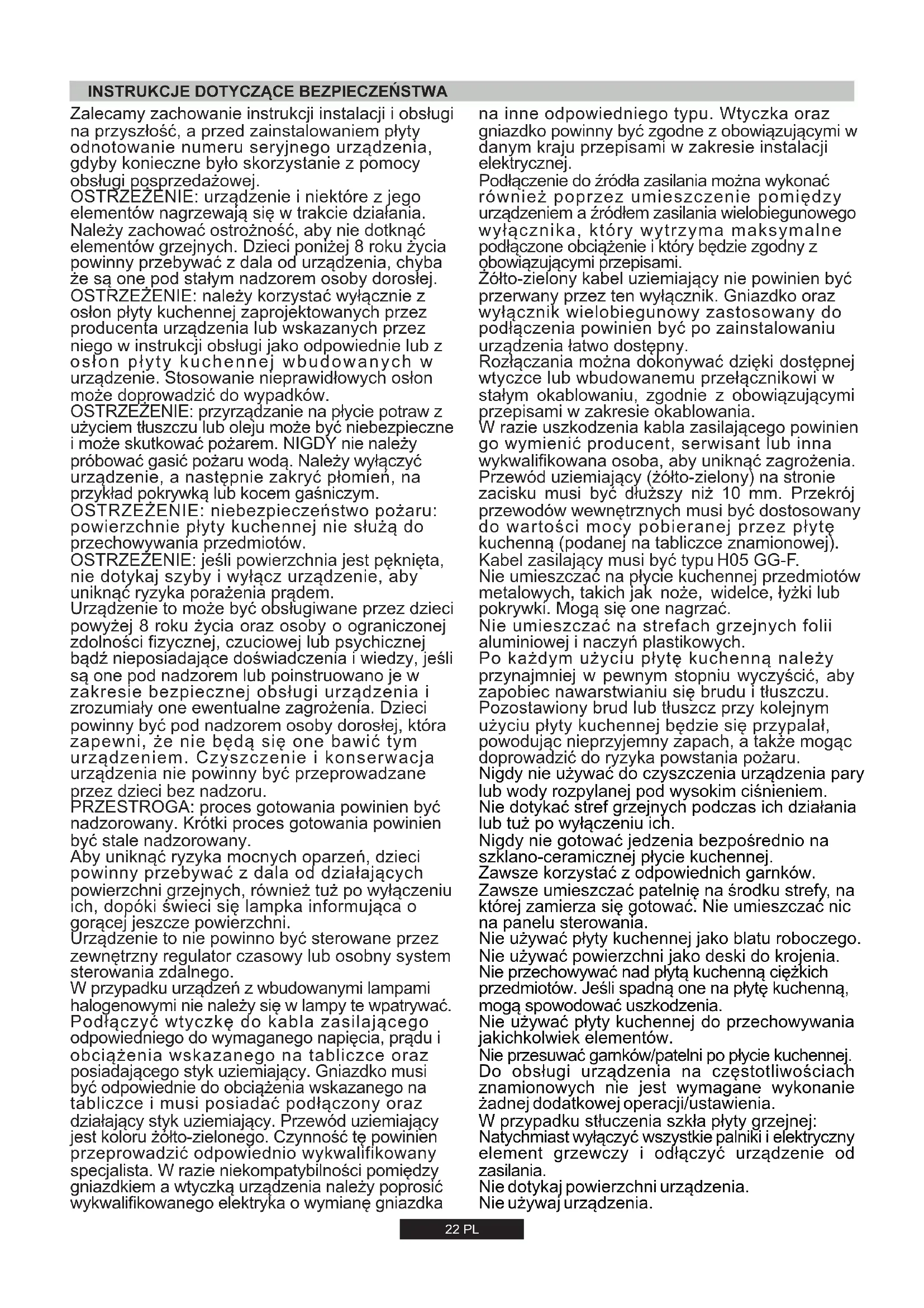 El aparato cumple con la Directiva Europea 2009/142/CE (GAD) y, a partir del 21/04/2018, con el Reglamento para Aparatos de Gas 2016/426 (GAR). Al mostrar el logo marcado en este producto, declaramos, bajo nuestra propia responsabilidad, el cumplimiento de todos los requisitos europeos en términos de seguridad, salud y medio ambiente, establecidos en la legislación de este producto. Rejillas cromadas y quemadores En todo caso en nuestro centro de servicio de post-venta pueden encontrarse piezas de recambio. Las rejillas cromadas y los quemadores tienen tendencia a ponerse oscuros con el uso. Es algo normal e inevitable, pero es algo que no altera en absoluto el funcionamiento de la placa de cocina.22 PL Zalecamy zachowanie instrukcji instalacji i obsługi na przyszłość, a przed zainstalowaniem płyty odnotowanie numeru seryjnego urządzenia, gdyby konieczne było skorzystanie z pomocy obsługi posprzedażowej. OSTRZEŻENIE: urządzenie i niektóre z jego elementów nagrzewają się w trakcie działania. Należy zachować ostrożność, aby nie dotknąć elementów grzejnych. Dzieci poniżej 8 roku życia powinny przebywać z dala od urządzenia, chyba że są one pod stałym nadzorem osoby dorosłej. OSTRZEŻENIE: należy korzystać wyłącznie z osłon płyty kuchennej zaprojektowanych przez producenta urządzenia lub wskazanych przez niego w instrukcji obsługi jako odpowiednie lub z osłon płyty kuchennej wbudowanych w urządzenie. Stosowanie nieprawidłowych osłon może doprowadzić do wypadków. OSTRZEŻENIE: przyrządzanie na płycie potraw z użyciem tłuszczu lub oleju może być niebezpieczne i może skutkować pożarem. NIGDY nie należy próbować gasić pożaru wodą. Należy wyłączyć urządzenie, a następnie zakryć płomień, na przykład pokrywką lub kocem gaśniczym. OSTRZEŻENIE: niebezpieczeństwo pożaru: powierzchnie płyty kuchennej nie służą do przechowywania przedmiotów. OSTRZEŻENIE: jeśli powierzchnia jest pęknięta, nie dotykaj szyby i wyłącz urządzenie, aby uniknąć ryzyka porażenia prądem. PRZESTROGA: proces gotowania powinien być nadzorowany. Krótki proces gotowania powinien być stale nadzorowany. W przypadku urządzeń z wbudowanymi lampami halogenowymi nie należy się w lampy te wpatrywać. Podłączyć wtyczkę do kabla zasilającego odpowiedniego do wymaganego napięcia, prądu i obciążenia wskazanego na tabliczce oraz posiadającego styk uziemiający. Gniazdko musi być odpowiednie do obciążenia wskazanego na tabliczce i musi posiadać podłączony oraz działający styk uziemiający. Przewód uziemiający jest koloru żółto-zielonego. Czynność tę powinien przeprowadzić odpowiednio wykwalifikowany specjalista. W razie niekompatybilności pomiędzy gniazdkiem a wtyczką urządzenia należy poprosić wykwalifikowanego elektryka o wymianę gniazdka Aby uniknąć ryzyka mocnych oparzeń, dzieci powinny przebywać z dala od działających powierzchni grzejnych, również tuż po wyłączeniu ich, dopóki świeci się lampka informująca o gorącej jeszcze powierzchni. Urządzenie to nie powinno być sterowane przez zewnętrzny regulator czasowy lub osobny system sterowania zdalnego. Urządzenie to może być obsługiwane przez dzieci powyżej 8 roku życia oraz osoby o ograniczonej zdolności fizycznej, czuciowej lub psychicznej bądź nieposiadające doświadczenia i wiedzy, jeśli są one pod nadzorem lub poinstruowano je w zakresie bezpiecznej obsługi urządzenia i zrozumiały one ewentualne zagrożenia. Dzieci powinny być pod nadzorem osoby dorosłej, która zapewni, że nie będą się one bawić tym urządzeniem. Czyszczenie i konserwacja urządzenia nie powinny być przeprowadzane przez dzieci bez nadzoru.