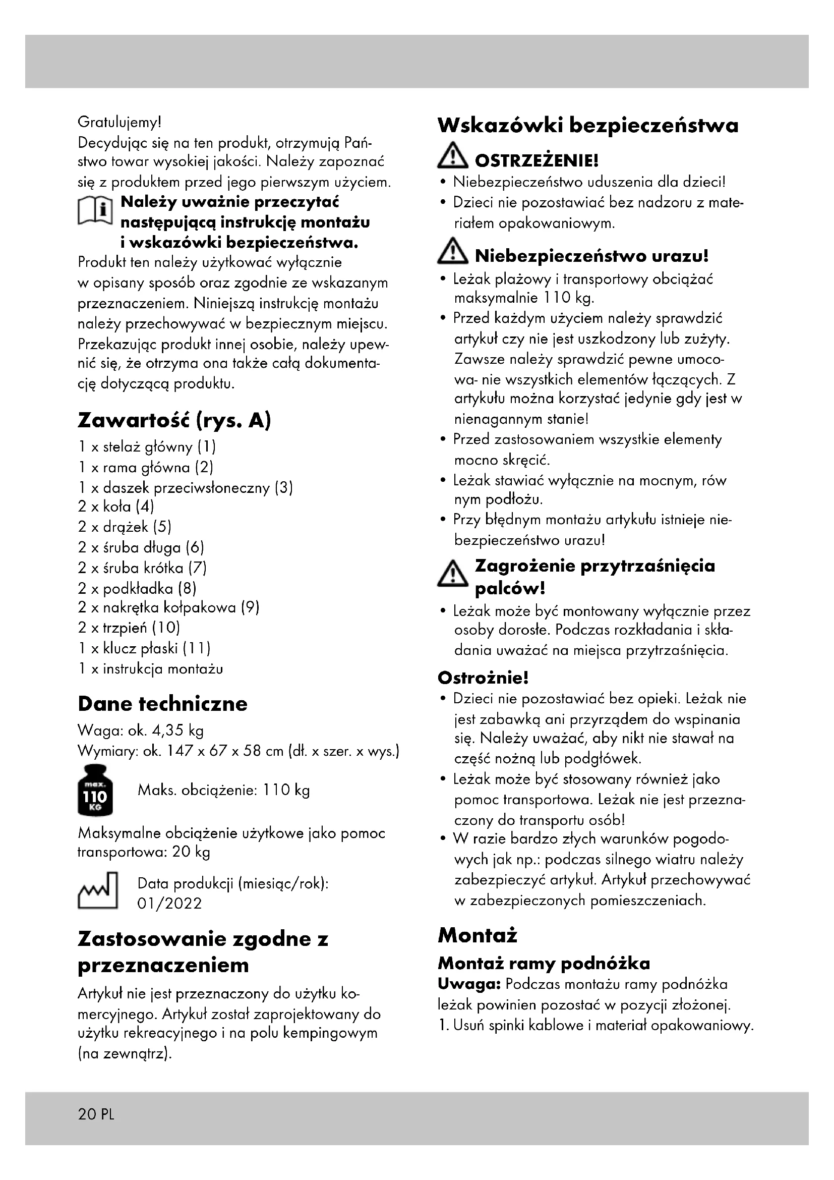 Maks. obciążenie: 110 kg Maksymalne obciążenie użytkowe jako pomoc transportowa: 20 kg Data produkcji (miesiąc/rok): 01/2022 Zastosowanie zgodne z przeznaczeniem Artykuł nie jest przeznaczony do użytku ko- mercyjnego. Artykuł został zaprojektowany do użytku rekreacyjnego i na polu kempingowym (na zewnątrz).21PL