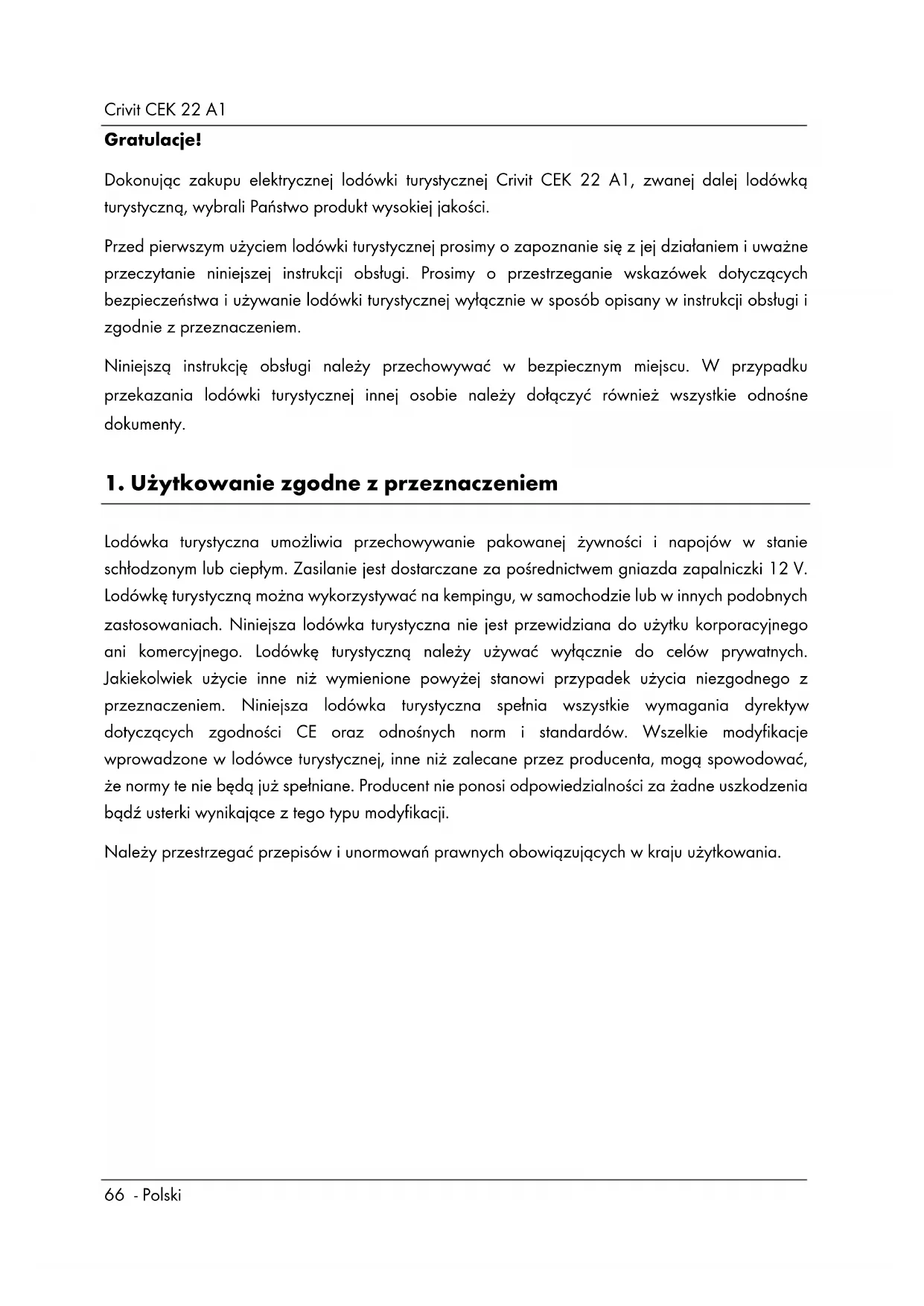 Gratulacje! Dokonując zakupu elektrycznej lodówki turystycznej Crivit CEK 22 A1, zwanej dalej lodówką turystyczną, wybrali Państwo produkt wysokiej jakości. Przed pierwszym użyciem lodówki turystycznej prosimy o zapoznanie się z jej działaniem i uważne przeczytanie niniejszej instrukcji obsługi. Prosimy o przestrzeganie wskazówek dotyczących bezpieczeństwa i używanie lodówki turystycznej wyłącznie w sposób opisany w instrukcji obsługi i zgodnie z przeznaczeniem. Niniejszą instrukcję obsługi należy przechowywać w bezpiecznym miejscu. W przypadku przekazania lodówki turystycznej innej osobie należy dołączyć również wszystkie odnośne dokumenty.