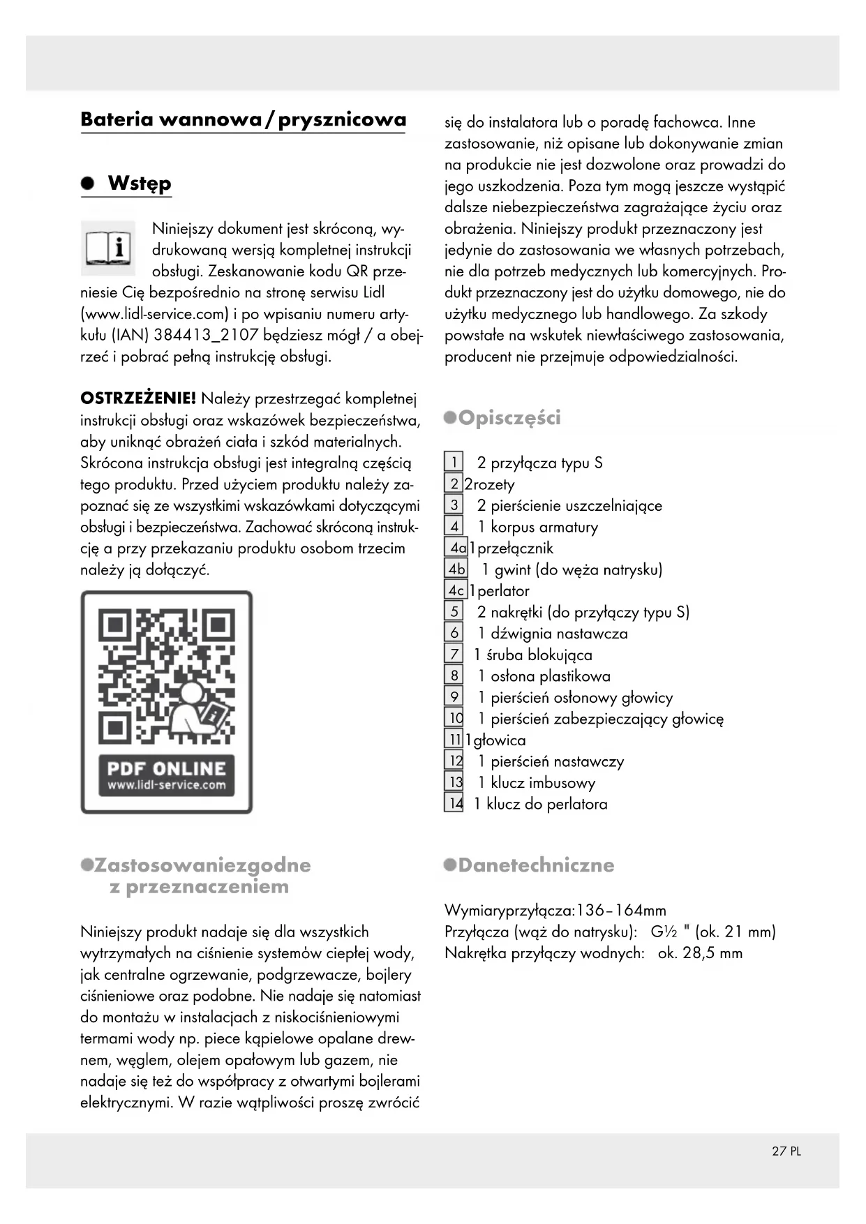 regelmatig eraf en ver- wijder kalkhoudende resten of vreemde voor- werpen. Bij het niet in acht nemen van de onderhoudsin- structies dient u rekening te houden met beschadi- gingen aan het oppervlak. In dit geval komen garantieclaims te vervallen. Informatie Drinkbaarheid van leidingwater Informeer bij uw gemeente over de drinkbaar- heid van het water in uw stad / gemeente. Principieel gelden de volgende adviezen voor de drinkbaarheid van leidingwater: Laat water uit leidingen even lopen wanneer het langer dan vier uur in de leidingen heeft stil gestaan. Gebruik geen stagnatiewater voor het bereiden van voeding en drank, vooral niet voor de voeding van zuigelingen. Anders kan gevaar voor de gezondheid ontstaan. Vers wa- ter kunt u daaraan herkennen dat het duidelijk kouder uit de leiding komt dan stagnatiewater. Gebruik geen stagnatiewater uit verchroomde leidingen voor de voeding en / of lichamelijke verzorging wanneer u allergisch op nikkel reageert. Dergelijk water kan sterk nikkelhou- dend zijn en een allergische reactie veroorza- ken. Gebruik geen drinkwater uit loden leidingen voor de bereiding van voeding voor zuigelingen en / of voor de bereiding van levensmiddelen tijdens het zwangerschap. Lood wordt aan het drinkwater afgegeven en is vooral voor zuige- lingen en kleine kinderen uiterst schadelijk voor de gezondheid.26 PL Wstęp ..............................................................................................................................................Strona 27 Zastosowanie zgodne zprzeznaczeniem .....................................................................................Strona 27 Opis części ....................................................................................................................................... Strona 27 Dane techniczne ..............................................................................................................................Strona 27 Wskazówki dotyczące bezpieczeństwa ........................................................... Strona 28 Montaż ........................................................................................................................................... Strona 28 Instalacja armatury ..........................................................................................................................Strona 28 Przepłukanie armatury .....................................................................................................................Strona 28 Obsługa .........................................................................................................................................Strona 29 Uruchomienie ...................................................................................................................................Strona 29 Przełącznik wypływu wody wanna / natrysk ................................................................................. Strona 29 Funkcja oszczędzania wody ...........................................................................................................Strona 29 Ustawianie ograniczenia temperatury............................................................................................Strona 29 Konserwacja i czyszczenie............................................................................................Strona 30 Pielęgnacja i czyszczenie armatury ................................................................................................Strona 30 Informacje ...................................................................................................................................Strona 30 Zdatność do picia wody wodociągowej .......................................................................................Strona 3027 PL Bateria wannowa / prysznicowa Wstęp Niniejszy dokument jest skróconą, wy- drukowaną wersją kompletnej instrukcji obsługi. Zeskanowanie kodu QR prze- niesie Cię bezpośrednio na stronę serwisu Lidl (www.lidl-service.com) i po wpisaniu numeru arty- kułu (IAN) 384413_2107 będziesz mógł / a obej- rzeć i pobrać pełną instrukcję obsługi. OSTRZEŻENIE! Należy przestrzegać kompletnej instrukcji obsługi oraz wskazówek bezpieczeństwa, aby uniknąć obrażeń ciała i szkód materialnych. Skrócona instrukcja obsługi jest integralną częścią tego produktu. Przed użyciem produktu należy za- poznać się ze wszystkimi wskazówkami dotyczącymi obsługi i bezpieczeństwa. Zachować skróconą instr uk- cję a przy przekazaniu produktu osobom trzecim należy ją dołączyć. Zastosowanie zgodne zprzeznaczeniem Niniejszy produkt nadaje się dla wszystkich wytrzymałych na ciśnienie systemόw ciepłej wody, jak centralne ogrzewanie, podgrzewacze, bojlery ciśnieniowe oraz podobne. Nie nadaje się natomiast do montażu w instalacjach z niskociśnieniowymi termami wody np. piece kąpielowe opalane drew- nem, węglem, olejem opałowym lub gazem, nie nadaje się też do współpracy z otwartymi bojlerami elektrycznymi. W razie wątpliwości proszę zwrócić się do instalatora lub o poradę fachowca. Inne zastosowanie, niż opisane lub dokonywanie zmian na produkcie nie jest dozwolone oraz prowadzi do jego uszkodzenia. Poza tym mogą jeszcze wystąpić dalsze niebezpieczeństwa zagrażające życiu oraz obrażenia. Niniejszy produkt przeznaczony jest jedynie do zastosowania we własnych potrzebach, nie dla potrzeb medycznych lub komercyjnych. Pro- dukt przeznaczony jest do użytku domowego, nie do użytku medycznego lub handlowego. Za szkody powstałe na wskutek niewłaściwego zastosowania, producent nie przejmuje odpowiedzialności. Opis części
