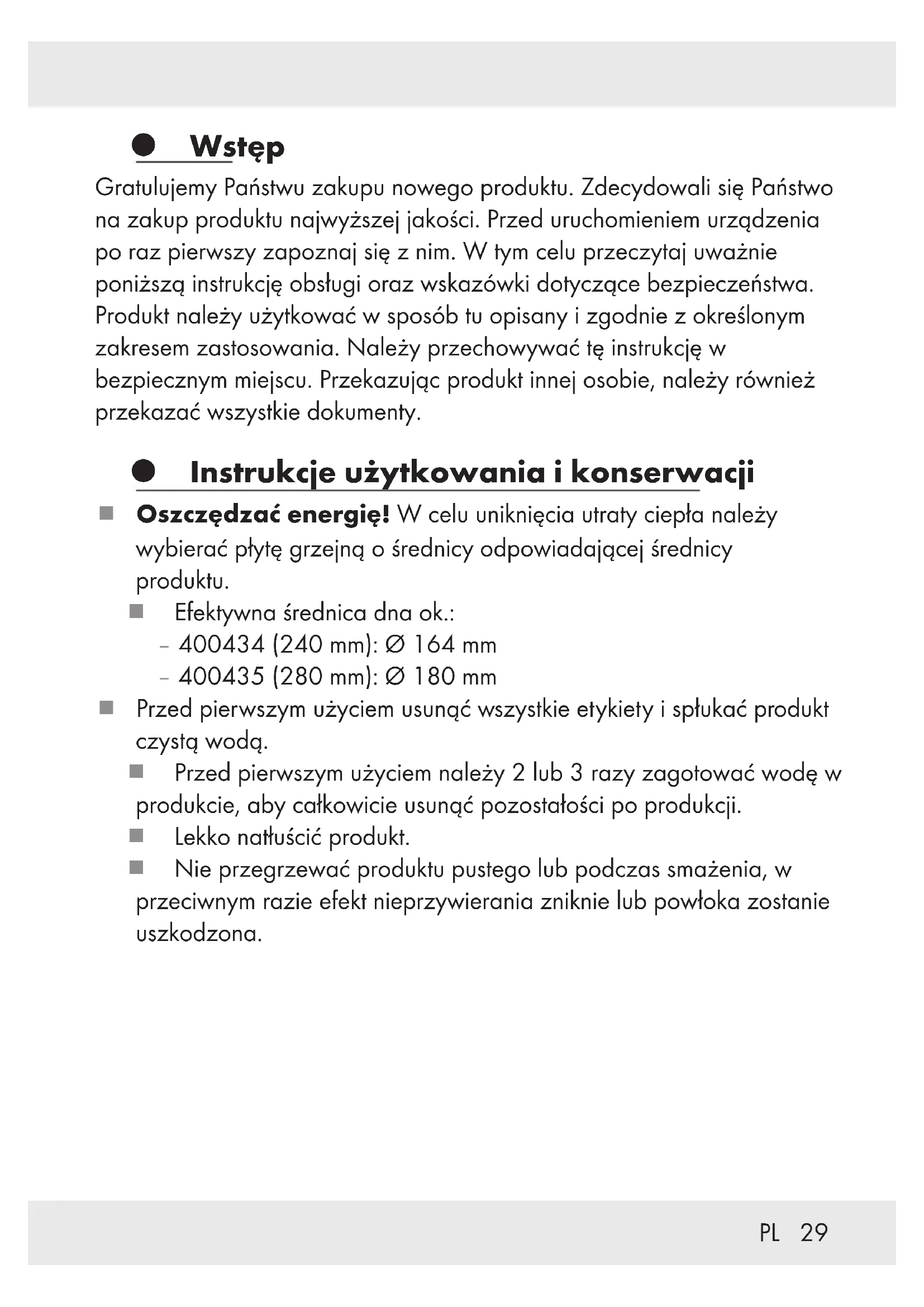 Wstęp Gratulujemy Państwu zakupu nowego produktu. Zdecydowali się Państwo na zakup produktu najwyższej jakości. Przed uruchomieniem urządzenia po raz pierwszy zapoznaj się z nim. W tym celu przeczytaj uważnie poniższą instrukcję obsługi oraz wskazówki dotyczące bezpieczeństwa. Produkt należy użytkować w sposób tu opisany i zgodnie z określonym zakresem zastosowania. Należy przechowywać tę instrukcję w bezpiecznym miejscu. Przekazując produkt innej osobie, należy również przekazać wszystkie dokumenty. Instrukcje użytkowania i konserwacji Oszczędzać energię! W celu uniknięcia utraty ciepła należy wybierać płytę grzejną o średnicy odpowiadającej średnicy produktu. Efektywna średnica dna ok.: – 400434(240mm): Ø164mm – 400435(280mm): Ø180mm Przed pierwszym użyciem usunąć wszystkie etykiety i spłukać produkt czystą wodą. Przed pierwszym użyciem należy 2lub3razy zagotować wodę w produkcie, aby całkowicie usunąć pozostałości po produkcji. Lekko natłuścić produkt. Nie przegrzewać produktu pustego lub podczas smażenia, w przeciwnym razie efekt nieprzywierania zniknie lub powłoka zostanie uszkodzona.30 PL Ryzyko przegrzania! W przypadku przegrzanych naczyń do gotowania, które nie są natłuszczone, nieprzywierająca powłoka może odbarwić się w wyniku spalania białek, gdy wejdzie w kontakt z beztłuszczową żywnością. Te przebarwienia należy traktować jako oznaki użytkowania i nie wpływają one na jakość powłoki ani na jej użyteczność. Potrawę podgrzewać na silnym lub średnim ogniu, a następnie na małym, aby dokończyć gotowanie. Nie zostawiać produktu bez nadzoru, gdy tłuszcz się nagrzewa: Przegrzany tłuszcz może się zapalić. Palącego się tłuszczu nigdy nie gasić wodą! Płomienie zdusić pokrywką od garnka lub grubym, wełnianym kocem. Należy używać wyłącznie przyborów kuchennych z tworzywa sztucznego lub drewna, aby nie uszkodzić powłoki, zapobiegającej przywieraniu. Produktów spożywczych nie wolno kroić bezpośrednio w produkcie. Nie wkładać do produktu ociekającego mokrego mięsa. Tłuszcz pryskający na rozgrzaną płytę grzejną może w łatwy sposób doprowadzić do pożaru. Podczas gotowania uchwyt może się nagrzewać. Używać rękawic do grilla lub rękawic kuchennych. Produkt się do stosowania na kuchennych płytach gazowych, elektrycznych, ceramicznych, indukcyjnych i halogenowych.31PL Uwaga odnośnie płyt indukcyjnych: W określonych okolicznościach mogą pojawić się zakłócenia, które wynikają z właściwości elektromagnetycznych cyrkulacji ciepła między źródłem ciepła i produktem. Jest to zjawisko normalne i nie oznacza uszkodzenia płyty indukcyjnej ani produktu. Produkt należy ustawić po środku płyty indukcyjnej. UWAGA! Duża szybkość nagrzewania! Nie przegrzewać produktu podczas nagrzewania. W przypadku przegrzania produktu pomieszczenie należy porządnie wywietrzyć. Produkt ten łączy w sobie zalety naczyń aluminiowych, takie jak niska waga i wysoka przewodność cieplna, z zaletami gotowania indukcyjnego. W tym celu w aluminiowym dnie umieszczono magnetyczne elementy stalowe. Zatem dno nie jest w całości magnetyczne, więc może współpracować ze płytami indukcyjnymi o znacznie większej średnicy bez wzbudzania cewek indukcyjnych. Nie jest to wada jakości wykonania i nie jest przeszkoda w funkcjonowaniu produktu. W celu zapewnienia prawidłowego działania produktu należy zawsze umieszczać go na płycie grzejnej, która odpowiada efektywnej średnicy podstawy określonej w niniejszej instrukcji. Wysokie temperatury mogą powodować przebarwienia na zewnątrz produktu. Nie jest to wada materiałowa i nie wpływa na jakość ani działanie produktu. Nigdy nie wkładać gorącego produktu pod bieżącą, zimną wodę. Dno produktu może ulec uszkodzeniu lub może odpaść.32 PL Produkt nadaje się do przechowywania żywności w piekarniku w celu podtrzymywania ciepła (maks.160°C przez1godzinę). Produkt można myć w zmywarce. W przypadku mycia ręcznego używać ciepłej wody i zwykłego detergentu. Należy unikać używania jakichkolwiek ostrych narzędzi, aby nie uszkodzić materiału. Podczas czyszczenia nie używać żadnych ostrych materiałów ściernych. Częste czyszczenie ostrymi detergentami może uszkodzić i / lub odbarwić produkt. Mycie w zmywarce może powodować odbarwienia elementów aluminiowych. UWAGA! ZARYSOWANIA! Unikać szurania produktem po ceramicznej płycie grzejnej! Przed rozpoczęciem gotowania zaleca się przetarcie powierzchni płyty grzejnej i dna produktu czystą, niestrzępiącą się szmatką (np.z mikrofibry). W ten sposób można zapobiec zadrapaniom. Bezpieczna żywność: Produkt nie wpływa na smak ani zapach przygotowywanych potraw. Nie używać produktu, gdy uchwyt jest luźny. Ewentualnie dokręcić poluzowane złącza śrubowe. Utylizacja Opakowanie wykonane jest z materiałów przyjaznych dla środowiska, które można przekazać do utylizacji w lokalnym punkcie przetwarzania surowców wtórnych. Informacji na temat możliwości utylizacji wyeksploatowanego produktu udziela urząd gminy lub miasta.33PL Gwarancja Produkt wyprodukowano według wysokich standardów jakości i poddano skrupulatnej kontroli przed wysyłką. W przypadku wad produktu nabywcy przysługują ustawowe prawa. Gwarancja nie ogranicza ustawowych praw nabywcy produktu. Produkt objęte jest 3 gwarancją, licząc od daty zakupu. Gwarancja wygasa w razie zawinionego przez użytkownika uszkodzenia produktu, niewłaściwego użycia lub konserwacji. W przypadku wystąpienia w ciągu 3 lat od daty zakupu wad materiałowych lub fabrycznych, dokonujemy – według własnej oceny – bezpłatnej naprawy lub wymiany produktu. Świadczenie gwarancyjne obejmuje wady materiałowe i fabryczne. Gwarancja nie obejmuje części produktu ulegających normalnemu zużyciu, uznawanych za części zużywalne (np. baterie) oraz u