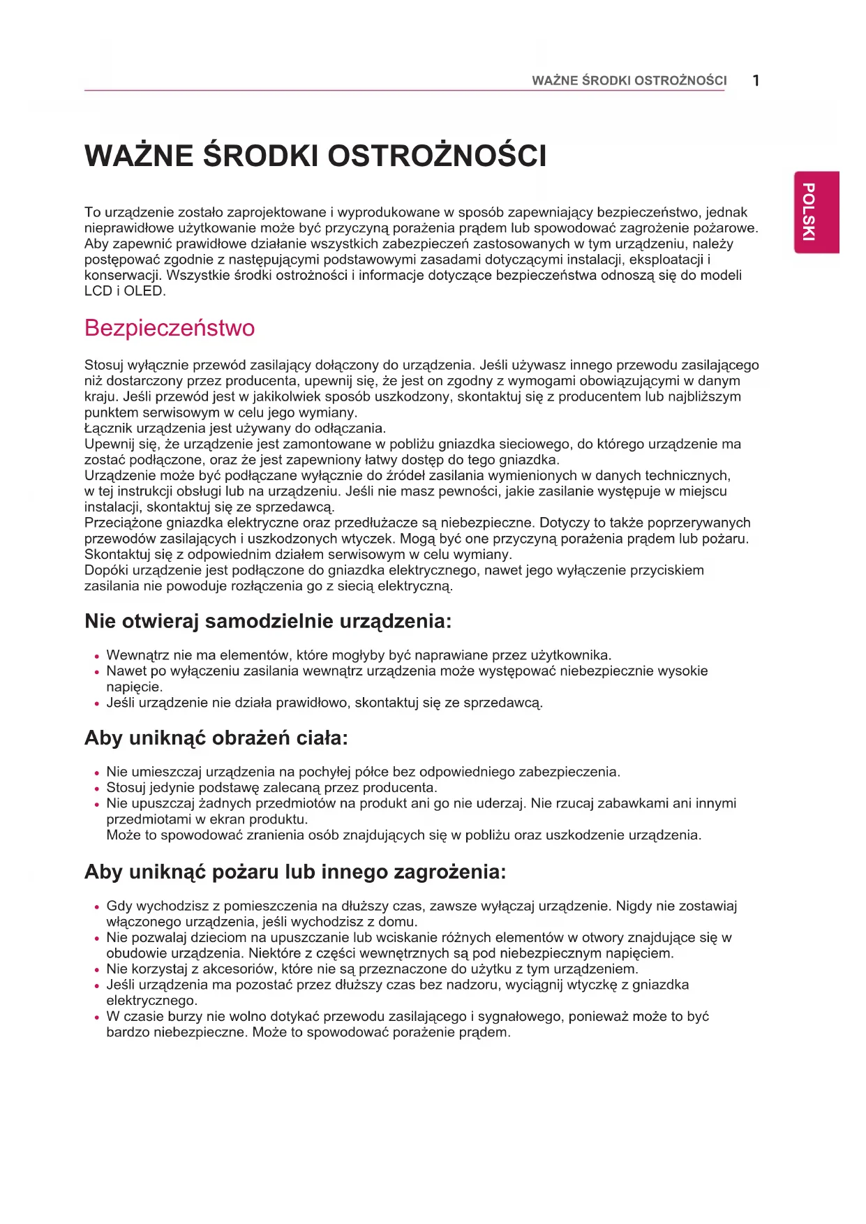 ÁGUA VANN kJeMikAlier1 ENG POLSKI To urządzenie zostało zaprojektowane i wyprodukowane w sposób zapewniający bezpieczeństwo, jednak nieprawidłowe użytkowanie może być przyczyną porażenia prądem lub spowodować zagrożenie pożarowe.Aby zapewnić prawidłowe działanie wszystkich zabezpieczeń zastosowanych w tym urządzeniu, należy postępować zgodnie z następującymi podstawowymi zasadami dotyczącymi instalacji, eksploatacji i konserwacji. Wszystkie środki ostrożności i informacje dotyczące bezpieczeństwa odnoszą się do modeli LCD i OLED. Bezpieczeństwo Stosuj wyłącznie przewód zasilający dołączony do urządzenia. Jeśli używasz innego przewodu zasilającego niż dostarczony przez producenta, upewnij się, że jest on zgodny z wymogami obowiązującymi w danym kraju. Jeśli przewód jest w jakikolwiek sposób uszkodzony, skontaktuj się z producentem lub najbliższym punktem serwisowym w celu jego wymiany.Łącznik urządzenia jest używany do odłączania. Upewnij się, że urządzenie jest zamontowane w pobliżu gniazdka sieciowego, do którego urządzenie ma zostać podłączone, oraz że jest zapewniony łatwy dostęp do tego gniazdka.Urządzenie może być podłączane wyłącznie do źródeł zasilania wymienionych w danych technicznych, w tej instrukcji obsługi lub na urządzeniu. Jeśli nie masz pewności, jakie zasilanie występuje w miejscu instalacji, skontaktuj się ze sprzedawcą.Przeciążone gniazdka elektryczne oraz przedłużacze są niebezpieczne. Dotyczy to także poprzerywanych przewodów zasilających i uszkodzonych wtyczek. Mogą być one przyczyną porażenia prądem lub pożaru.Skontaktuj się z odpowiednim działem serwisowym w celu wymiany.Dopóki urządzenie jest podłączone do gniazdka elektrycznego, nawet jego wyłączenie przyciskiem zasilania nie powoduje rozłączenia go z siecią elektryczną.