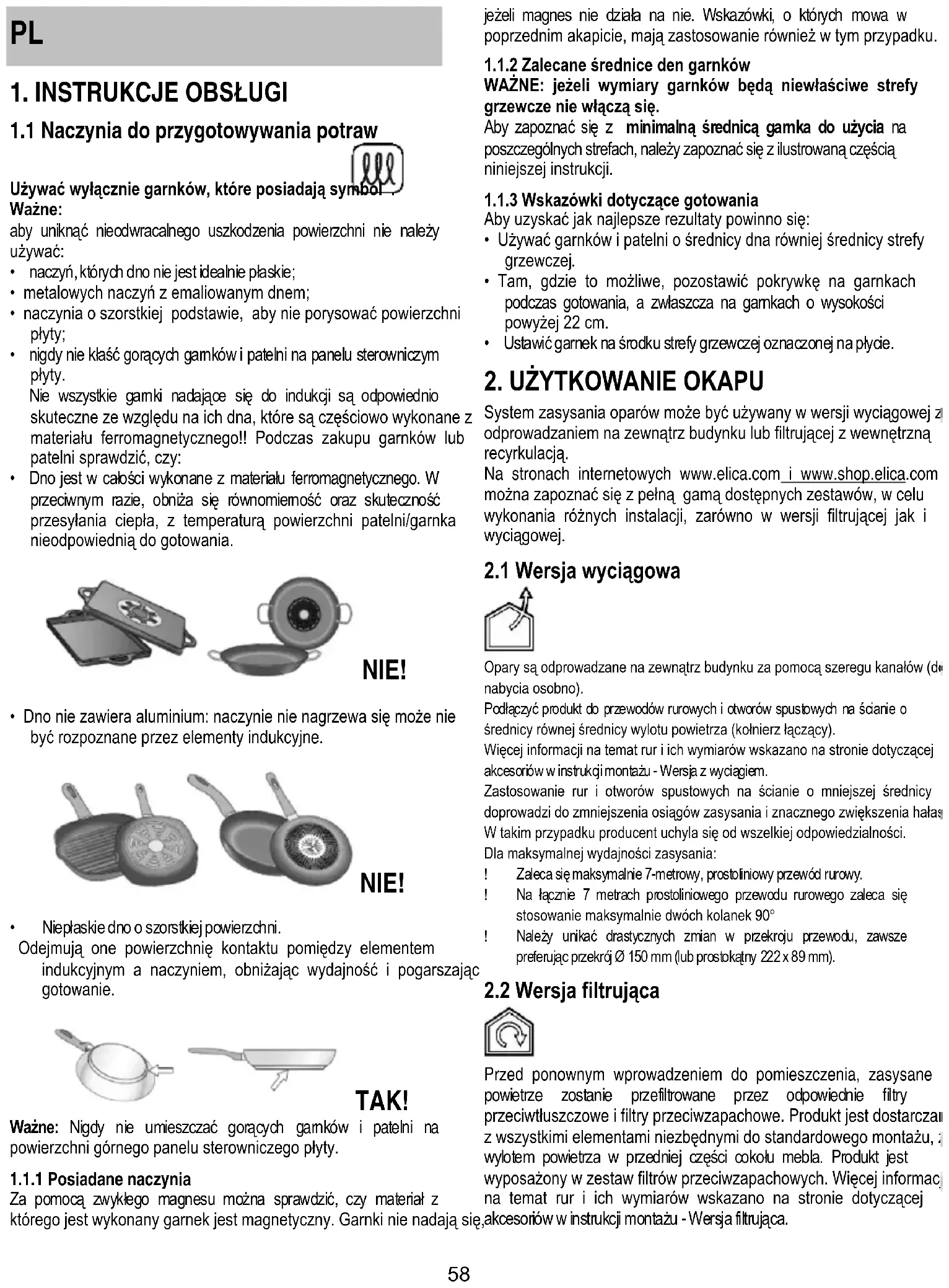 System zasysania oparów może być używany w wersji wyciągowej z odprowadzaniem na zewnątrz budynku lub filtrującej z wewnętrzną recyrkulacją. Na stronach internetowych www.elica.com i www.shop.elica.com można zapoznać się z pełną gamą dostępnych zestawów, w celu wykonania różnych instalacji, zarówno w wersji filtrującej jak i wyciągowej.