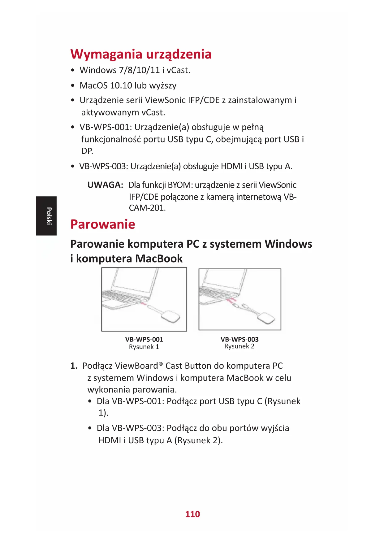 - VB-WPS-003: Urządzenie(a) obsługuje HDMI i USB typu A. UWAGA:ᅠ Dla funkcji BYOM: urządzenie z serii ViewSonic IFP/CDE połączone z kamerą internetową VB- CAM-201. Parowanie Parowanie komputera PC z systemem Windows i komputera MacBook VB-WPS-001 Rysunek 1 VB-WPS-003 Rysunek 2