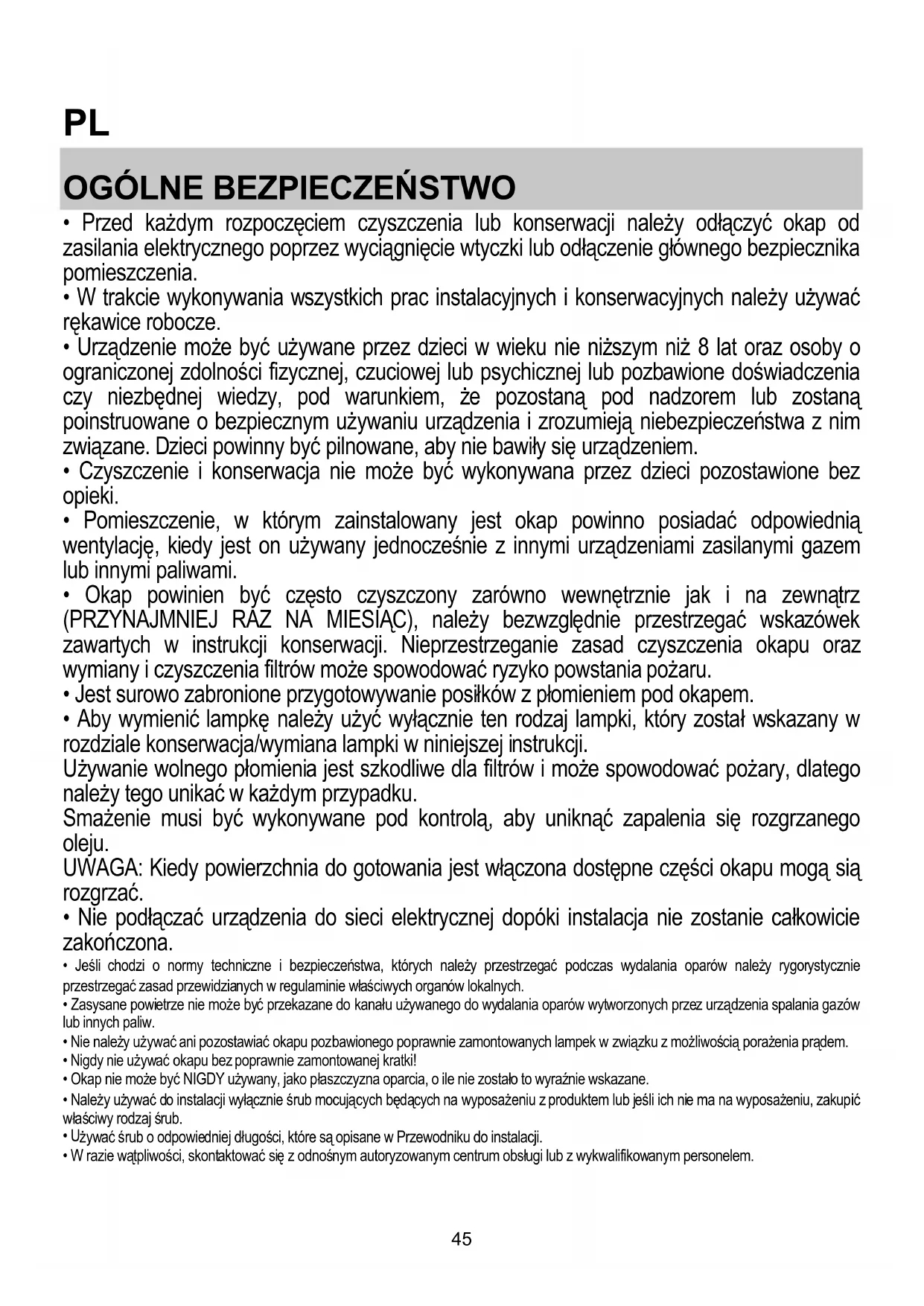 - Okap powinien być często czyszczony zarówno wewnętrznie jak i na zewnątrz (PRZYNAJMNIEJ RAZ NA MIESIĄC), należy bezwzględnie przestrzegać wskazówek zawartych w instrukcji konserwacji. Nieprzestrzeganie zasad czyszczenia okapu oraz wymiany i czyszczenia filtrów może spowodować ryzyko powstania pożaru.