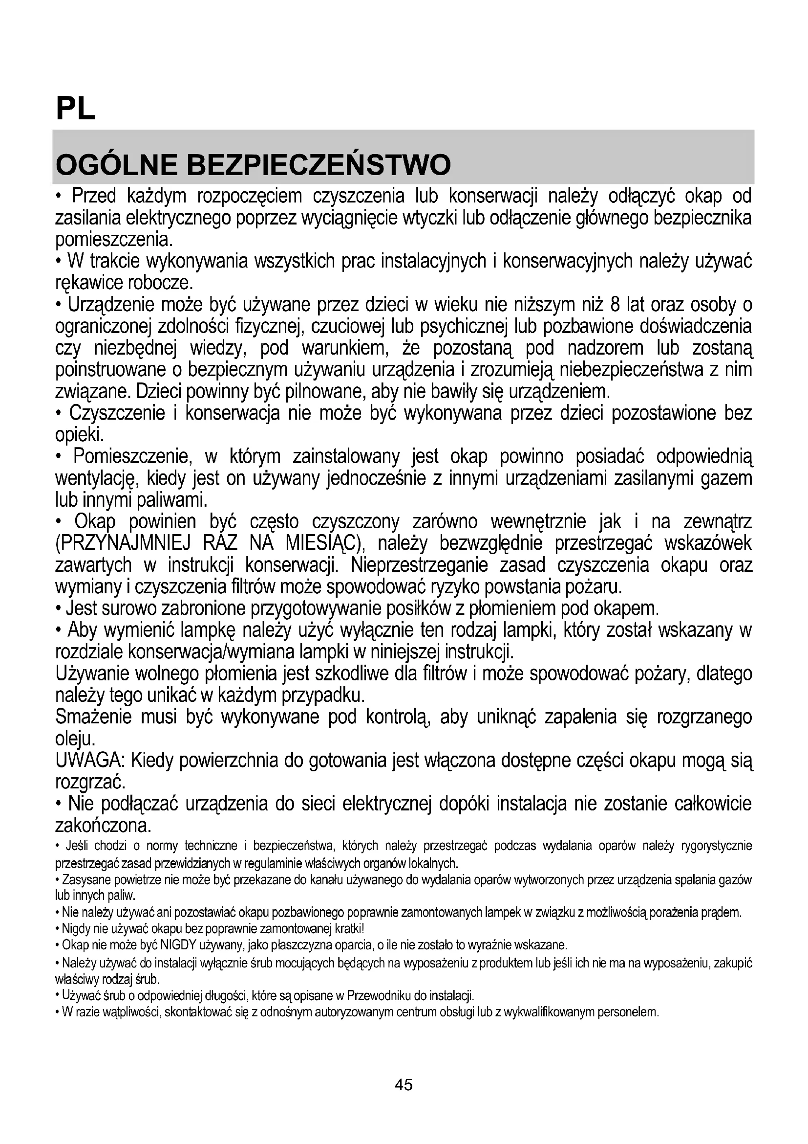 - Okap powinien być często czyszczony zarówno wewnętrznie jak i na zewnątrz (PRZYNAJMNIEJ RAZ NA MIESIĄC), należy bezwzględnie przestrzegać wskazówek zawartych w instrukcji konserwacji. Nieprzestrzeganie zasad czyszczenia okapu oraz wymiany i czyszczenia filtrów może spowodować ryzyko powstania pożaru.