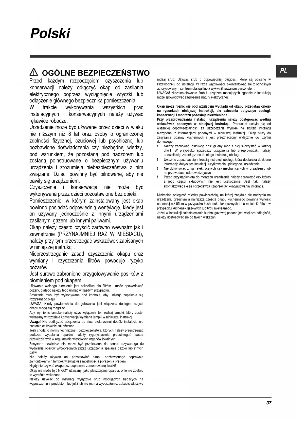 Przed każdym rozpoczęciem czyszczenia lub konserwacji należy odłączyć okap od zasilania elektrycznego poprzez wyciągnięcie wtyczki lub odłączenie głównego bezpiecznika pomieszczenia. W trakcie wykonywania wszystkich prac instalacyjnych i konserwacyjnych należy używać rękawice robocze. Urządzenie może być używane przez dzieci w wieku nie niższym niż 8 lat oraz osoby o ograniczonej zdolności fizycznej, czuciowej lub psychicznej lub pozbawione doświadczenia czy niezbędnej wiedzy, pod warunkiem, że pozostaną pod nadzorem lub zostaną poinstruowane o bezpiecznym używaniu urządzenia i zrozumieją niebezpieczeństwa z nim związane. Dzieci powinny być pilnowane, aby nie bawiły się urządzeniem. Czyszczenie i konserwacja nie może być wykonywana przez dzieci pozostawione bez opieki. Pomieszczenie, w którym zainstalowany jest okap powinno posiadać odpowiednią wentylację, kiedy jest on używany jednocześnie z innymi urządzeniami zasilanymi gazem lub innymi paliwami. Okap należy często czyścić zarówno wewnątrz jak i zewnętrznie (PRZYNAJMNIEJ RAZ W MIESIĄCU), należy przy tym przestrzegać wskazówek zapisanych w niniejszej instrukcji. Nieprzestrzeganie zasad czyszczenia okapu oraz wymiany i czyszczenia filtrów powoduje ryzyko pożarów. Jest surowo zabronione przygotowywanie posiłków z płomieniem pod okapem. Używanie wolnego płomienia jest szkodliwe dla filtrów i może spowodować pożary, dlatego należy tego unikać w każdym przypadku. Smażenie musi być wykonywane pod kontrolą, aby uniknąć zapalenia się rozgrzanego oleju. UWAGA: Kiedy powierzchnia do gotowania jest włączona dostępne części okapu mogą sią rozgrzać. Aby wymienić lampkę należy użyć wyłącznie ten rodzaj lampki, który został wskazany w rozdziale konserwacja/wymiana lampki w niniejszej instrukcji. Uwaga! Nie podłączać urządzenia do sieci elektrycznej dopóki instalacja nie zostanie całkowicie zakończona. Jeśli chodzi o normy techniczne i bezpieczeństwa, których należy przestrzegać podczas wydalania oparów należy rygorystycznie przestrzegać zasad przewidzianych w regulaminie właściwych organów lokalnych. Zasysane powietrze nie może być przekazane do kanału uż ywanego do wydalania oparów wytworzonych przez urządzenia spalania gazów lub innych paliw. Nie należy używać ani pozostawiać okapu pozbawionego poprawnie zamontowanych lampek w związku z możliwością porażenia prądem. Nigdy nie używać okapu bez poprawnie zamontowanej kratki! Okap nie może być NIGDY używany, jako płaszczyzna oparcia, o ile nie zostało to wyraźnie wskazane. Należy używać do instalacji wyłącznie śrub mocujących będących na wyposażeniu z produktem lub jeśli ich nie ma na wyposażeniu, zakupić właściwy rodzaj śrub. Używać śrub o odpowiedniej długości, które są opisane w Przewodniku do instalacji. W razie wątpliwości, skontaktować się z odno śnym autoryzowanym centrum obsługi lub z wykwalifikowanym personelem. UWAGA! Niezainstalowanie śrub i urządzeń mocujących zgodnie z instrukcją może spowodować zagrożenia natury elektrycznej. Okap może różnić się pod względem wyglądu od okapu przedstawionego na rysunkach niniejszej instrukcji, ale zalecenia dotyczące obsługi, konserwacji i montażu pozostają niezmienione. Przy przeprowadzaniu instalacji urządzenia należy postępować według wskazówek podanych w niniejszej instrukcji. Producent uchyla się od wszelkiej odpowiedzialności za uszkodzenia wynikłe na skutek instalacji niezgodnej z informacjami podanymi w niniejszej instrukcji. Okap służy do zasysania oparów kuchennych i jest przeznaczony wyłącznie do użytku domowego. ! Należy zachować instrukcję obsługi aby móc z niej skorzystać w każdej chwili. W przypadku sprzedaży urządzenia lub przeprowadzki, należy upewnić si ę, że dołączono do niego instrukcję obsługi. ! Uważnie zapoznać się z treścią instrukcji obsługi, która dostarcza dokładne informacje dotyczące instalacji, użytkowania i pielęgnacji urządzenia.. ! Nie dokonywać zmian elektrycznych czy mechanicznych w urządzeniu lub na przewodach odprowadzających. ! Przed przystąpieniem do montażu urządzenia należy sprawdzić czy któraś z jego części składowych nie jest uszkodzona. Jeśli tak, należy skontaktować się ze sprzedawcą i zaprzestać kontynuowania instalacji. Minimalna odległość między powierzchnią, na której znajdują się naczynia na urządzeniu grzejnym a najniższą częścią okapu kuchennego powinna wynosić nie mniej niż 55cm w przypadku kuchenek elektrycznych i nie mniej niż 65cm w przypadku kuchenek gazowych lub typu mieszanego. Jeżeli w instrukcji zainstalowania kuchni gazowej podana jest większa odległość, należy dostosować się do takich wskazań.38