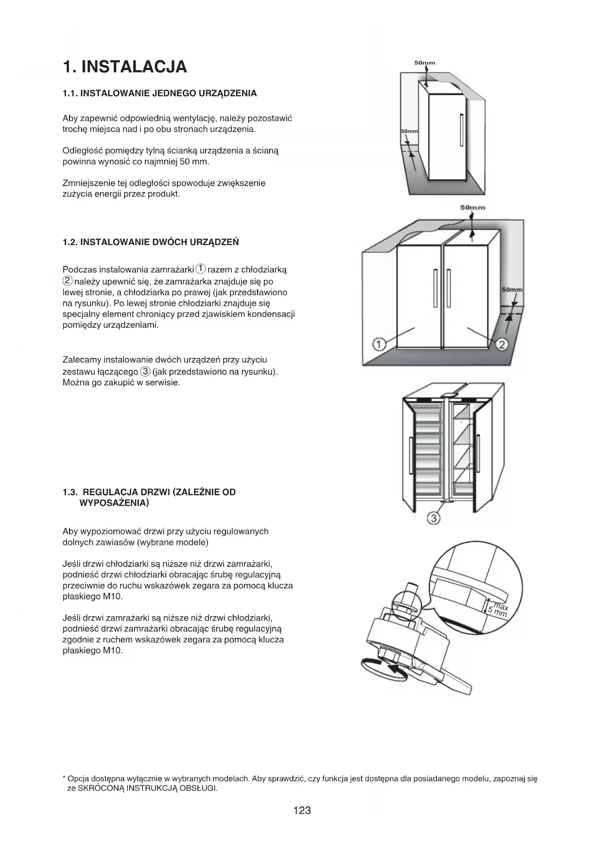 WYPOSAŻENIA) Abywypoziomowaćdrzwiprzyużyciuregulowanych dolnychzawiasów(wybranemodele) Jeślidrzwichłodziarkisąniższeniżdrzwizamrażarki, podnieśćdrzwichłodziarkiobracającśrubęregulacyjną przeciwniedoruchuwskazówekzegarazapomocąklucza płaskiegoM10. Jeślidrzwizamrażarkisąniższeniżdrzwichłodziarki, podnieśćdrzwizamrażarkiobracającśrubęregulacyjną zgodniezruchemwskazówekzegarazapomocąklucza płaskiegoM10. *Opcjadostępnawyłączniewwybranychmodelach.Abysprawdzić,czyfunkcjajestdostępnadlaposiadanegomodelu,zapoznajsię zeSKRÓCONĄINSTRUKCJĄOBSŁUGI. 50mm 50mm 5 mm max124