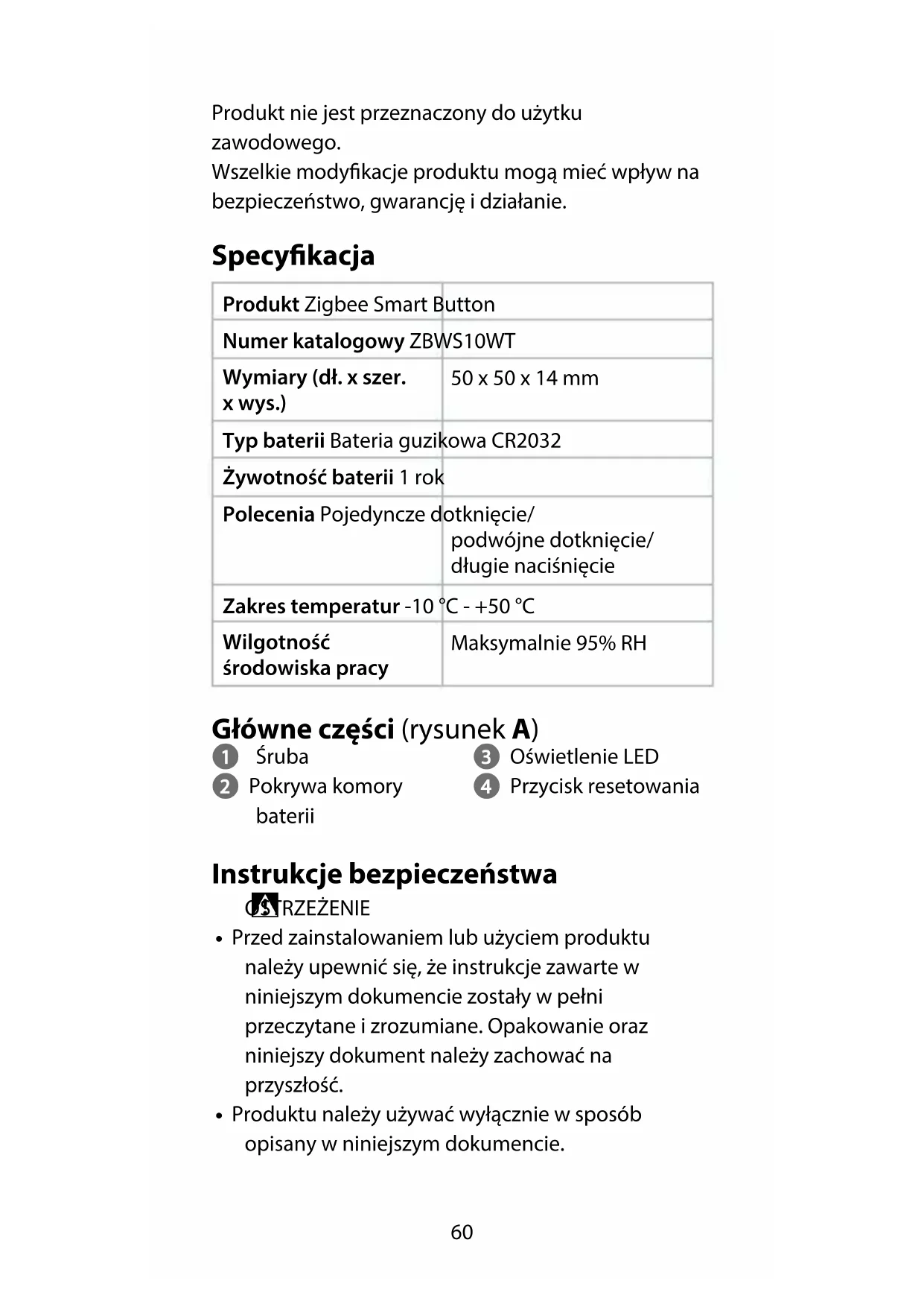 Przewodnik Szybki start Zigbee Smart Button ZBWS10WT Przeznaczenie Urządzenie Nedis ZBWS10WT to bezprzewodowy, zasilany bateriami inteligentny przycisk.Za pomocą tego przycisku można sterować powiązanymi produktami z linii Nedis SmartLife.Produkt można połączyć bezprzewodowo z aplikacją Nedis SmartLife za pośrednictwem bramki Zigbee.Przycisk obsługuje trzy różne polecenia: pojedyncze dotknięcie, podwójne dotknięcie i długie naciśnięcie.Po połączeniu produktu z aplikacją można powiązać trzy polecenia urządzenia Zigbee Wireless Wall Switch z innymi produktami Nedis SmartLife i nimi sterować.Produkt jest przeznaczony wyłącznie do użytku wewnątrz pomieszczeń.60 Produkt nie jest przeznaczony do użytku zawodowego. Wszelkie modykacje produktu mogą mieć wpływ na bezpieczeństwo, gwarancję i działanie. Specykacja Produkt Zigbee Smart Button Numer katalogowy ZBWS10WT Wymiary (dł. x szer. x wys.) 50 x 50 x 14 mm Typ baterii Bateria guzikowa CR2032 Żywotność baterii 1 rok Polecenia Pojedyncze dotknięcie/ podwójne dotknięcie/ długie naciśnięcie Zakres temperatur -10 °C - +50 °C Wilgotność środowiska pracy Maksymalnie 95% RH Główne części (rysunek A) 1 Śruba 2 Pokrywa komory baterii 3 Oświetlenie LED 4 Przycisk resetowania Instrukcje bezpieczeństwa