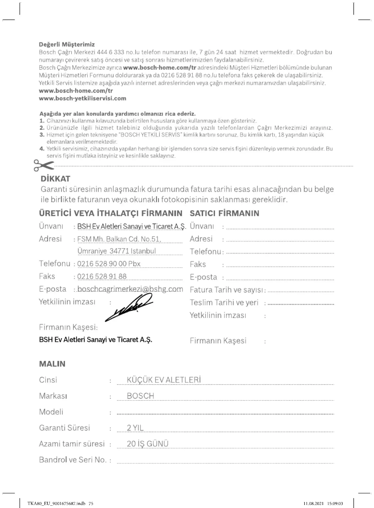Urzadzenie objete gwarancja. Dystrybutor/ gwarant: BSH Sprzej Gospodarstwa Domowego Sp. z o.o., Al. Jerozolimskie 183, 02-222 Warszawa. Czas trwania gwarancji: 24 miesiace od wydania rzeczy pierwszemu kupujacemu. Terytoralny zasięg ochrony gwarancyjnej: Polska. Konieczny dowód zakupy. Uprawnienia przyślugujiange kupujacemu: usuniȩcie wady fizycznej, a sąželi to nie jest moziwie - dostarczenia rzeczy wolnej od wady. Gwarancja nie wyłącza, nie agranicza ani nie zwiesza uprawnien kupujacego wynikajacych z przypeś ow o rkojmi za wady rzeczy sprźedanej. Dalsza tresć oswiadczenia gwarancyjngo (wraz z wyłączeniami z napraw gwarancyjnych) dostepna na stronie internetowej: www.bosch-home.pl/gwarancja. Gwarant udostepni tresć oswiadczenia gwarancyjngo rownikę na piąmie lub e-mailem - w tymelu oraz welu skorzystania z uprawnien z gwarancji prosimy o kontakt z infolinian: +48 42 271 5555 (opłata wg. stawek operatora).